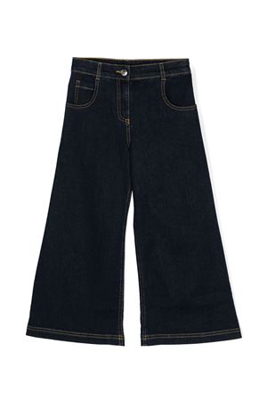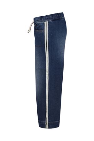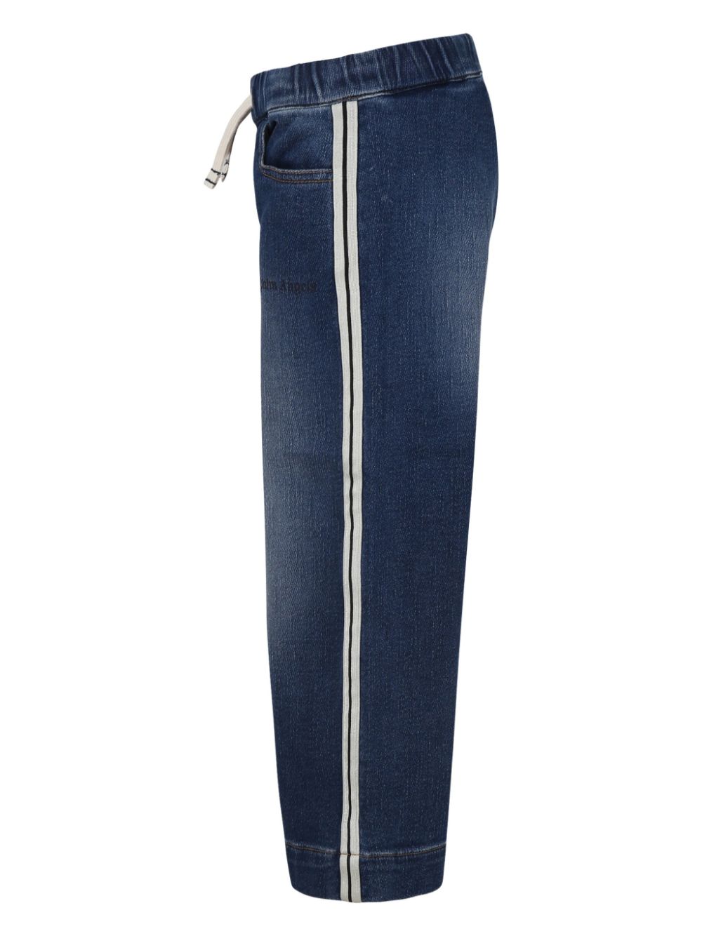 Blu indaco, misto cotone, denim, lavaggio scuro, elastico in vita con coulisse, rifiniture a righe, due tasche laterali a filetto, stampa del logo sulla gamba, gamba larga