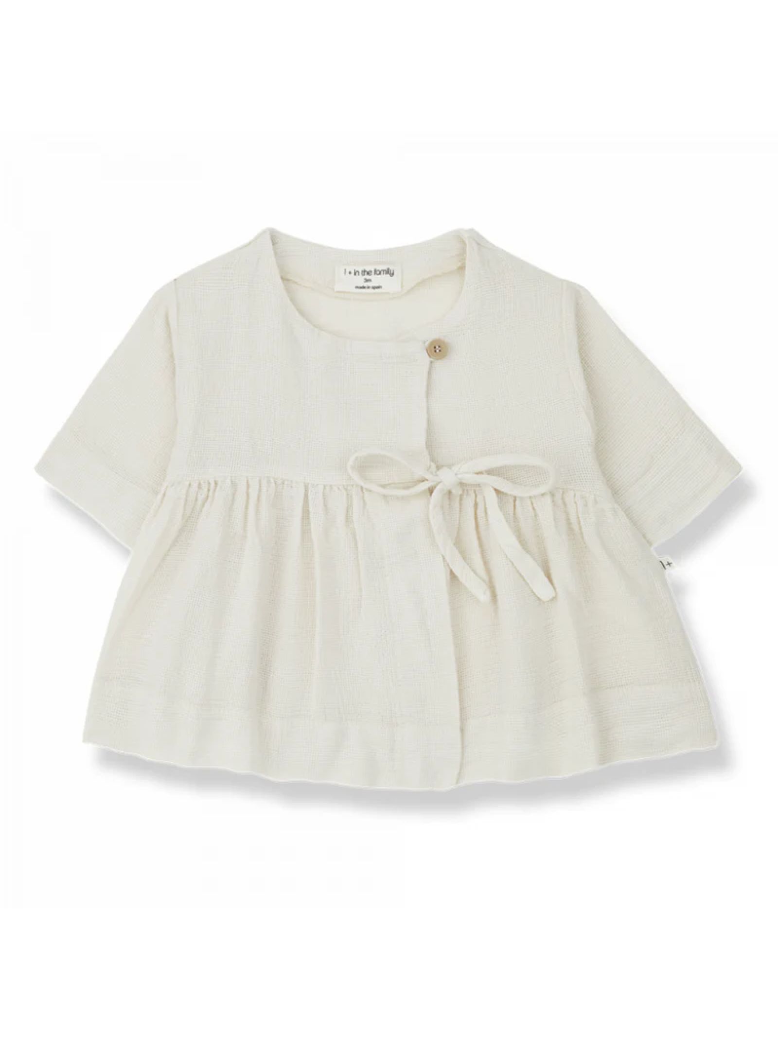 Beige cotton Scarlett dress with drawstring waist closure, short sleeve with lapels, button closure at neck height, ruched cut