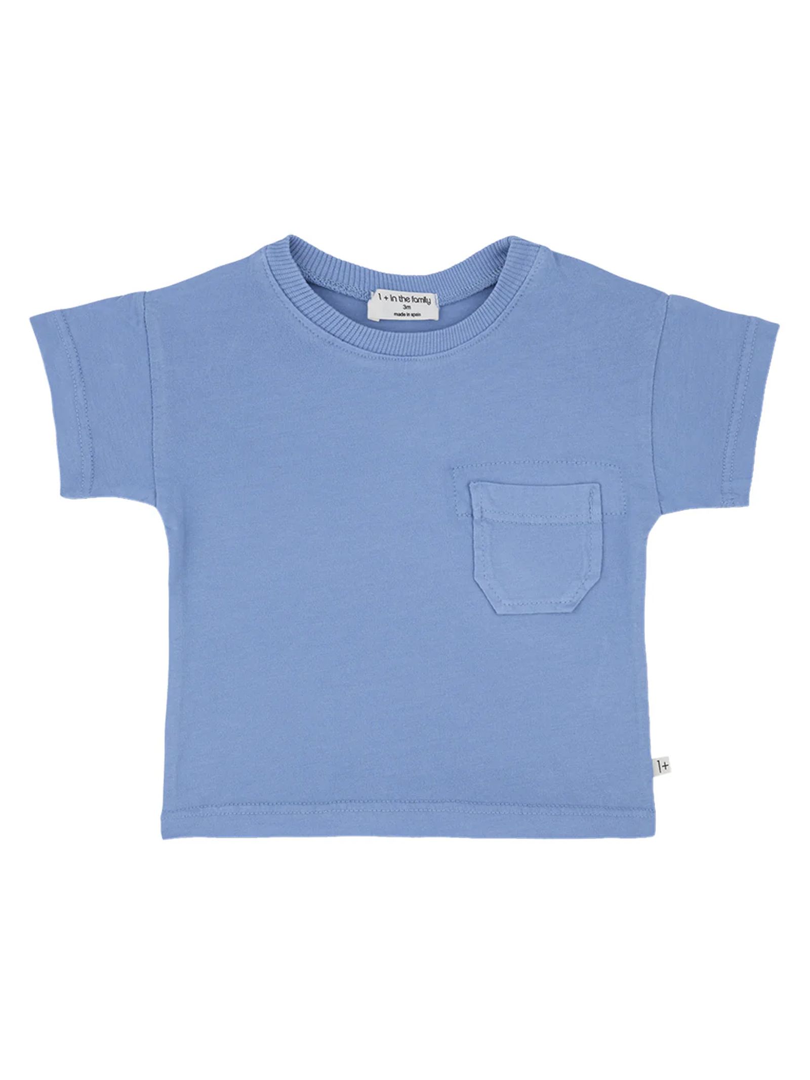 Blue cotton T-shirt, soft and comfortable fabric, ribbed collar, T-shaped sleeves for a looser fit, chest pocket on the left side with decorative stitching