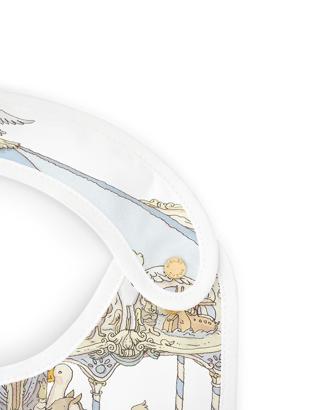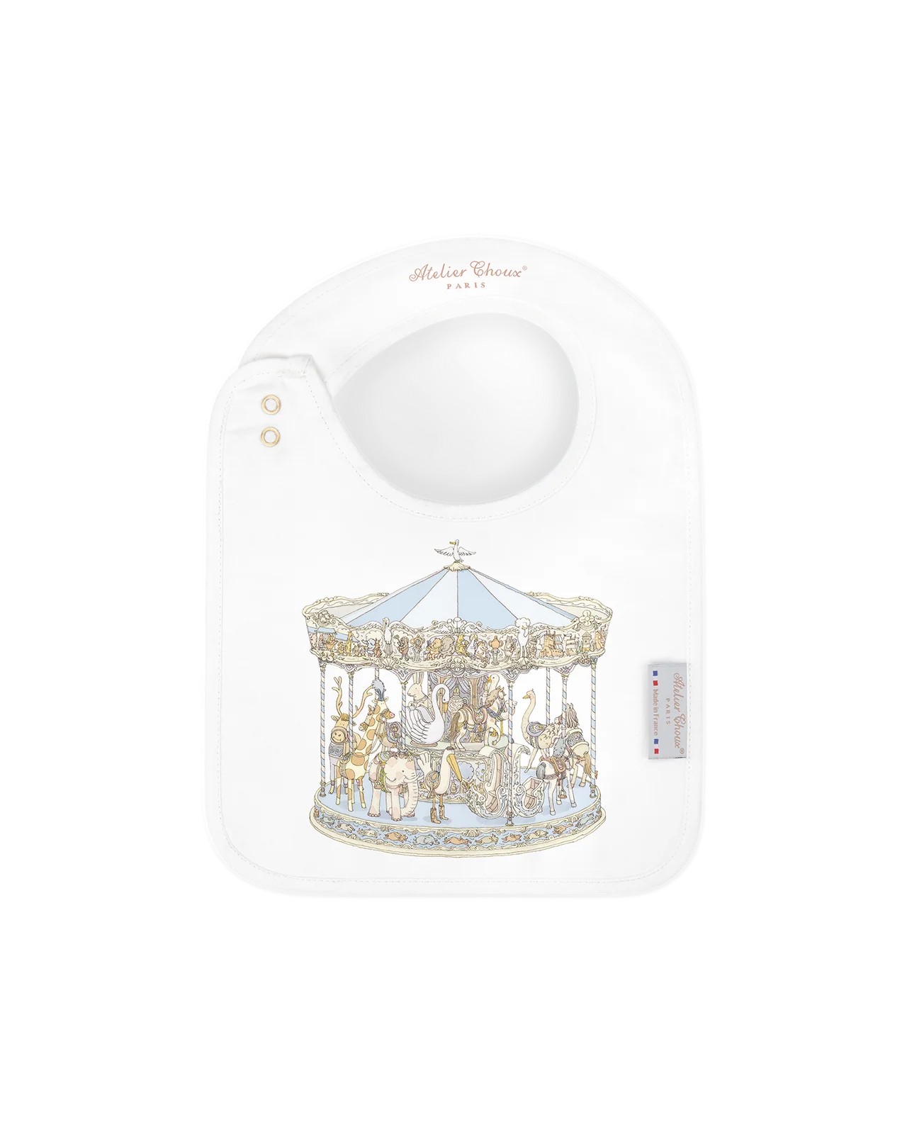 Atelier Choux Satin Bib Carousel Blue is a stylish essential that brings refinement to mealtimes, teething moments, and days on the go. Ideal for protecting delicate outfits, catching little spills, or adding a chic touch to any look, it offers elegance and practicality all day long.Reversible and adorned with original illustrations on both sides, the Atelier Choux bib blends practicality with artistic charm. The bib is adjustable and features branded golden snaps. Recommended from birth to 24 months.