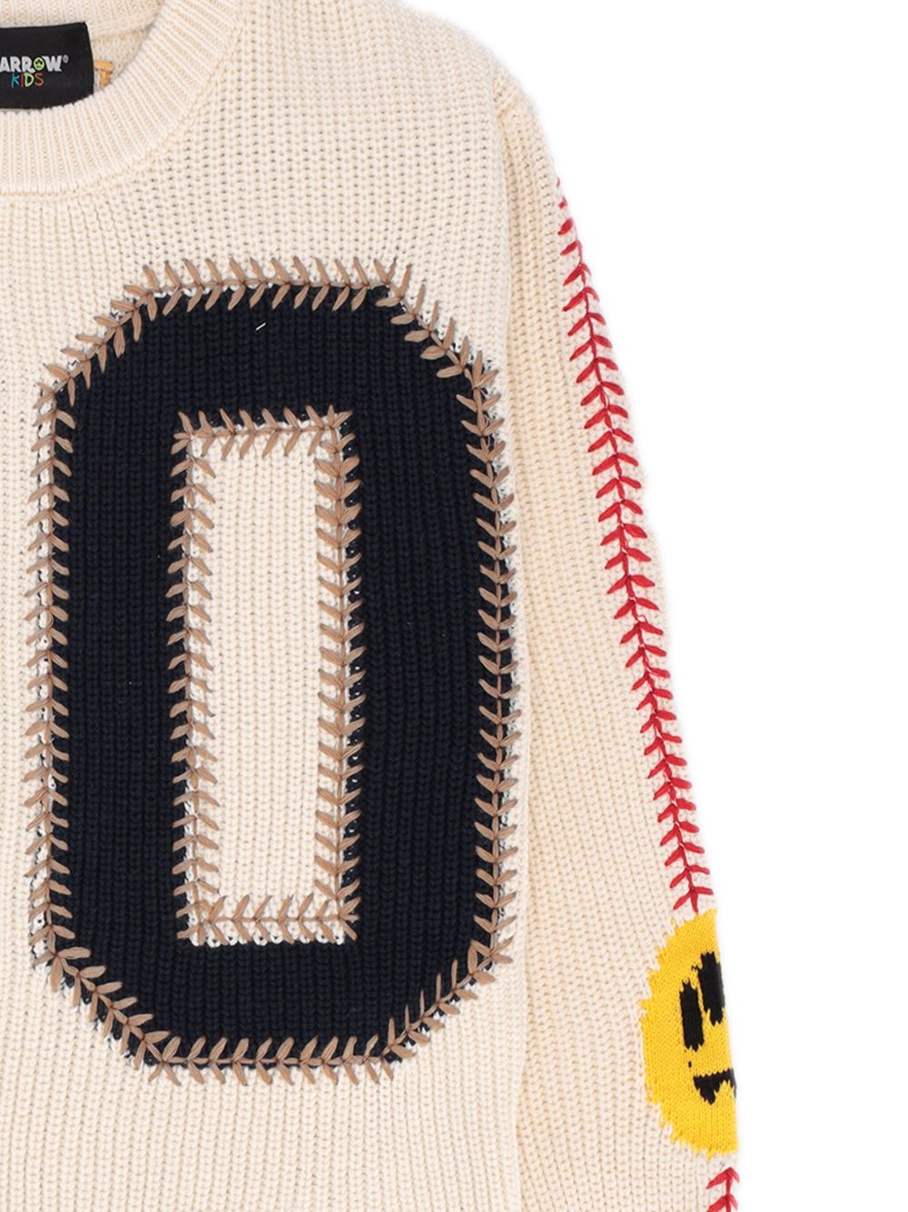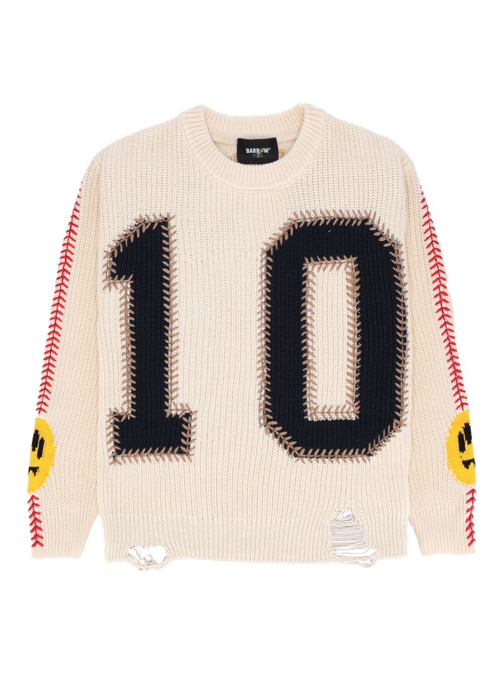 cream number applique baseball stitch detail smiley face embroidery distressed hem ribbed cuffs