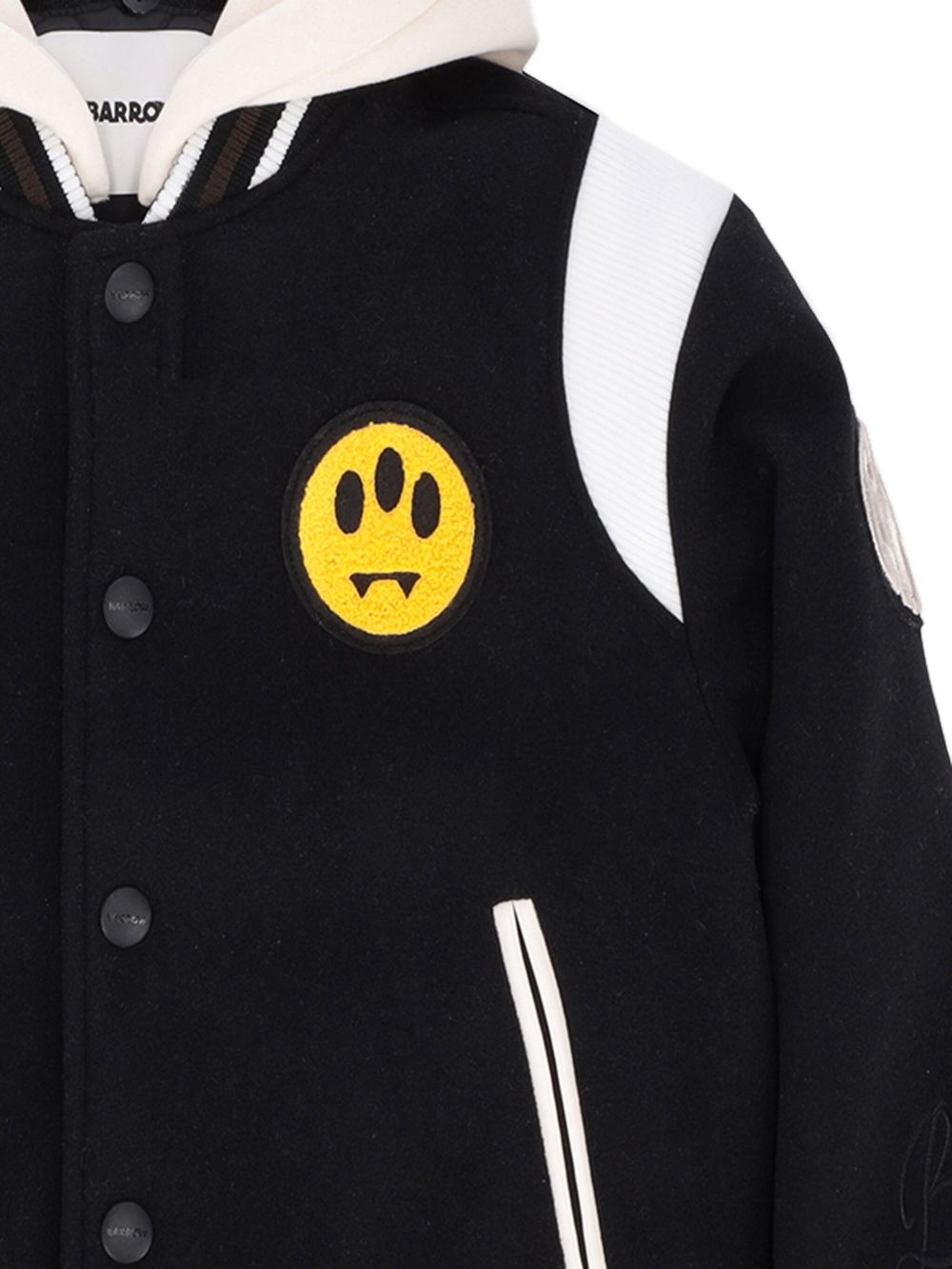 black off-white hood varsity sleeves embroidered logo appliqué patches button fastening