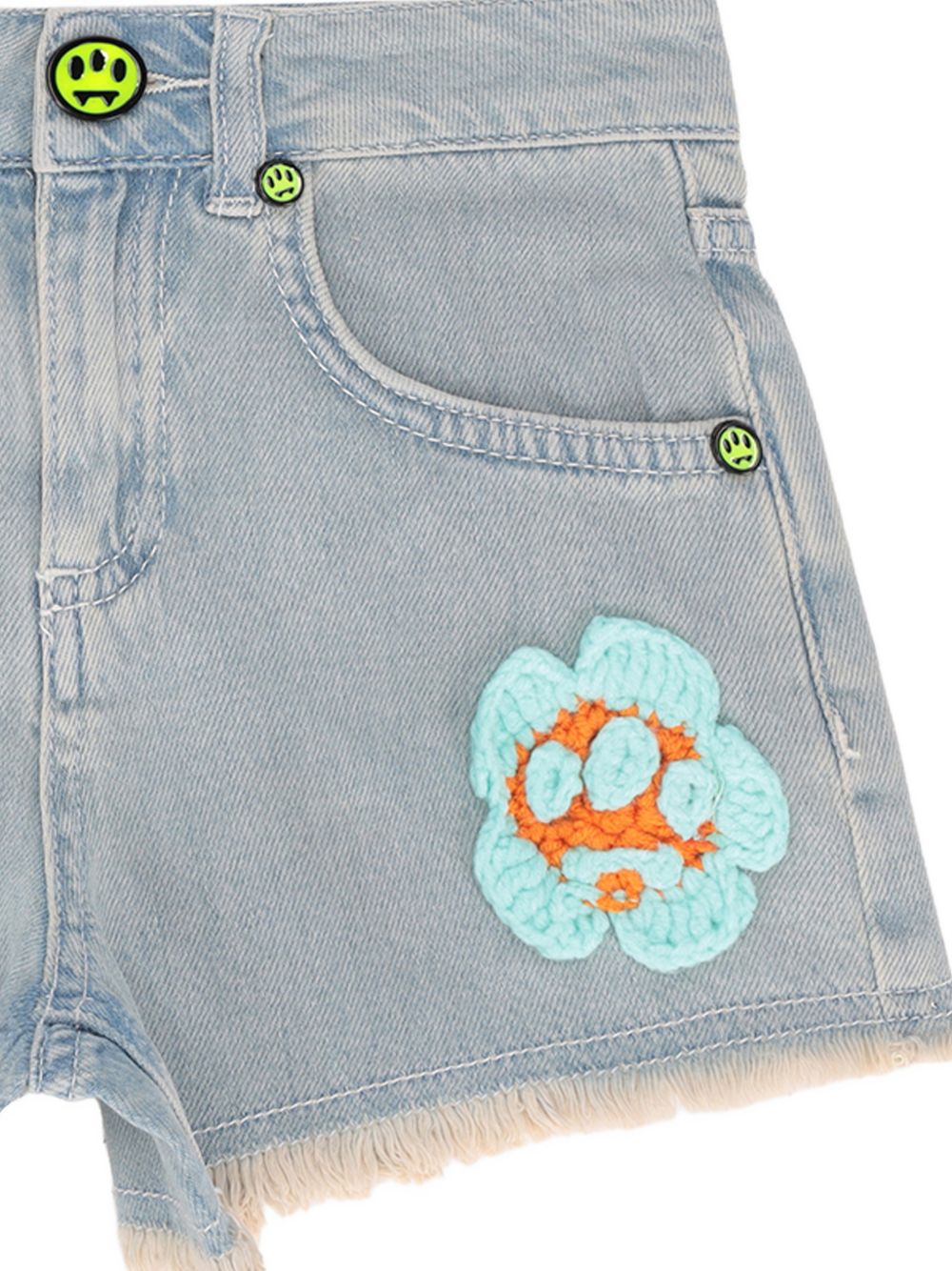 light blue and multicolour frayed hem appliqué button fastening five pockets belt loops