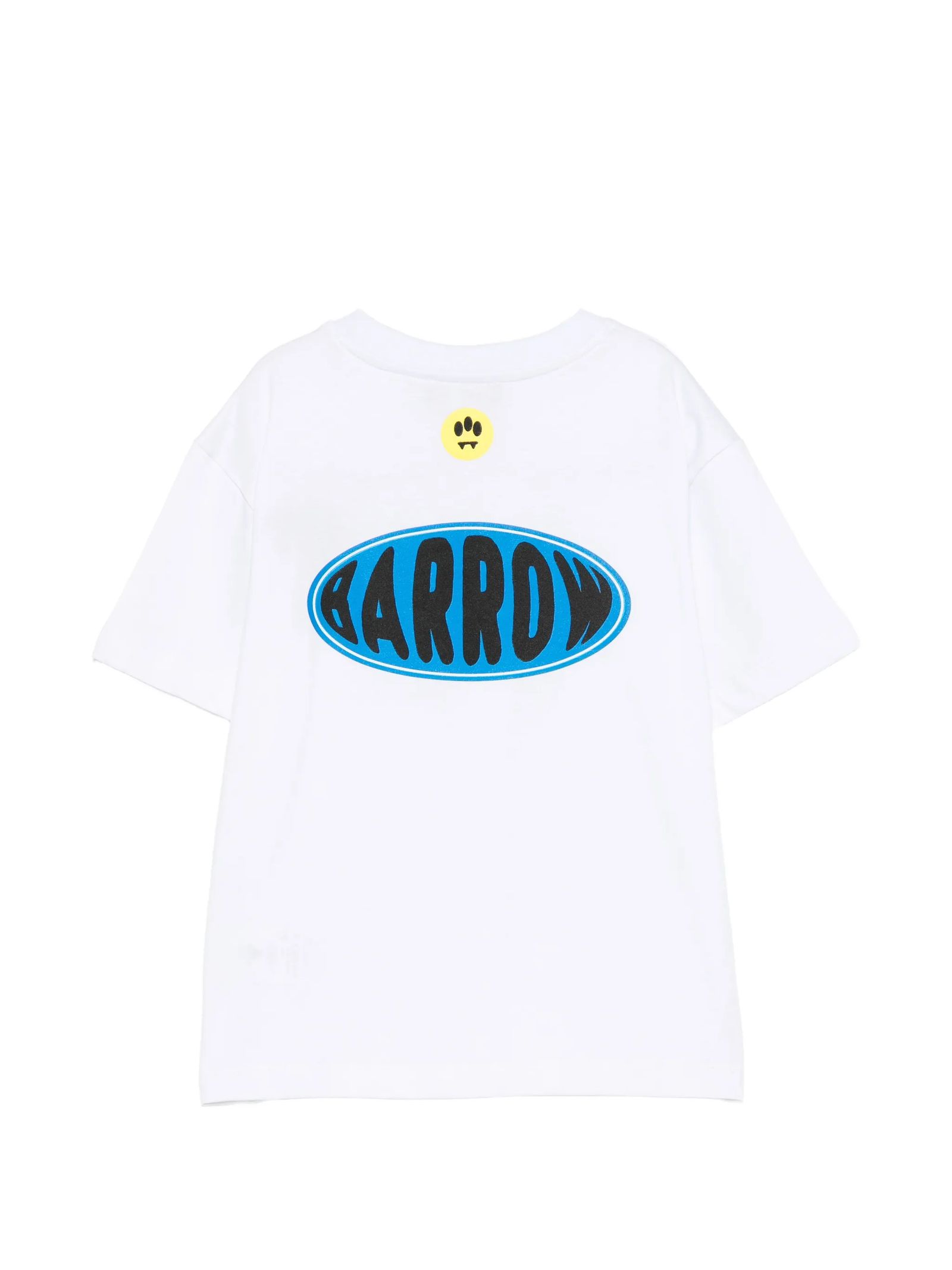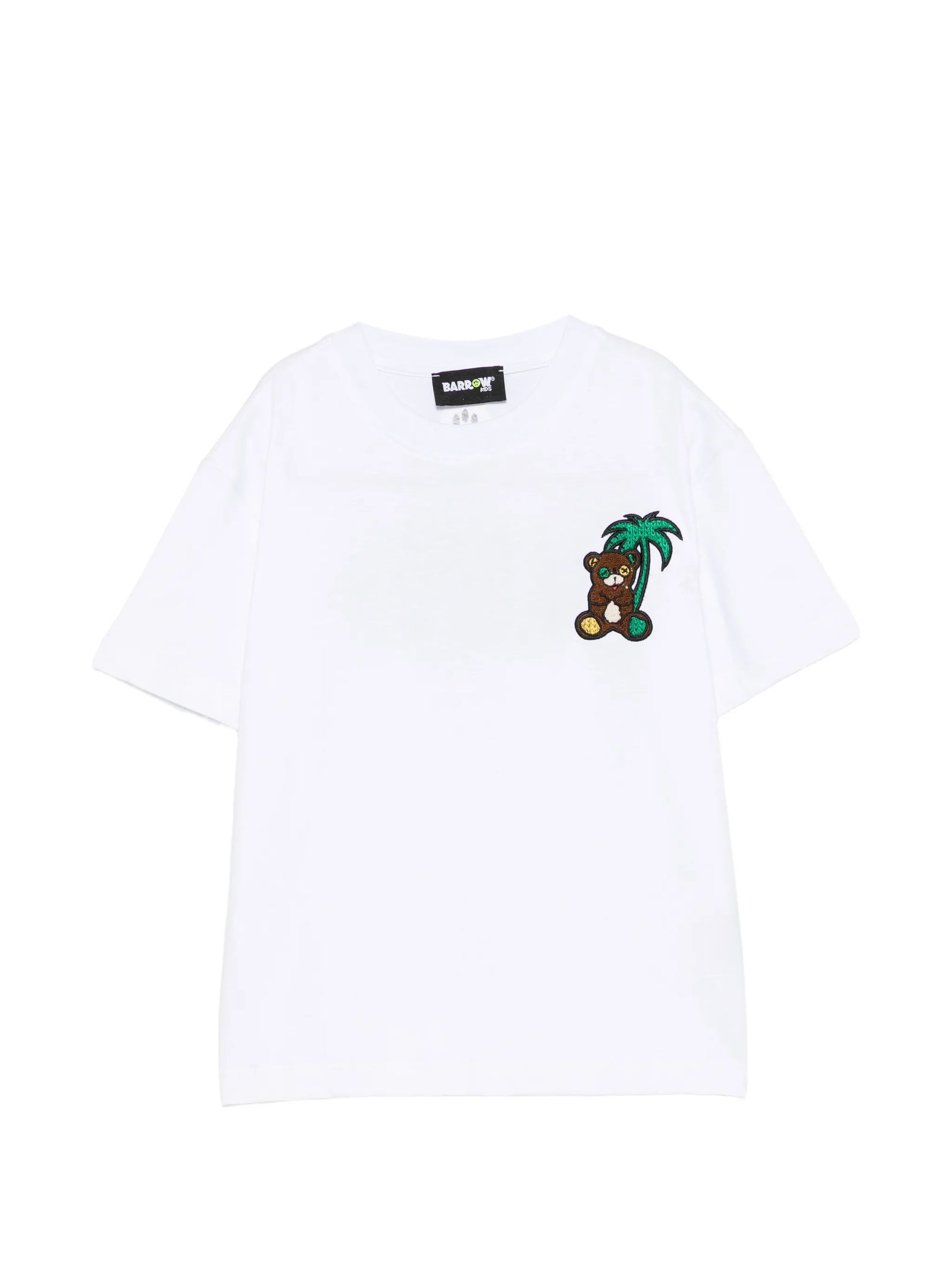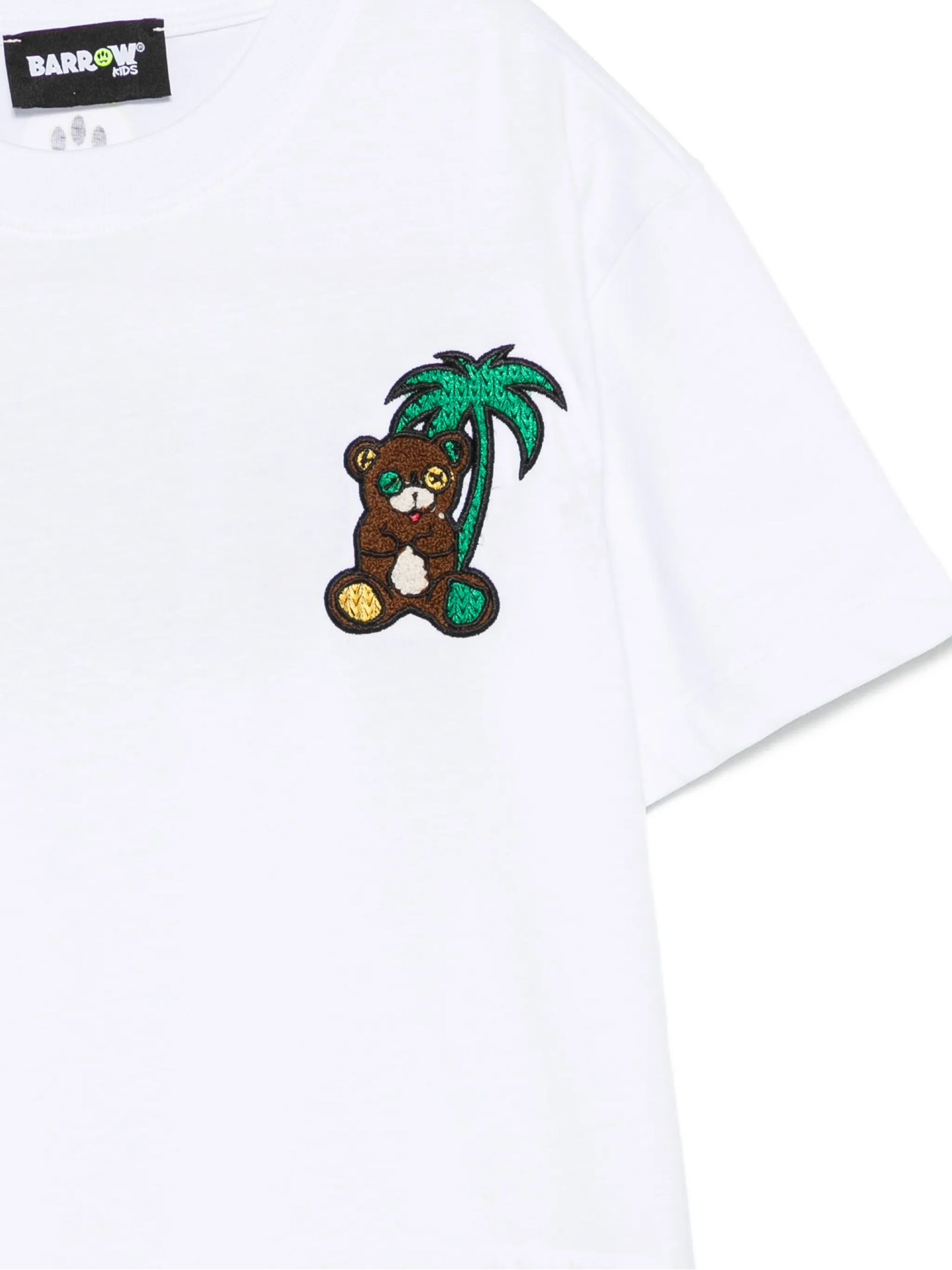 White cotton T-shirt featuring crew neck, short sleeves, appliqué detail, print to the rear