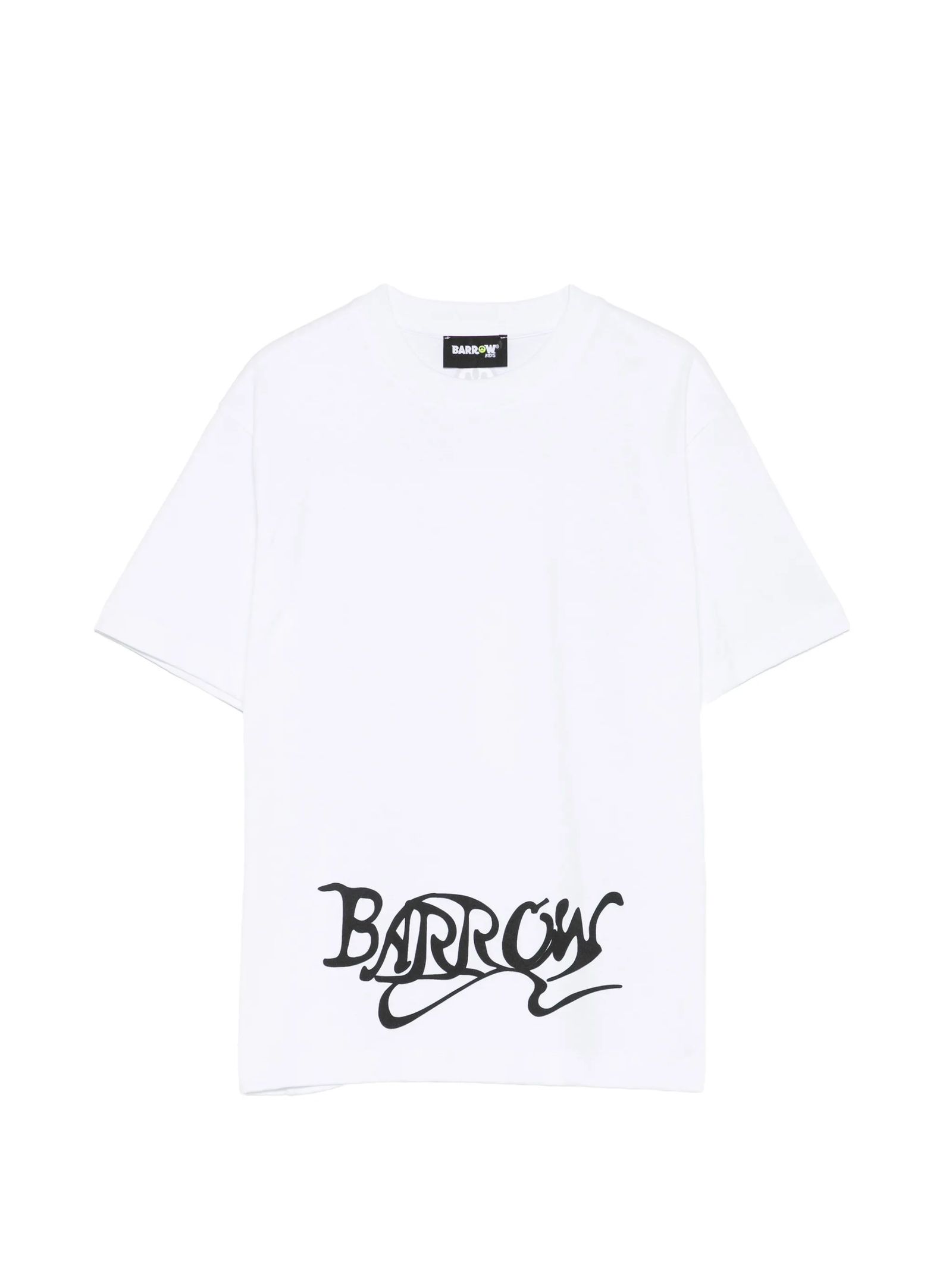 White cotton T-shirt featuring crew neck, short sleeves, appliqué detail, print to the rear