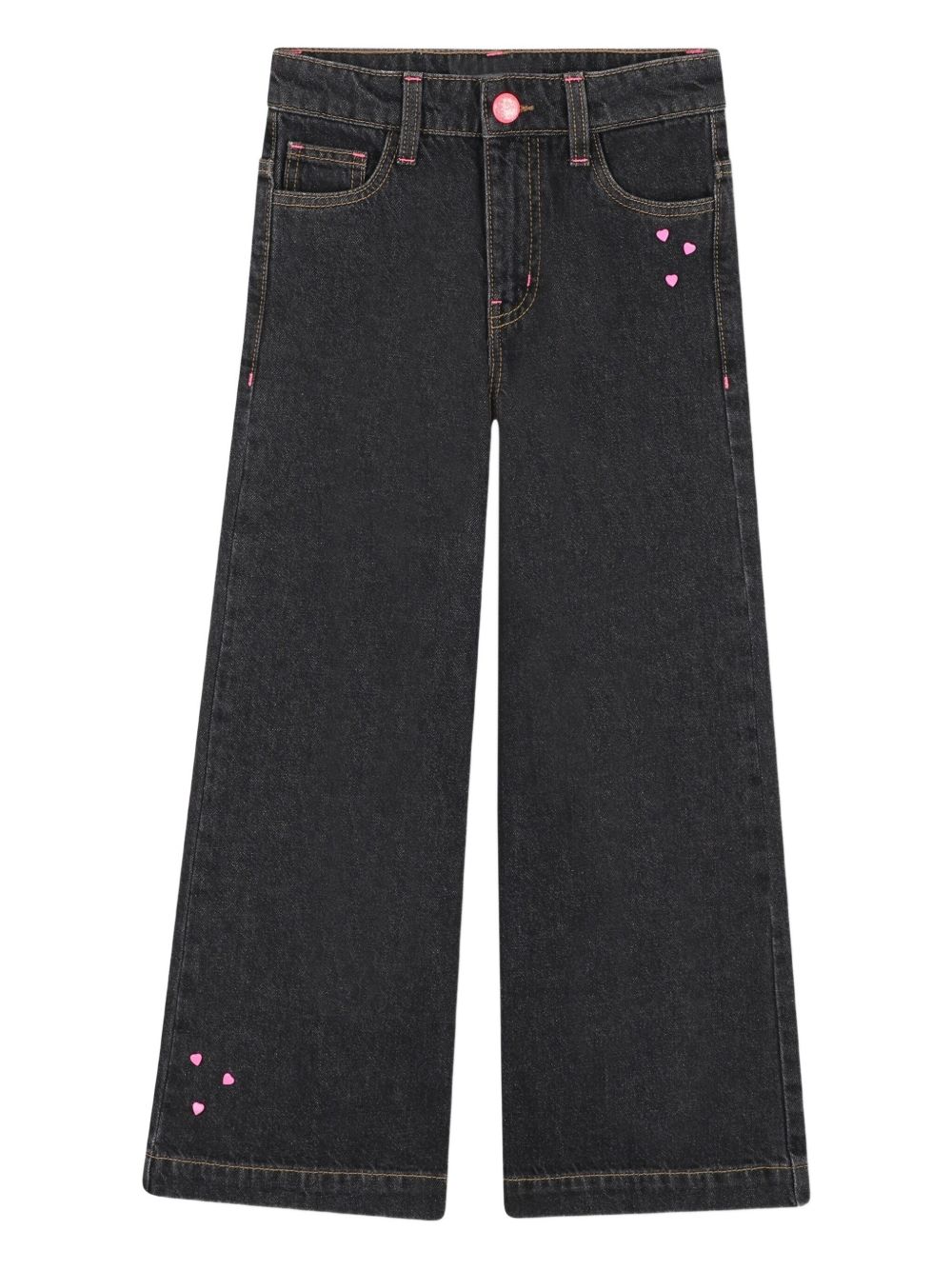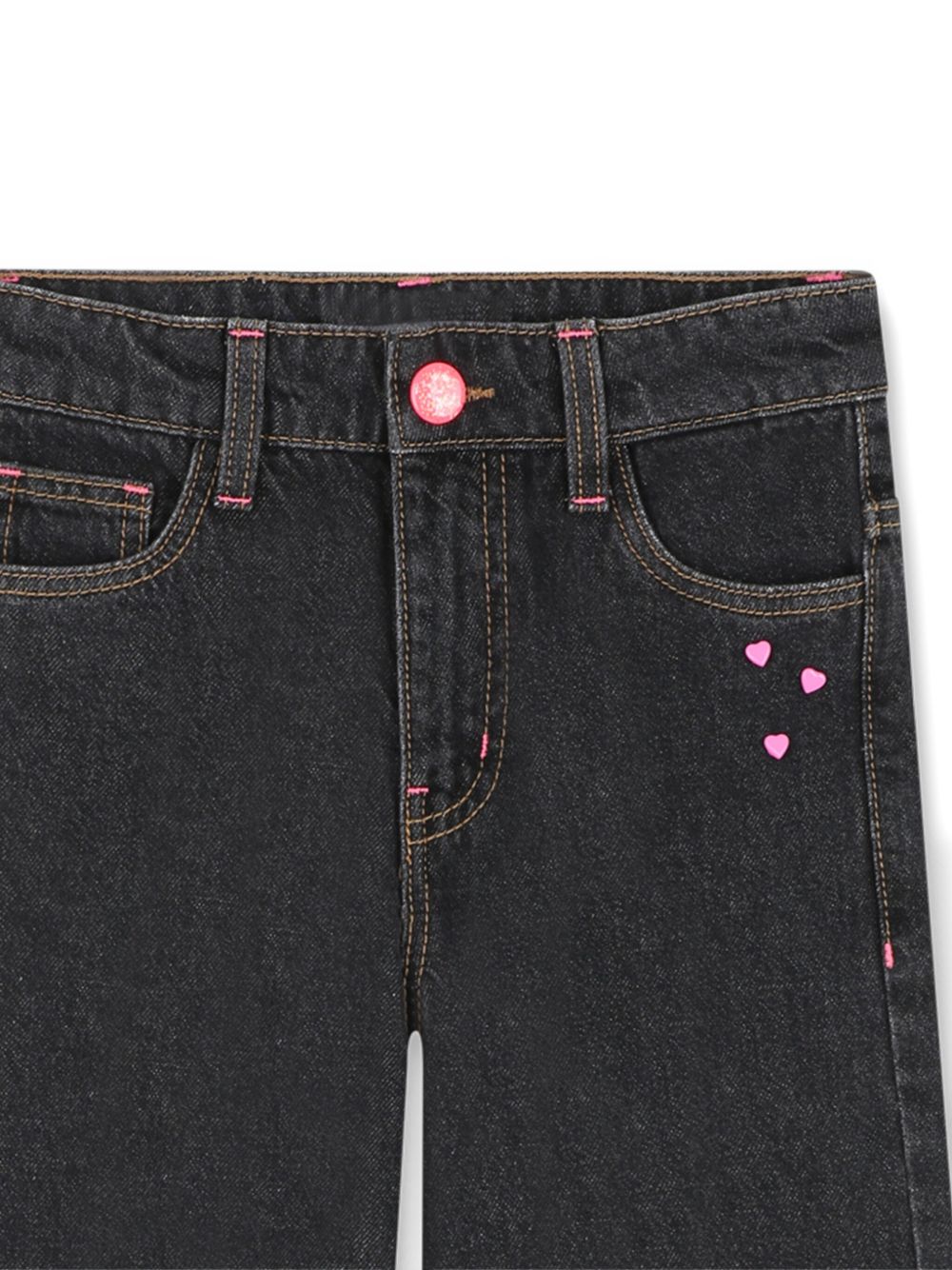 black front and back pockets heart embellishments logo patch at back zip and button fastening