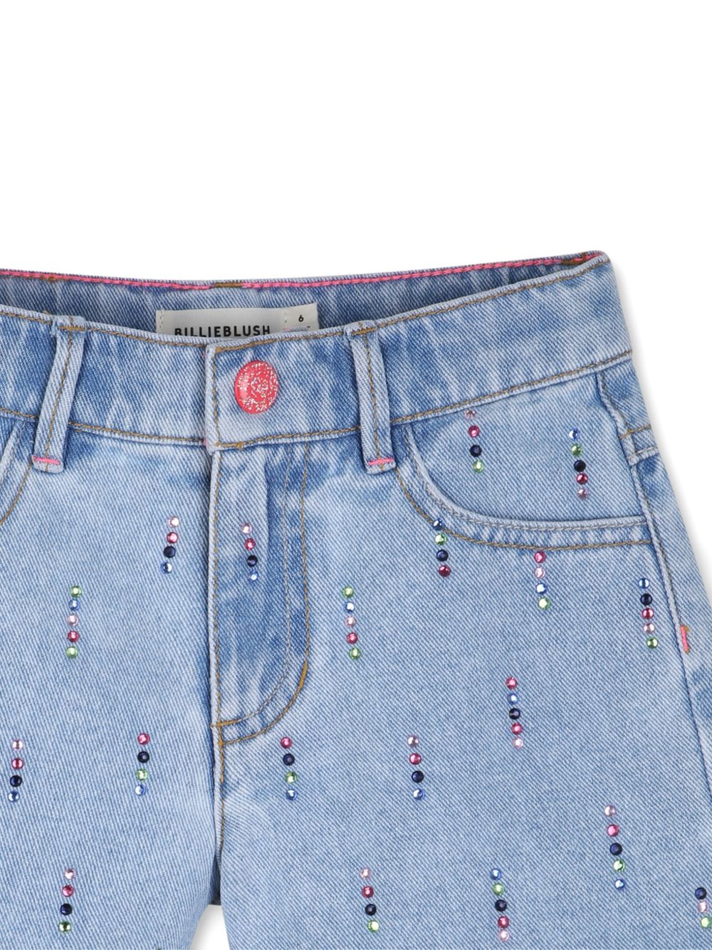 denim blue fringed hem crystal embellishments back patch pockets tonal stitching