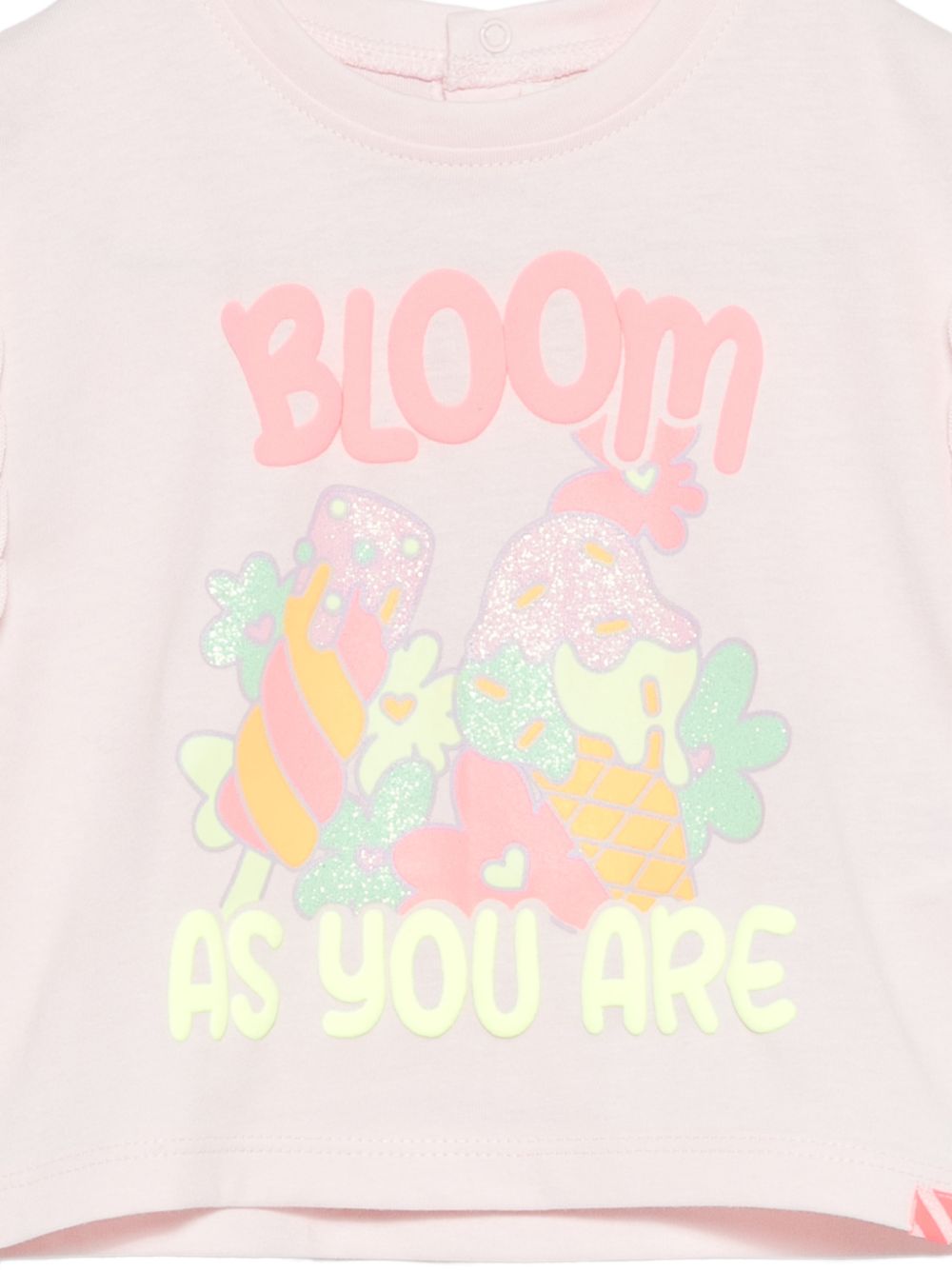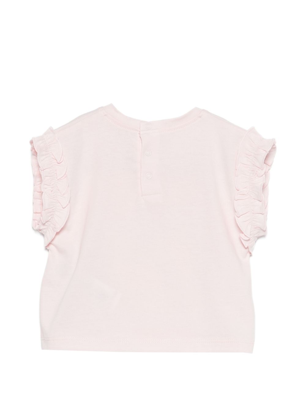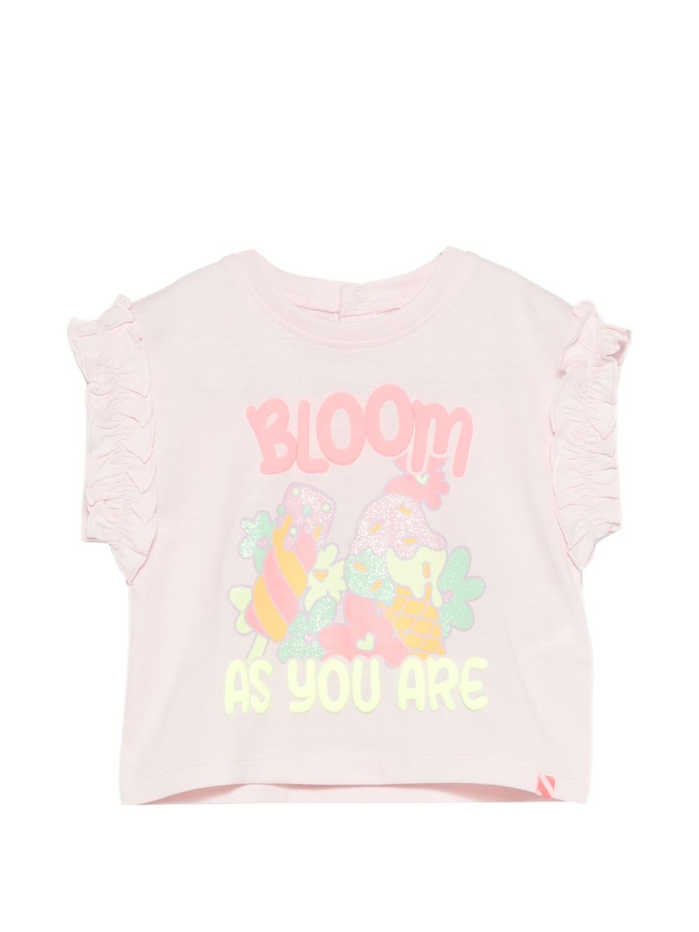 orchid pink and multicolour graphic print ruffled sleeves round neck button fastening at the rear