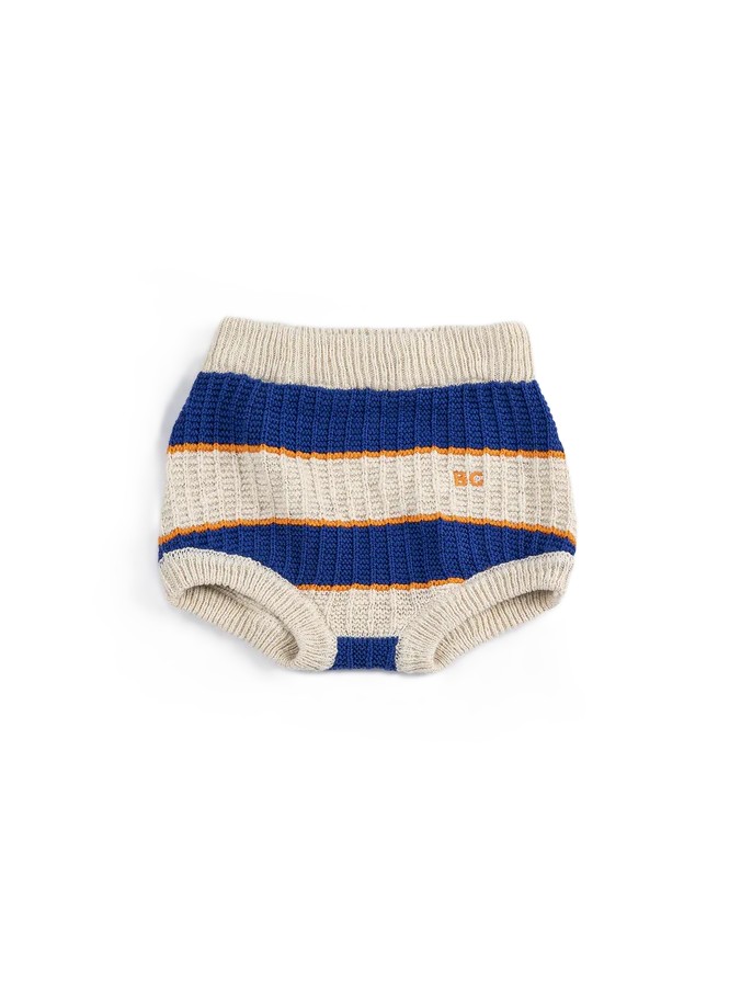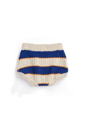 Blue shorts. Designed with short sleeves, dropped shoulder, shoulder button fastening, elasticated waistband, embroidery, fine knit, ribbed bottom, short, round neck and relaxed fit.