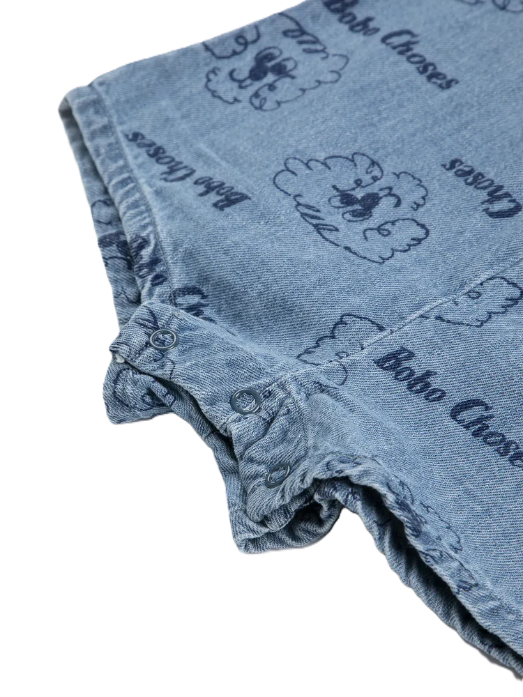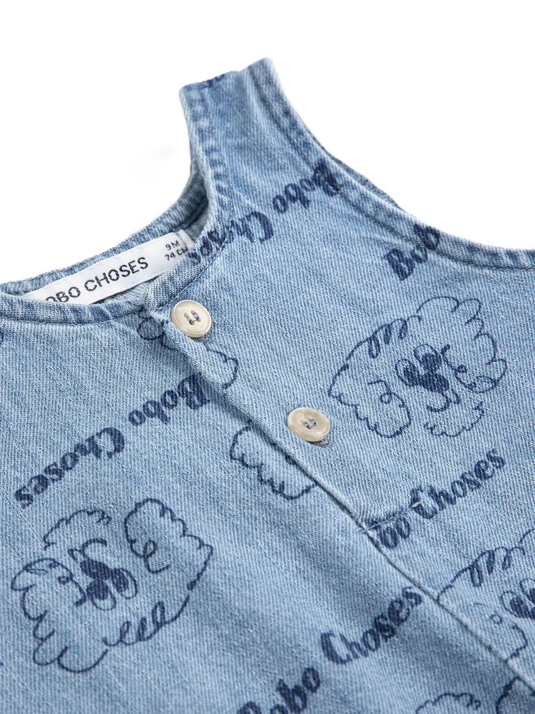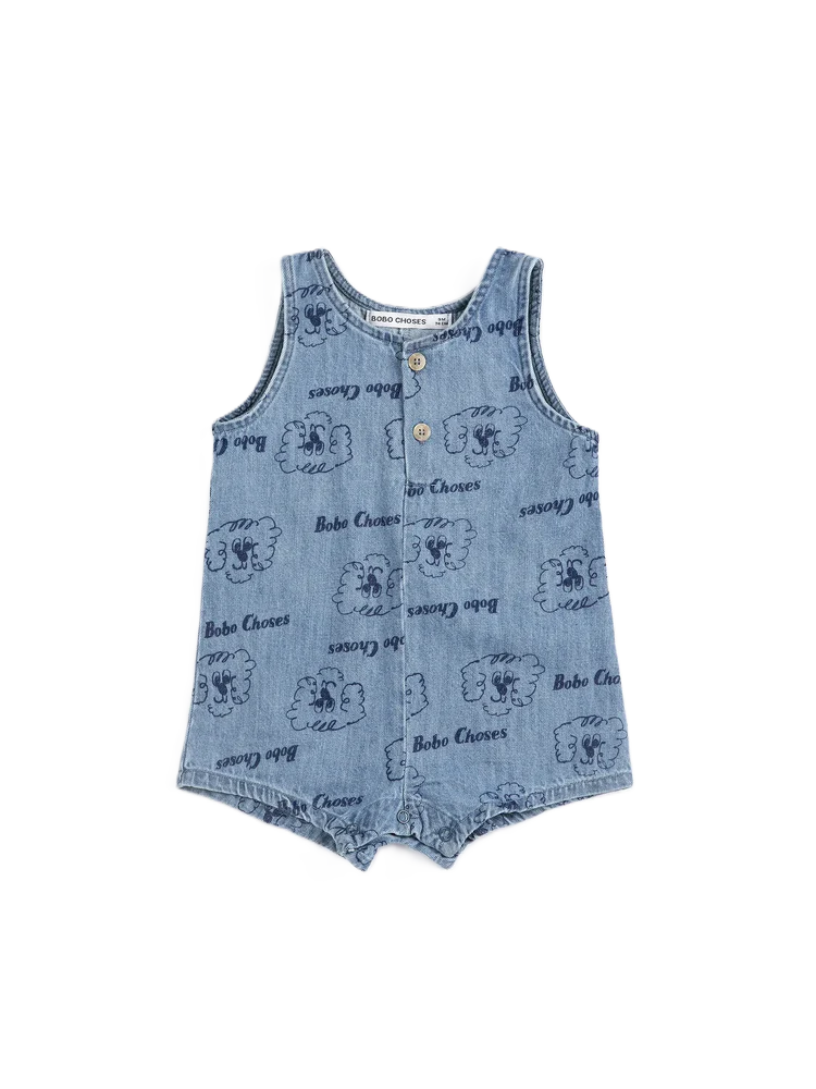 Light blue playsuit. Designed with sleeveless, front button fastening, crotch snap fastening, loose fit, over knee length, round neck and half placket.