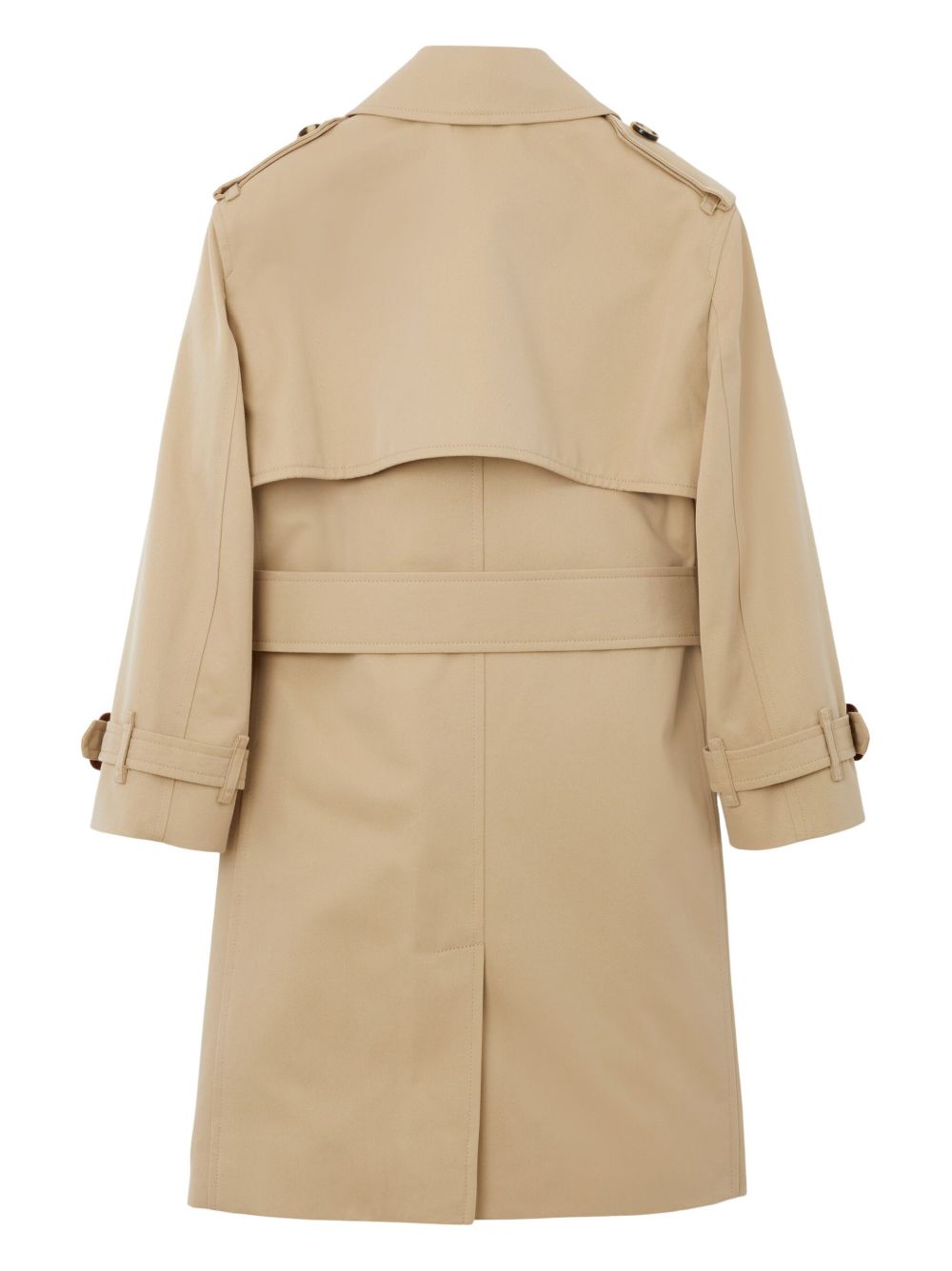 honey cotton notched lapels button fastening at the shoulder front button fastening long sleeves central rear vent belted waist two side slit pockets straight hem
