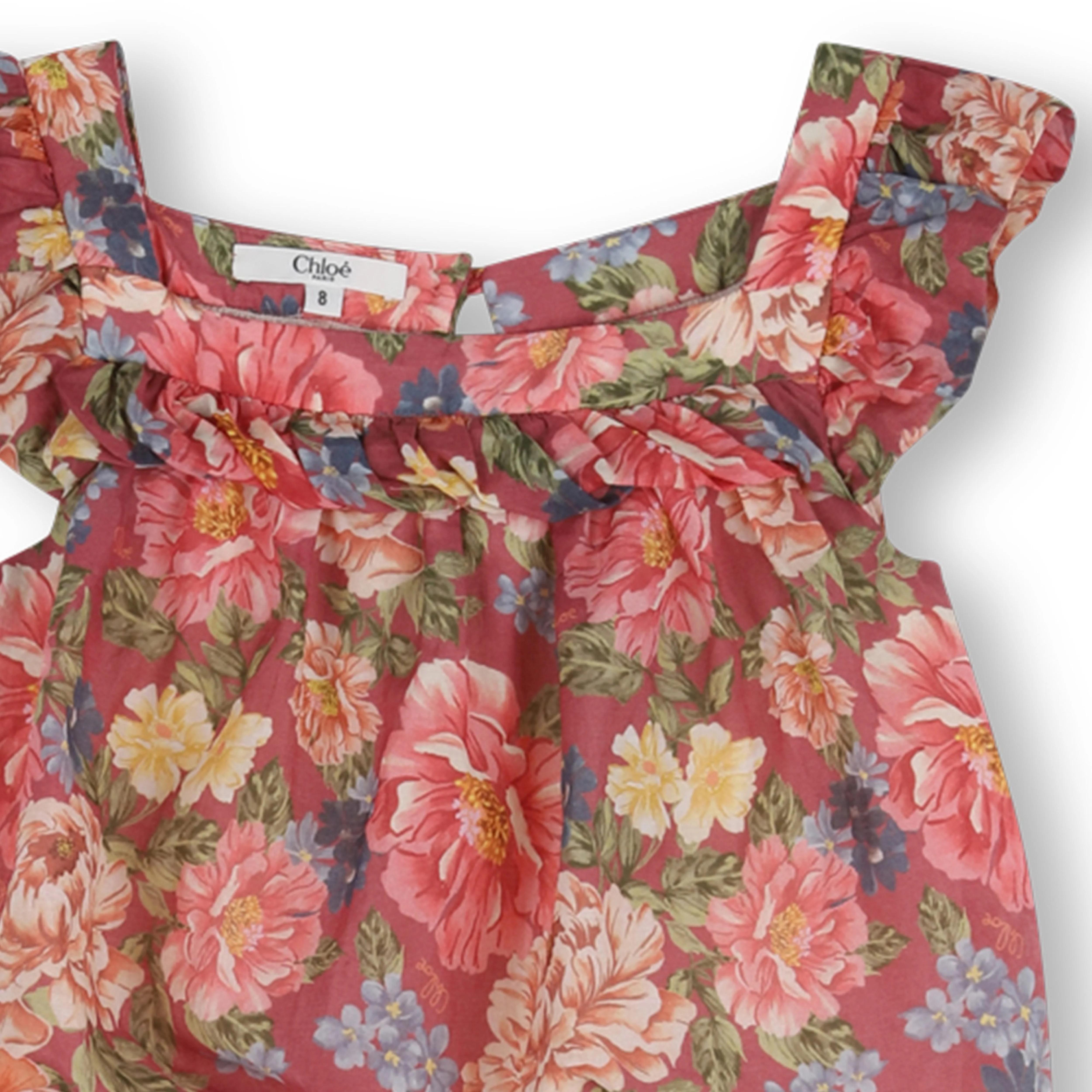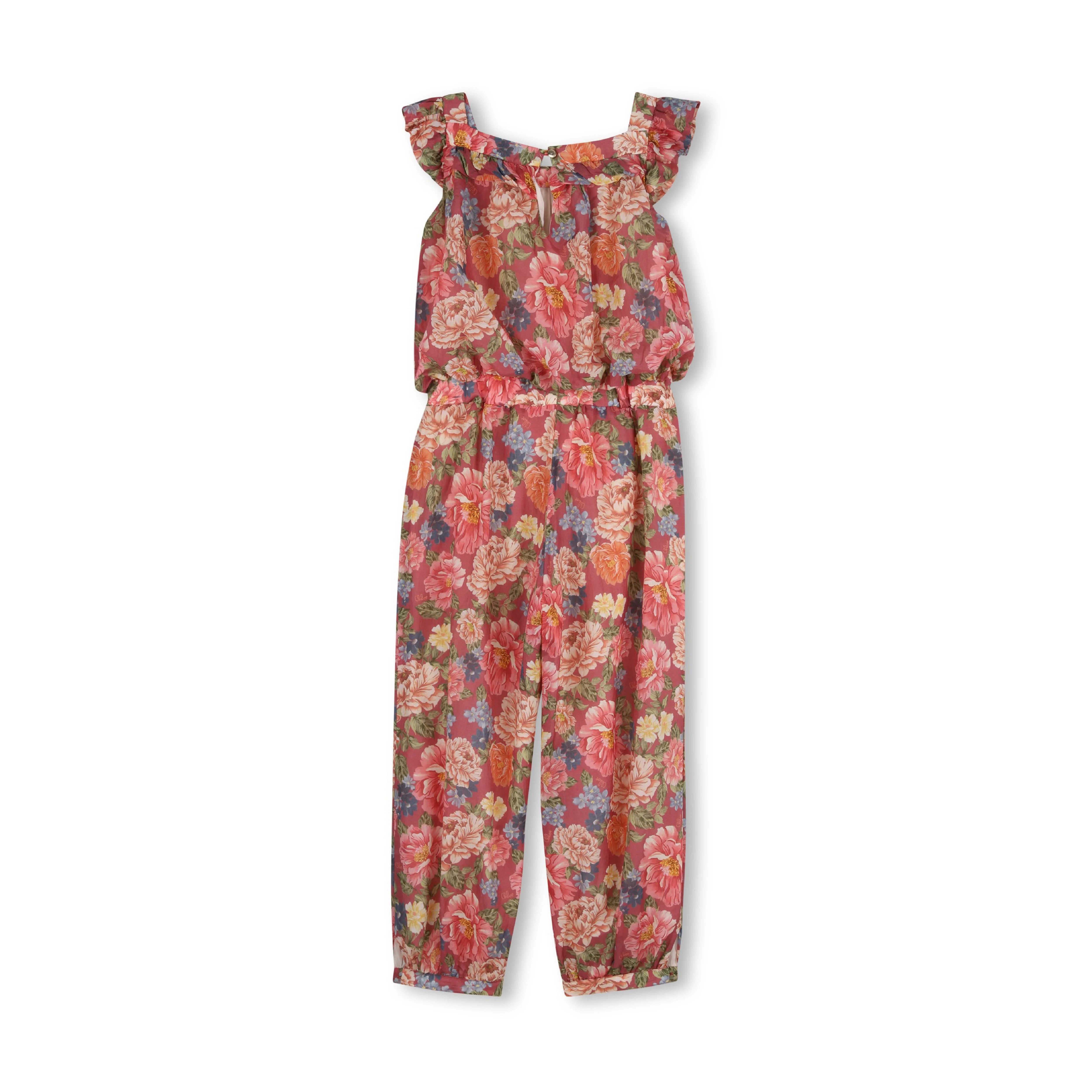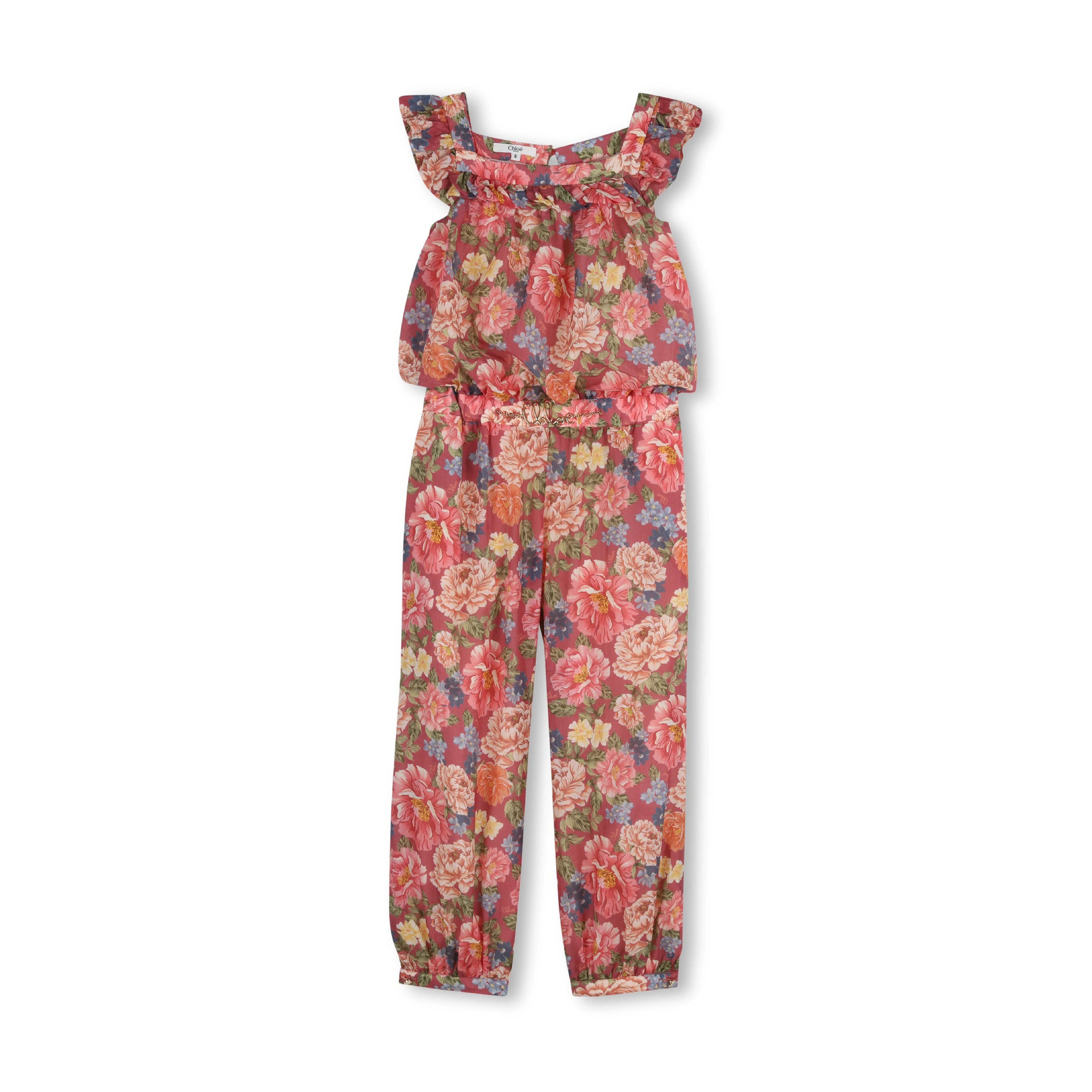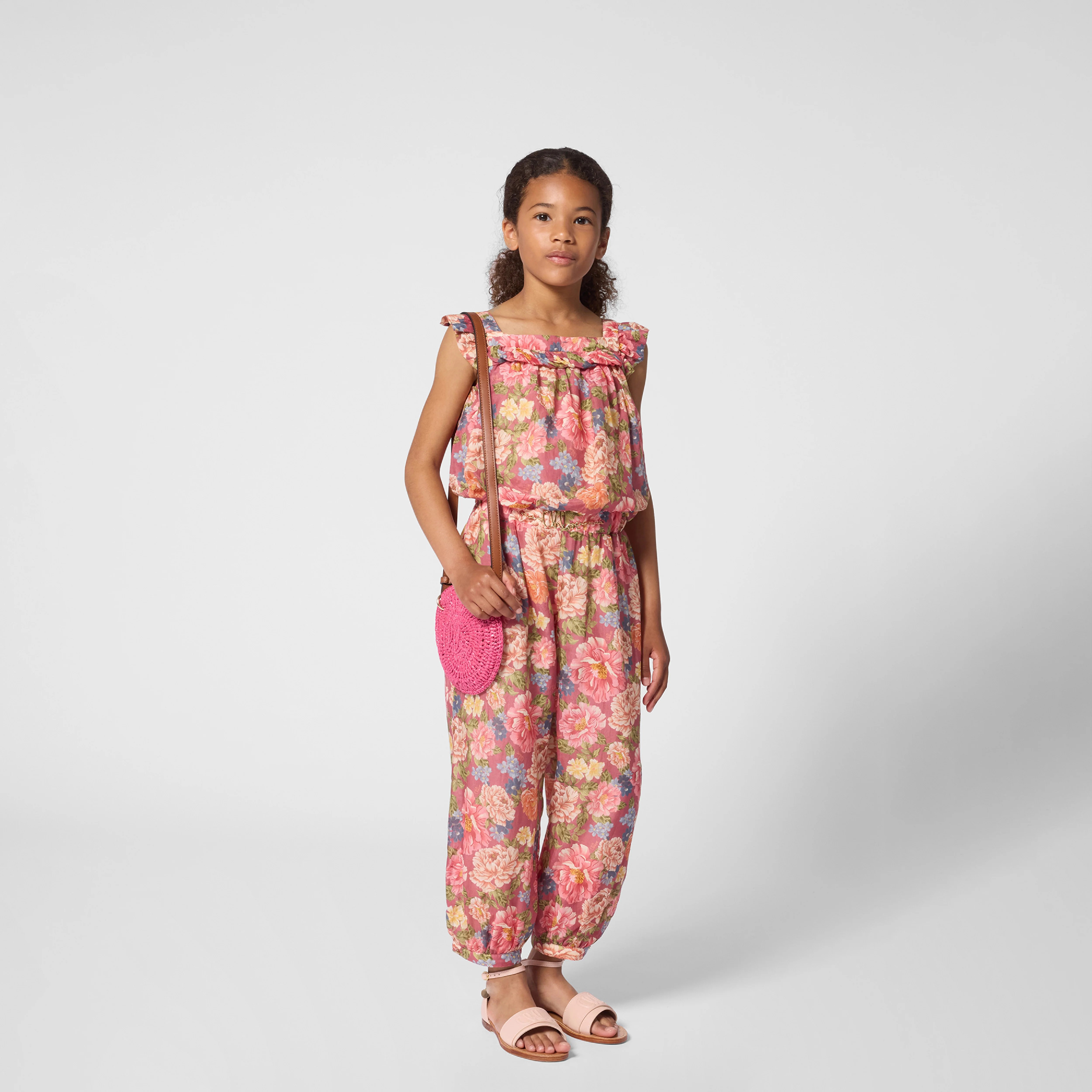 Bright and playful, this sleeveless jumpsuit is covered in a lively floral print with ruffled straps and an elastic waistband. The gathered ankle cuffs add a relaxed yet stylish finish, making it perfect for both comfort and standout fashion.
