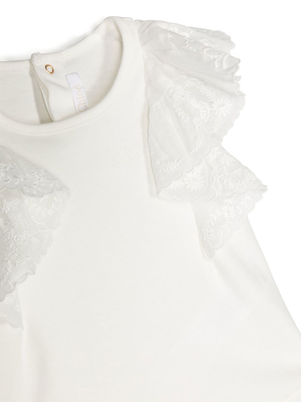 White cotton tshirtfloral embroidery at the sleeveflutter sleevesscallop edgecrew neckrear press-stud fasteningstraight hem