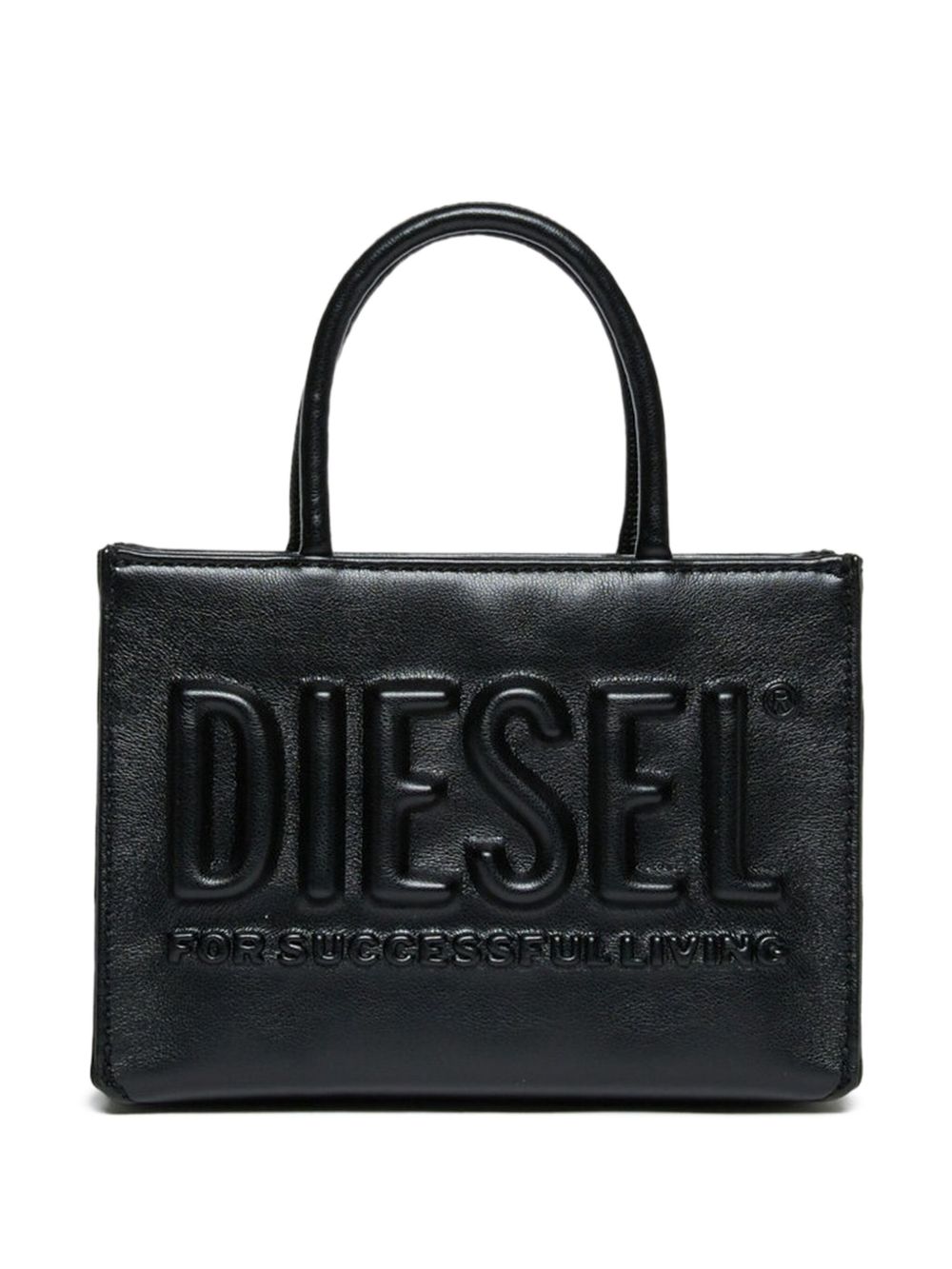 black open top two rolled top handles adjustable detachable shoulder strap embossed logo to the front