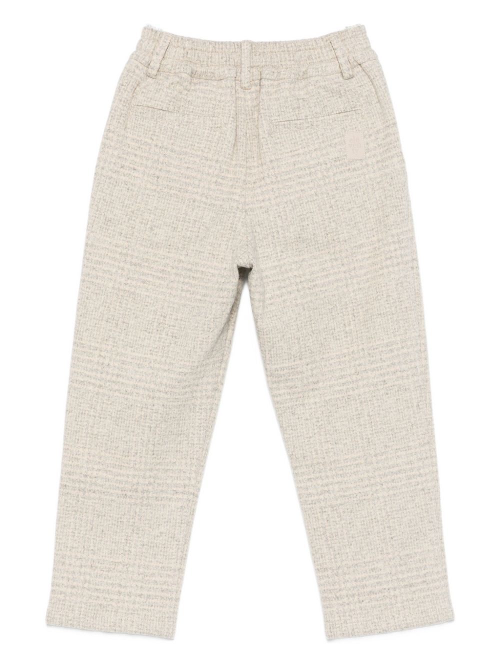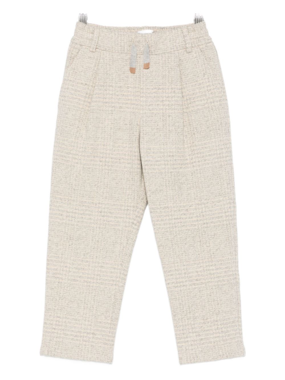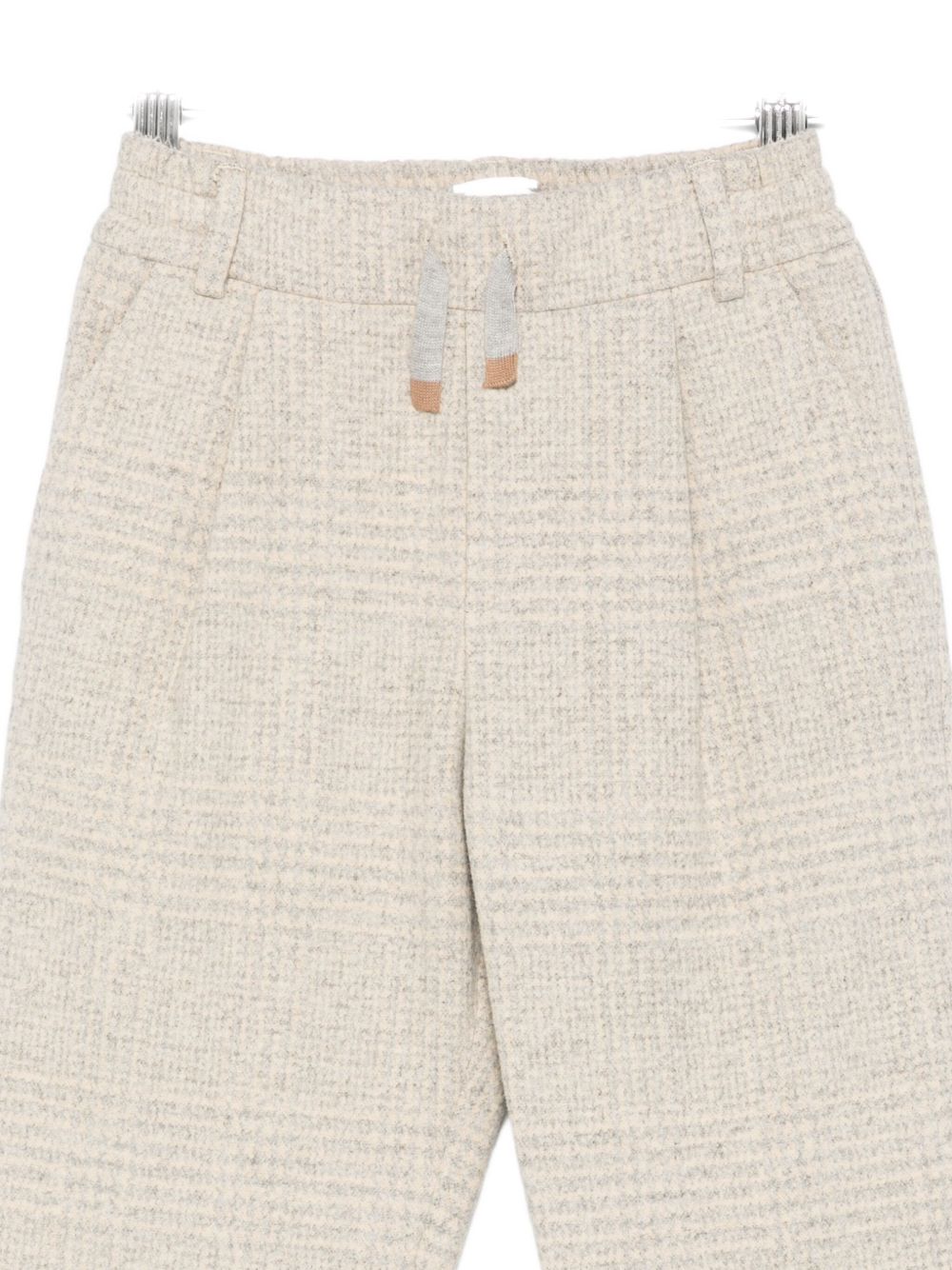 beige checked pattern drawstring fastening elasticated waistband side seam pockets rear welt pocket
