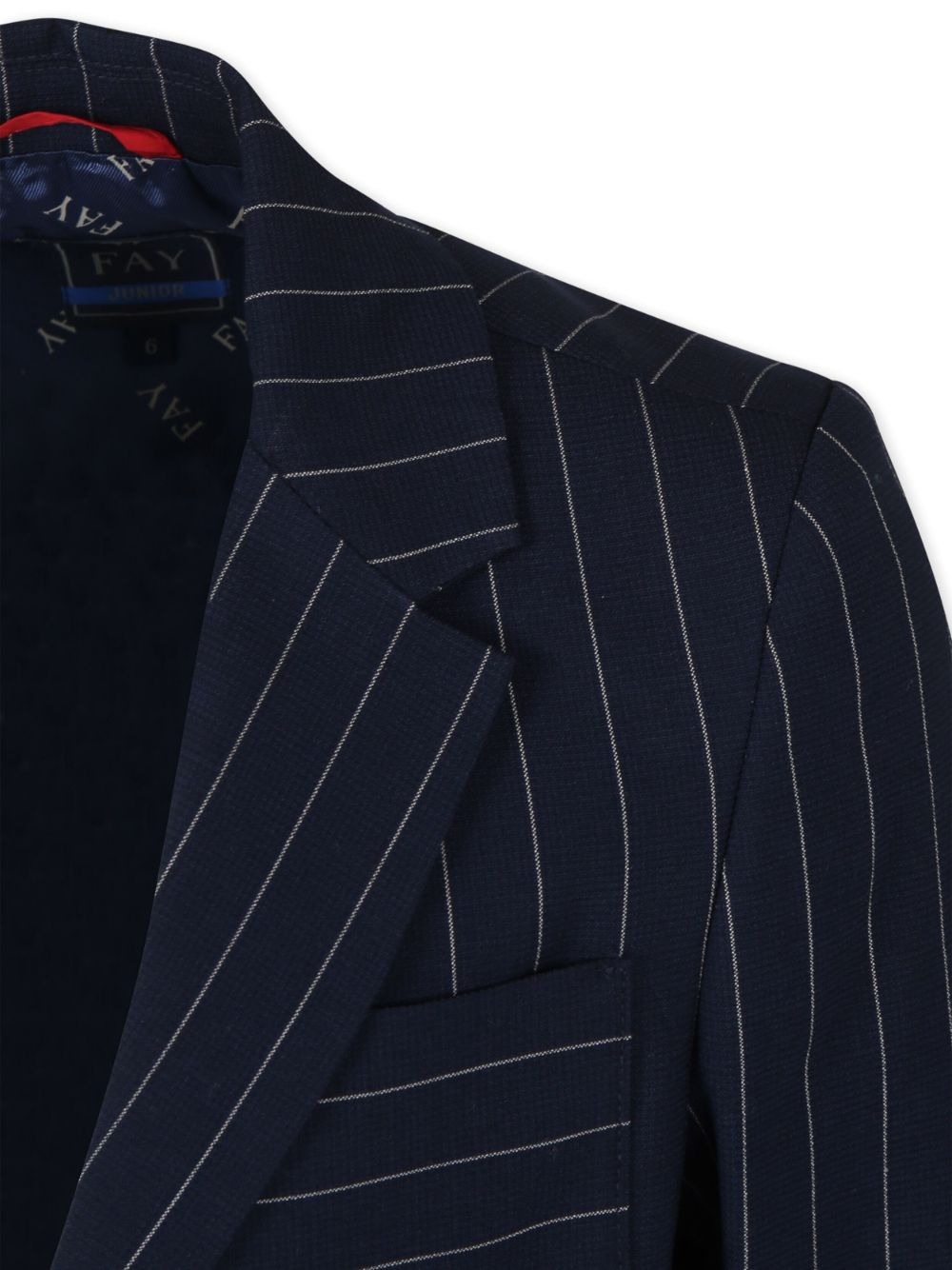 navy blue/white wool blend pinstripe pattern Jacket: notched lapels front button fastening long sleeves buttoned cuffs three front patch pockets curved hem Trousers: belt loops front button and zip fastening two side welt pockets two rear welt pockets