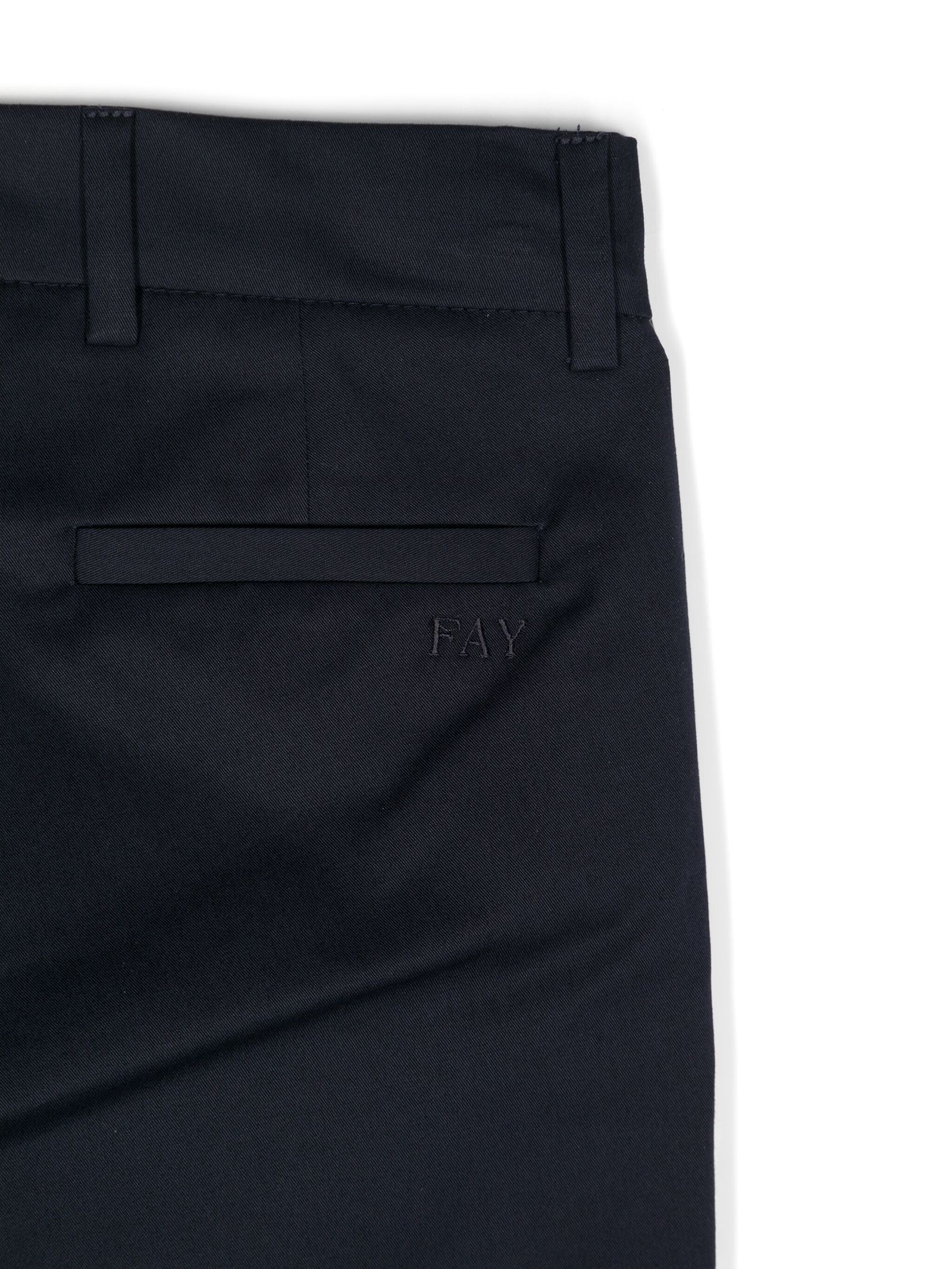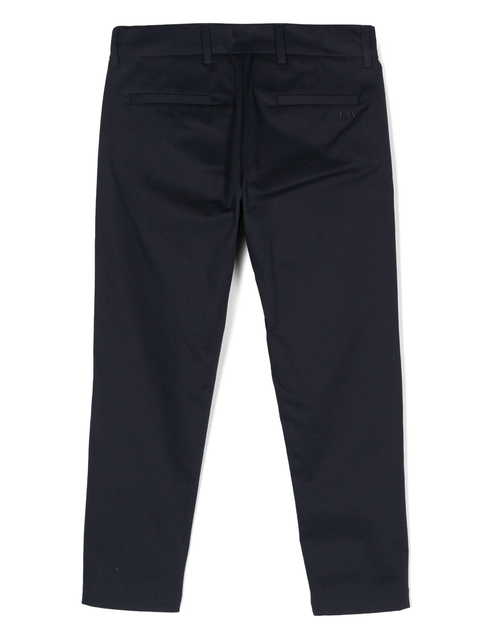 Navy blue cotton blend twill-weave trousers, stretch-design, twill weave, belt loops, two diagonal pockets to the sides, two rear welt pockets, front button and zip fastening