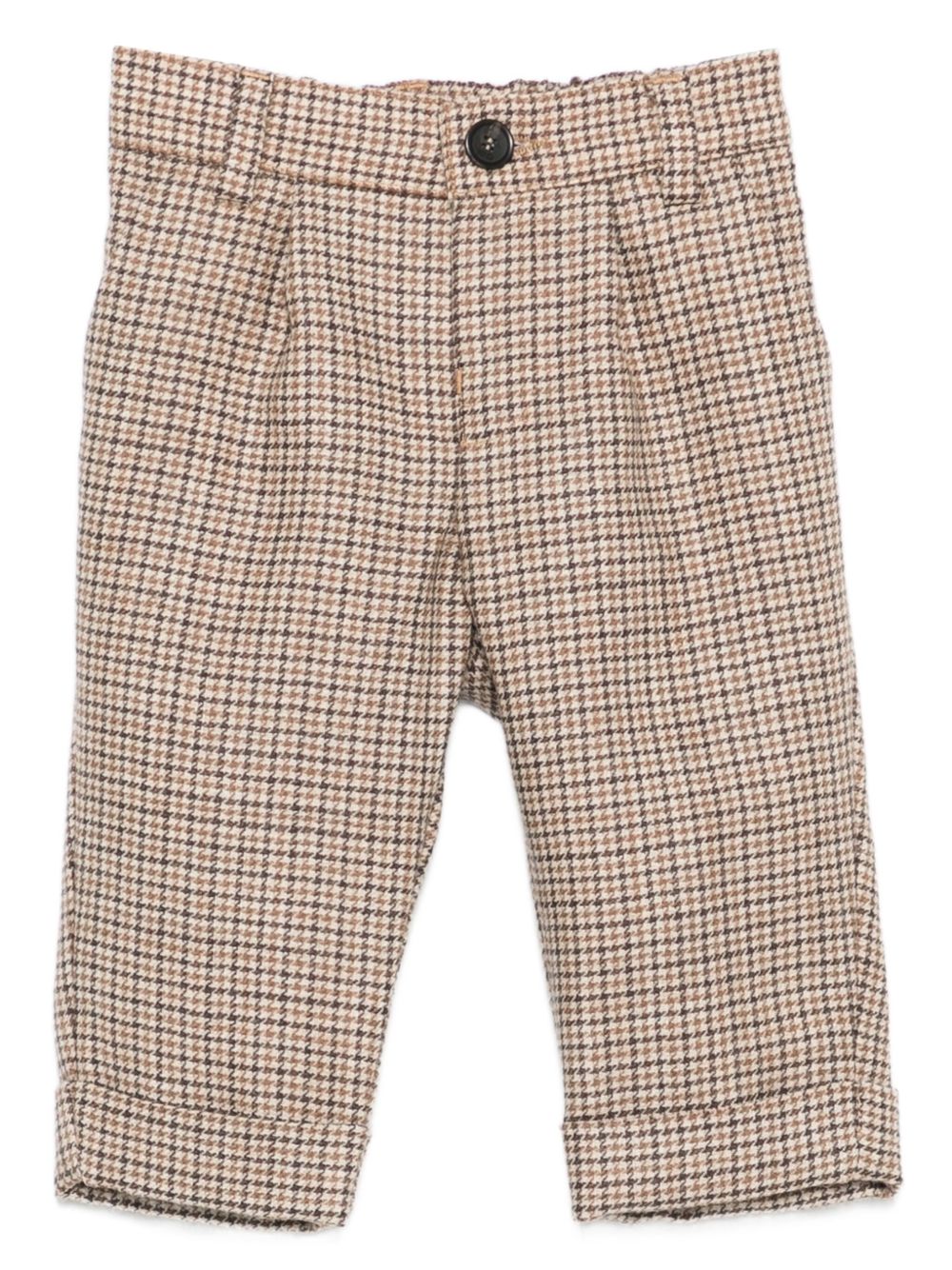 beige checked pattern pleated front elasticated waistband logo patch cuffed hems