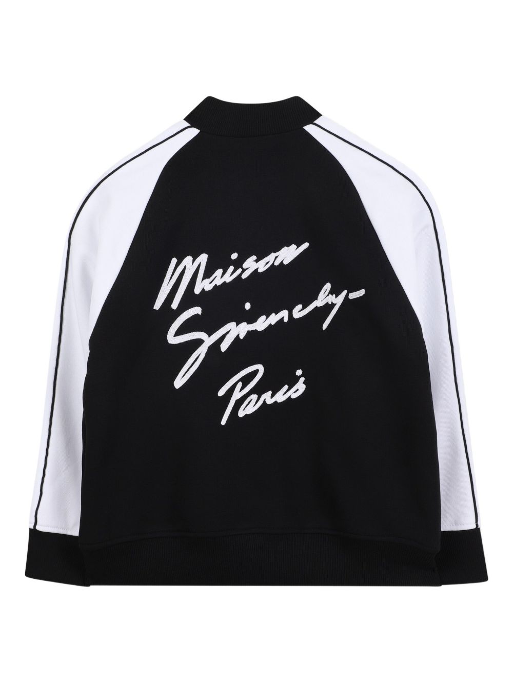 black white contrast panels snap button fastening embroidered logo detail ribbed cuffs and hem signature text design