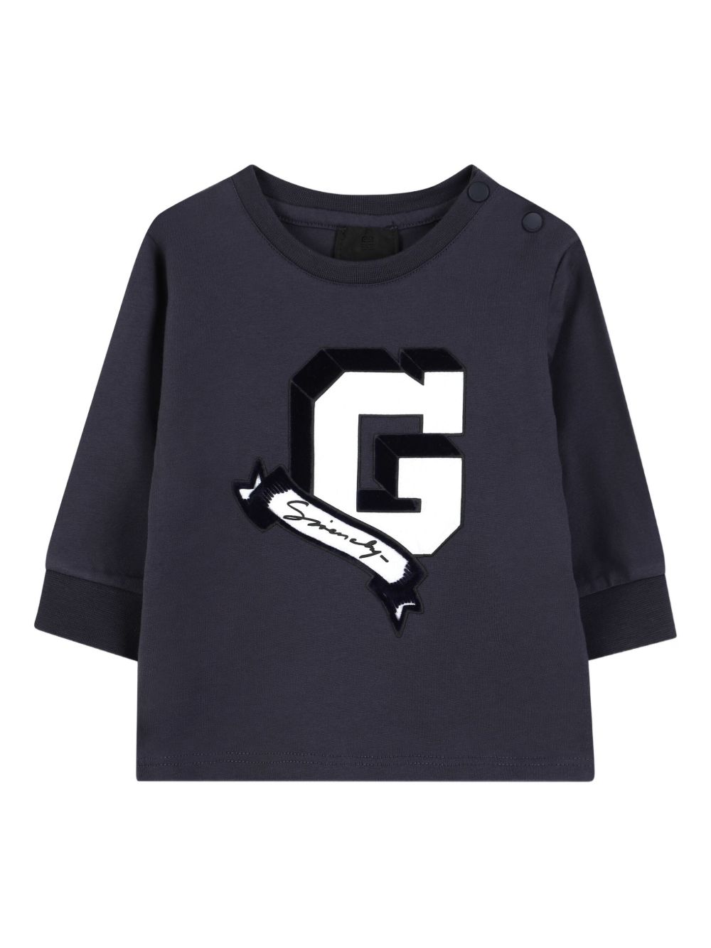navy blue contrast logo appliqué embroidered signature detail snap shoulder closure round neckline