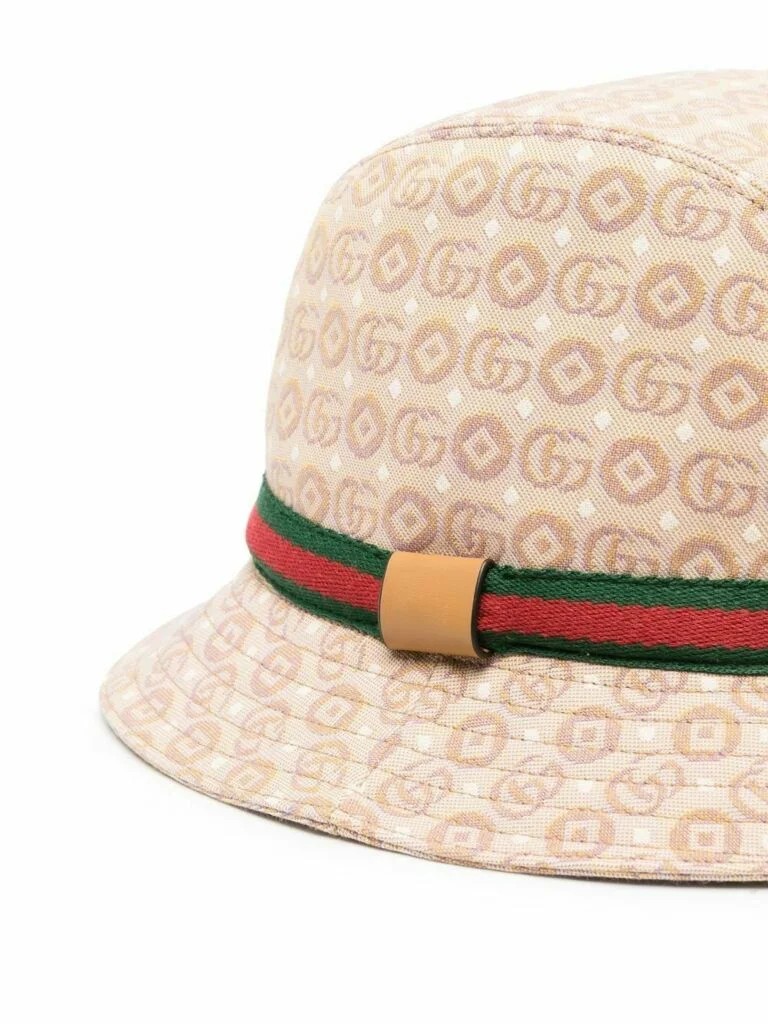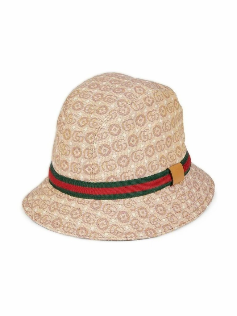 Brown cotton hatDouble G jacquard cotton and blue geometric patternBlue and red web ribbon with leather loopGucci label detail italics