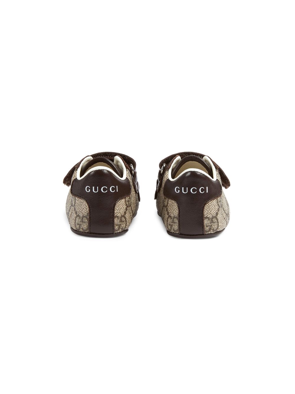 brown/black canvas/leather signature GG Damier jacquard round toe front touch-strap fastening branded heel counter branded insole flat sole