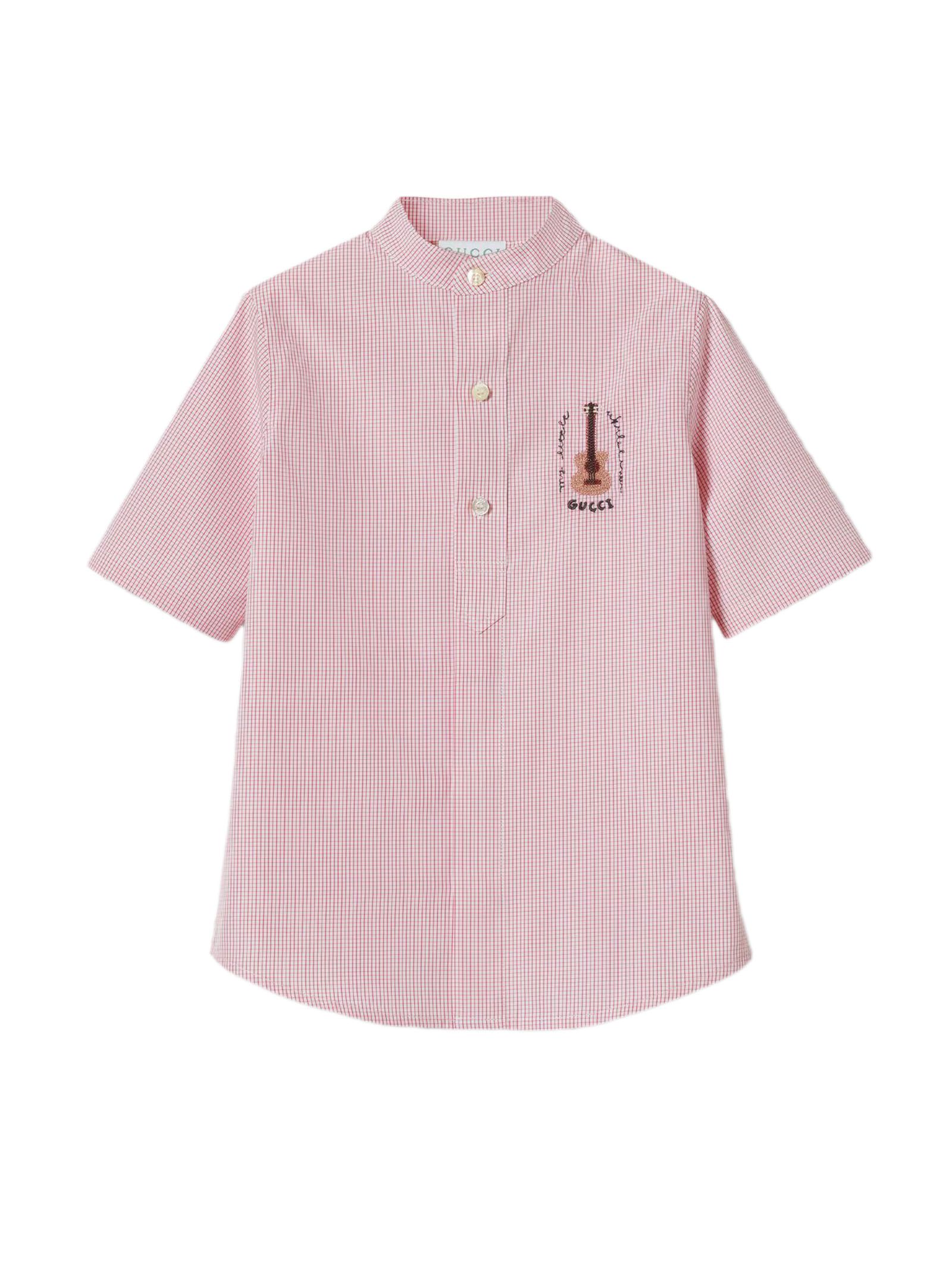Children's embroidered cotton shirt, White and red checked cotton, Artwork by Naon Jeong, Gucci guitar embroidery, Stand collar, Dropped shoulder, Short sleeves, Button closure