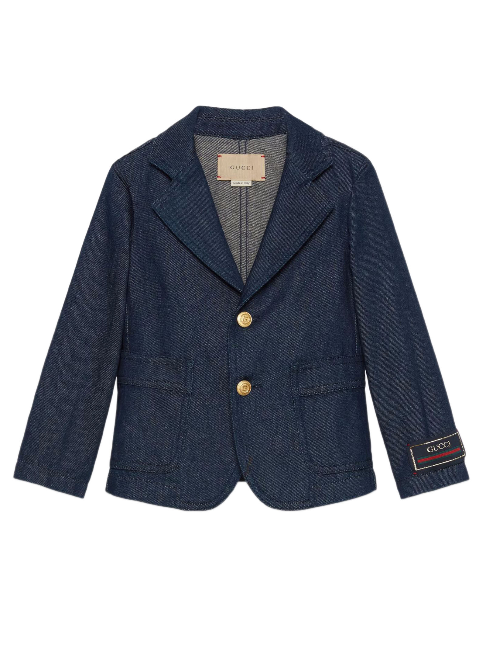 Dark blue washed denim jacket, dold-toned G Square metal buttons, Gucci Web label, Unlined, Peak lapel, Long sleeves