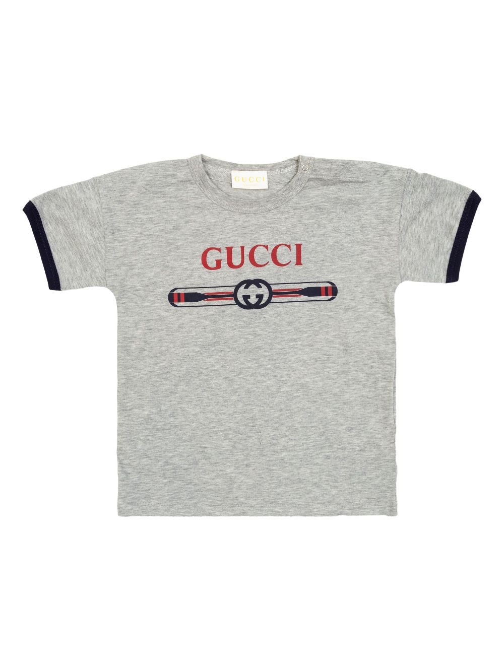 Light grey cotton jersey Navy trim T-shirt, Gucci Interlocking G and oars print, crewneck, short sleeves, rib trim, snap button along the shoulder seam, oversize fit across shoulders