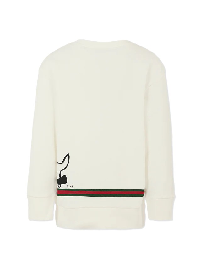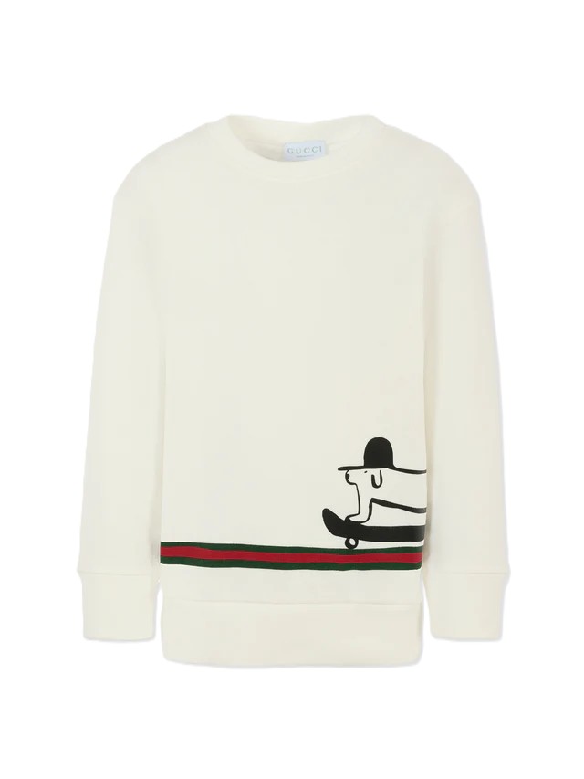 White sweatshirt from the Italian luxury brand Gucci Kids, made of lightly brushed cotton. It features long sleeves, a crew neck, and ribbed cuffs and hem. It's decorated with a red and green Web detail at the bottom and a dog print by Euan Roberts; the British artist creates humor, hope, and joy through an eclectic array of animal characters and visual metaphors. Made in Italy