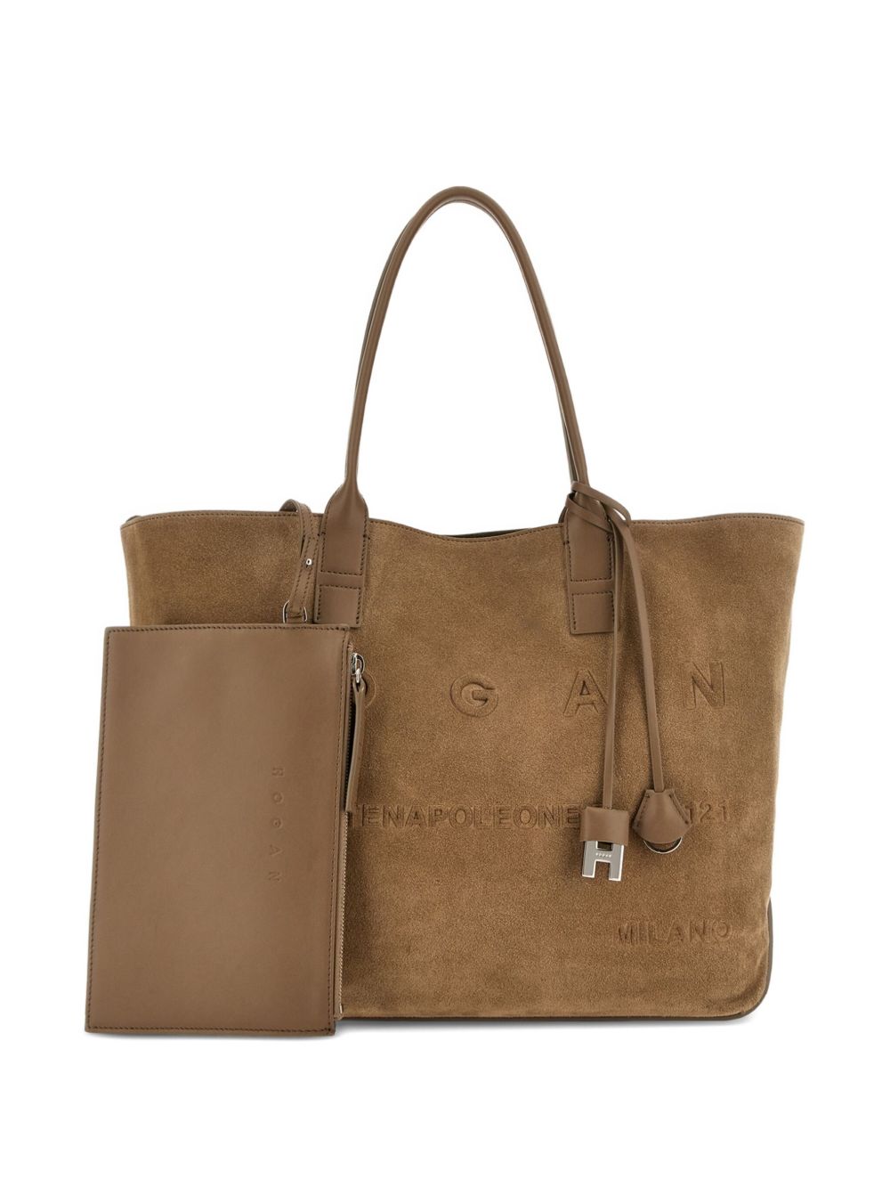 brown embossed logo detailing dual top handles open top design tie fastening main compartment
