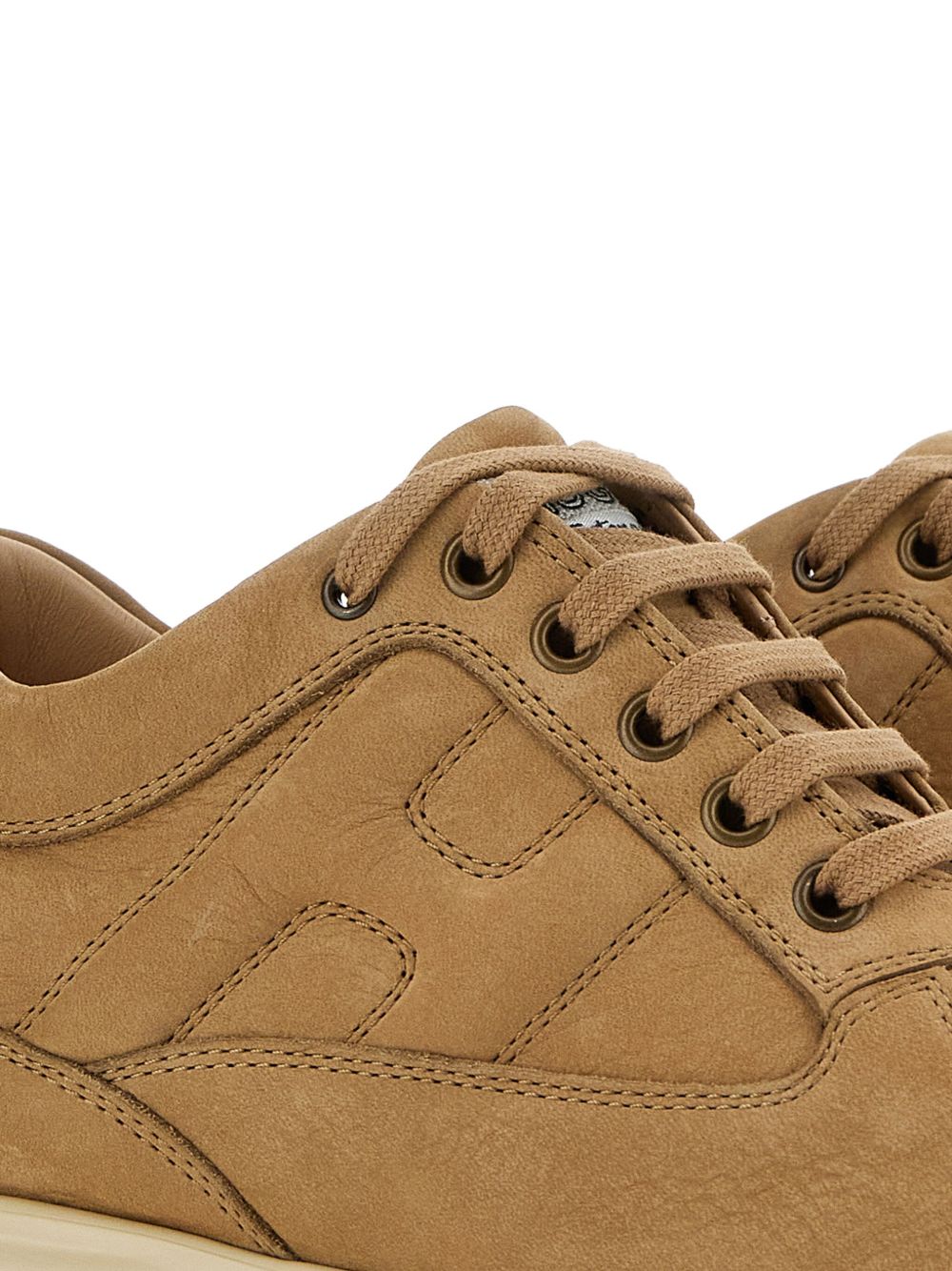 camel brown calf leather panelled design suede panels embroidered logo to the side logo patch at the tongue almond toe front lace-up fastening branded leather insole rubber sole
