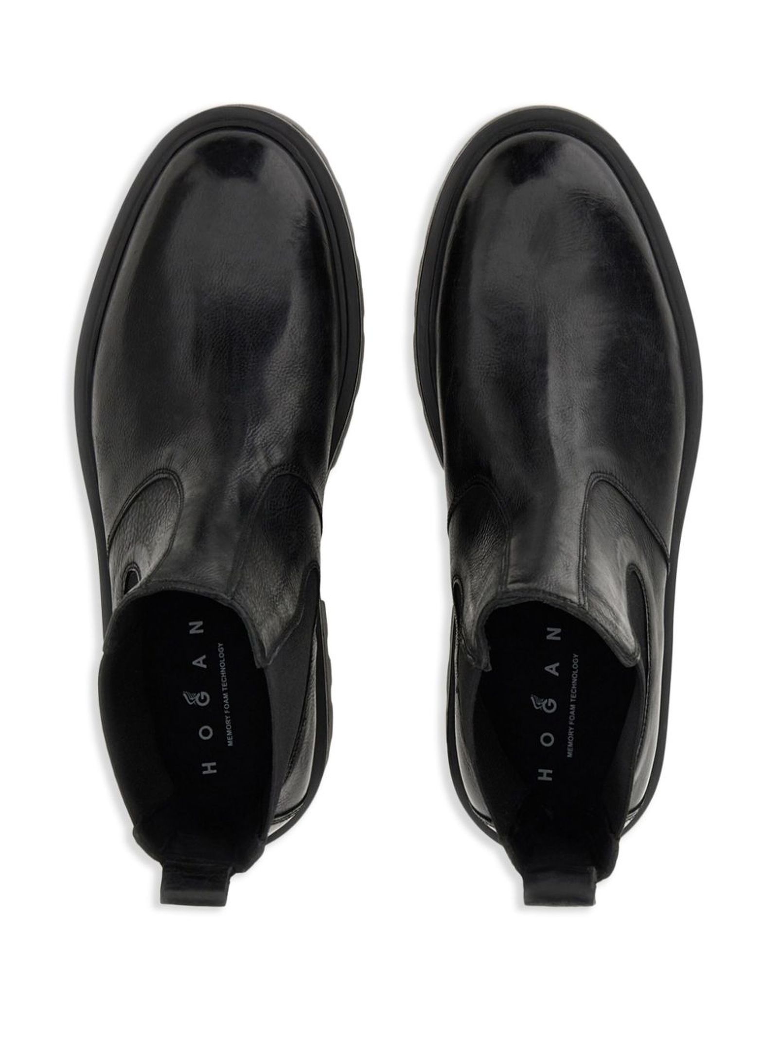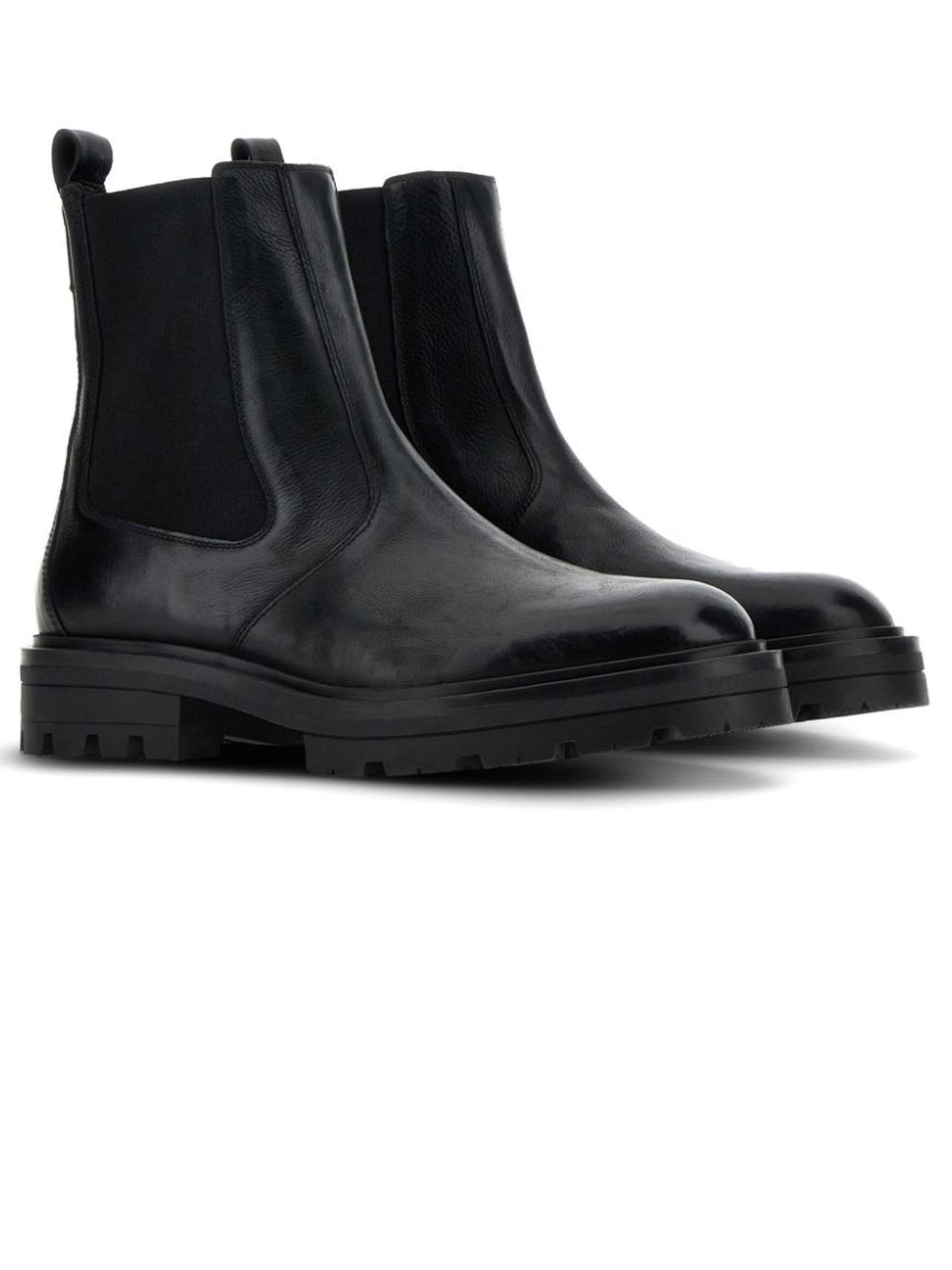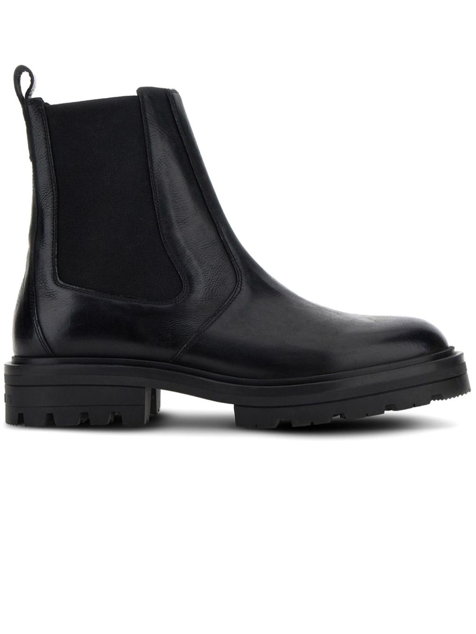 black leather bootscalfskintone-on-tone stitchingElasticated side insertsround tipheel tabinsole with logorubber tank sole