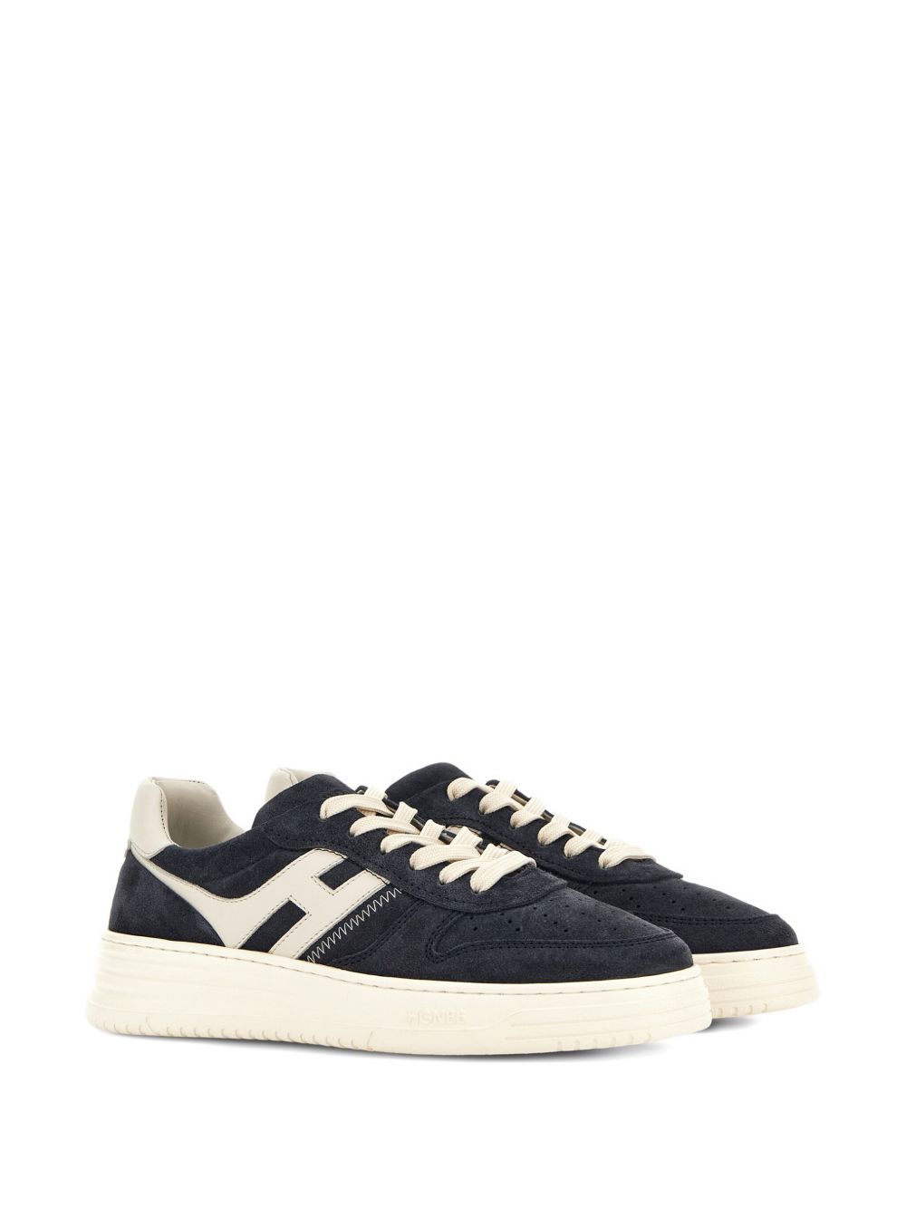 midnight blue front lace-up fastening contrasting rubber sole appliqué logo branded insole
