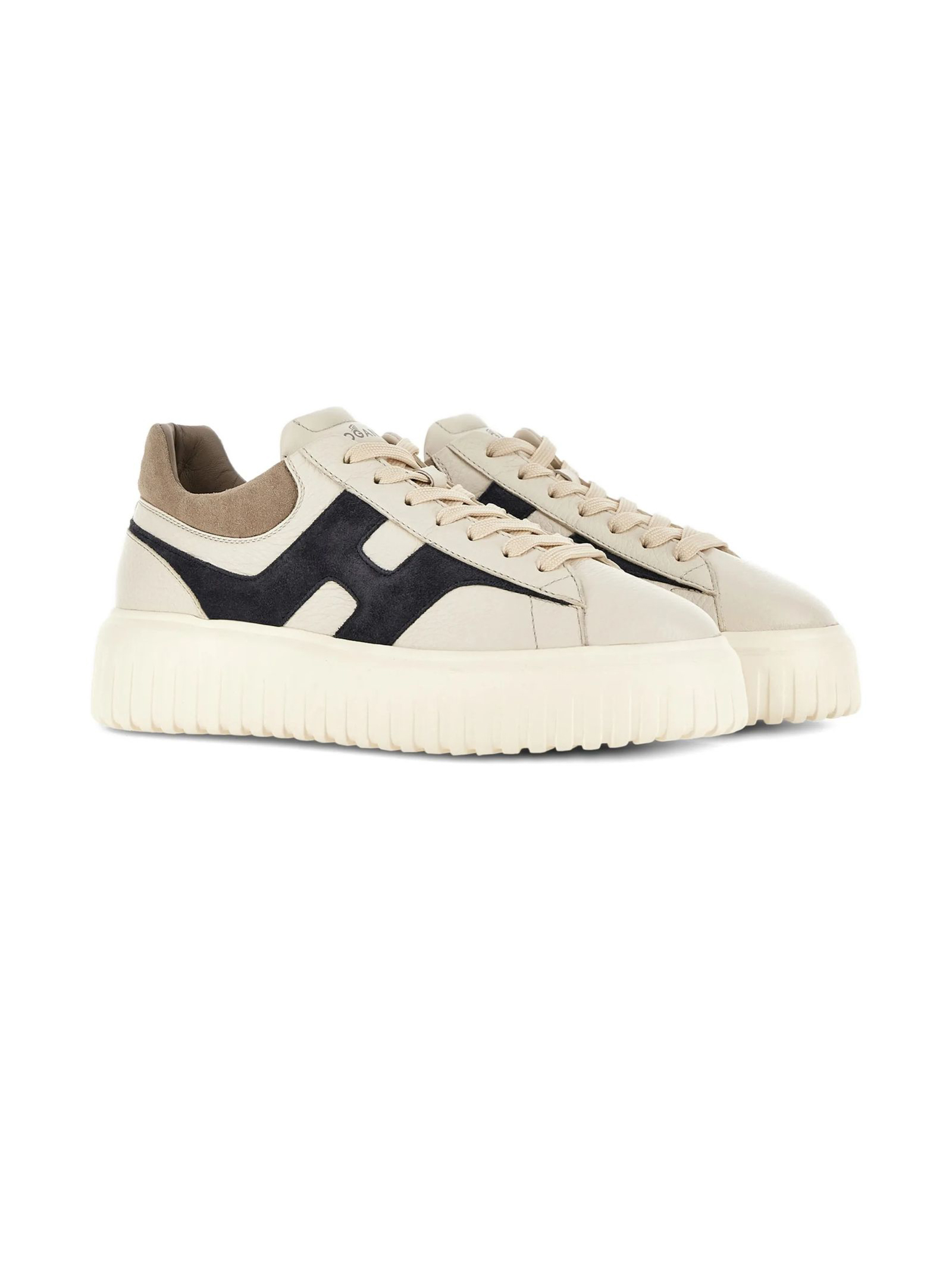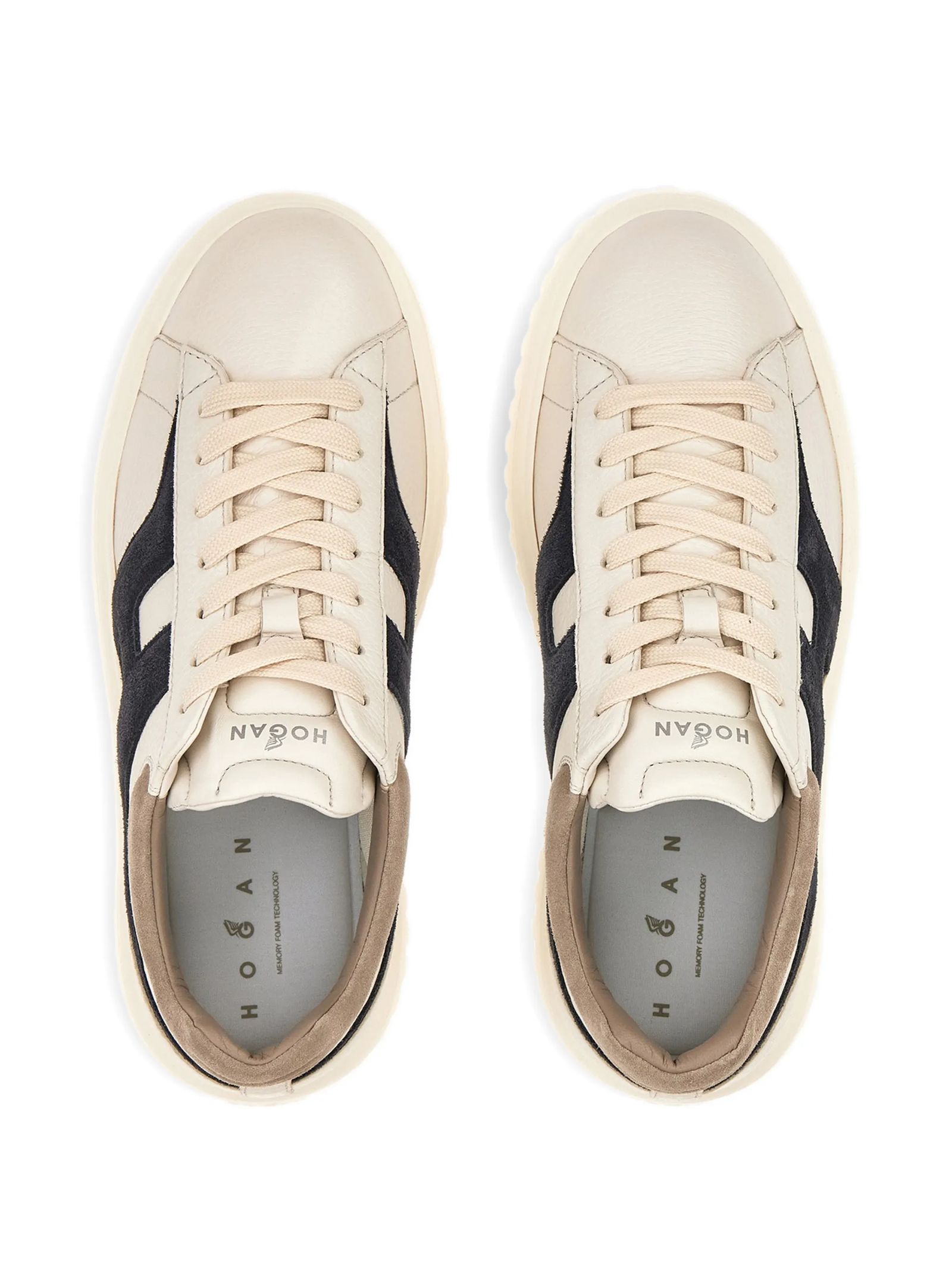 Hogan H-Stripes Sneakers in Blue, Ivory, and Beige, Leather upper, H logo on the side and suede inserts, Nappa leather details, 8 mm memory foam insole, EVA sole, Total height 4.8 cm