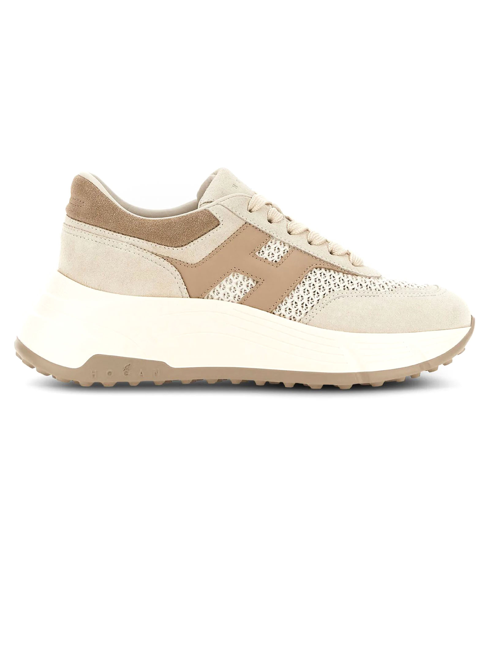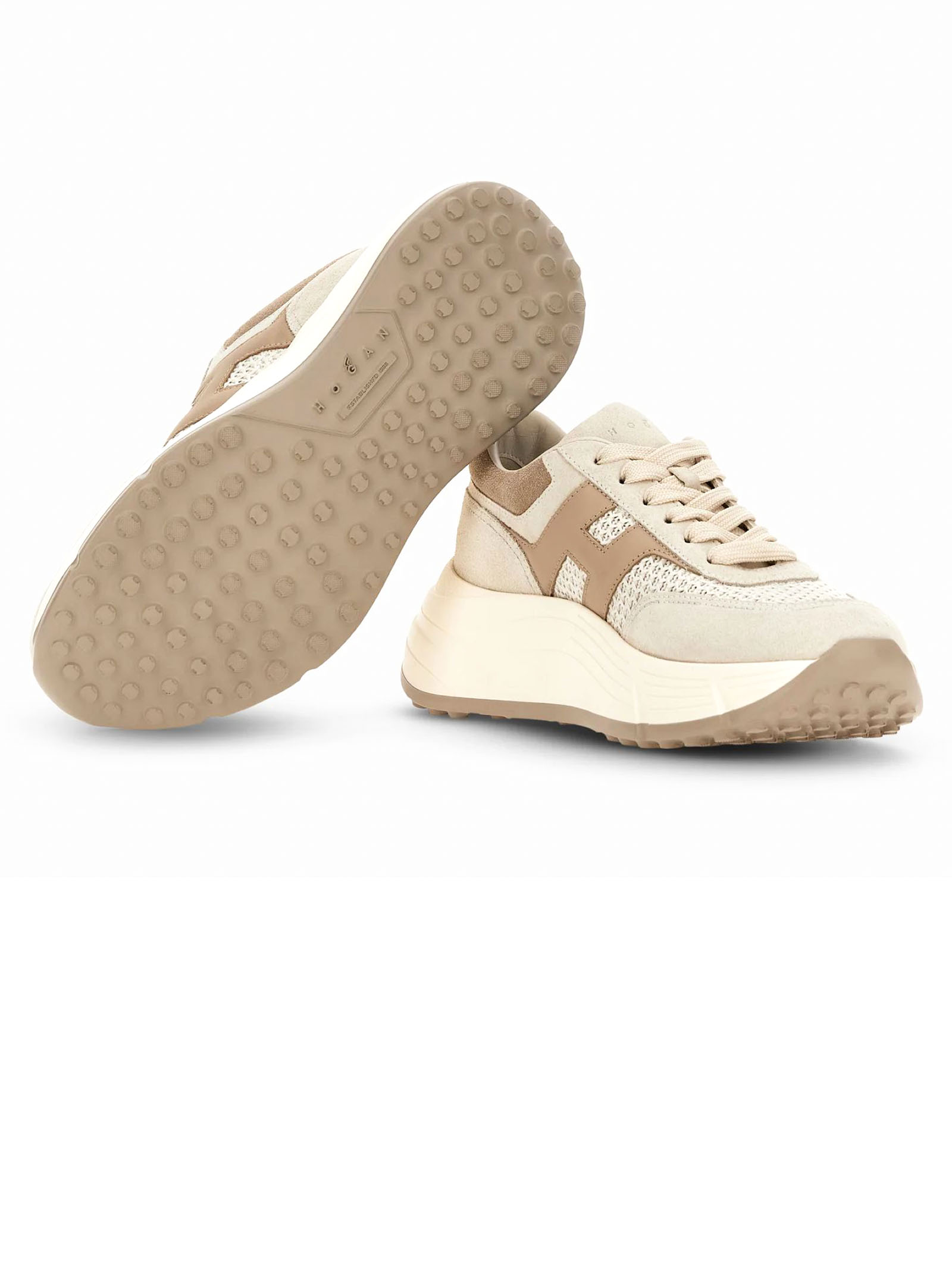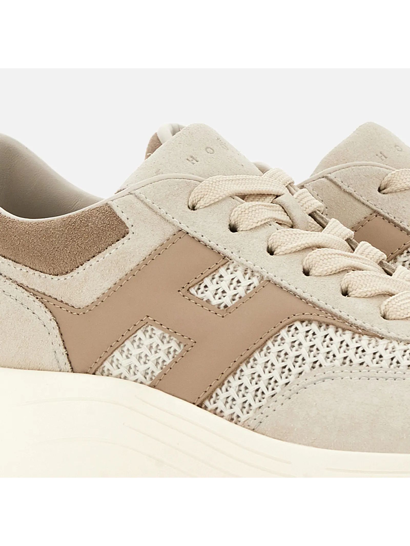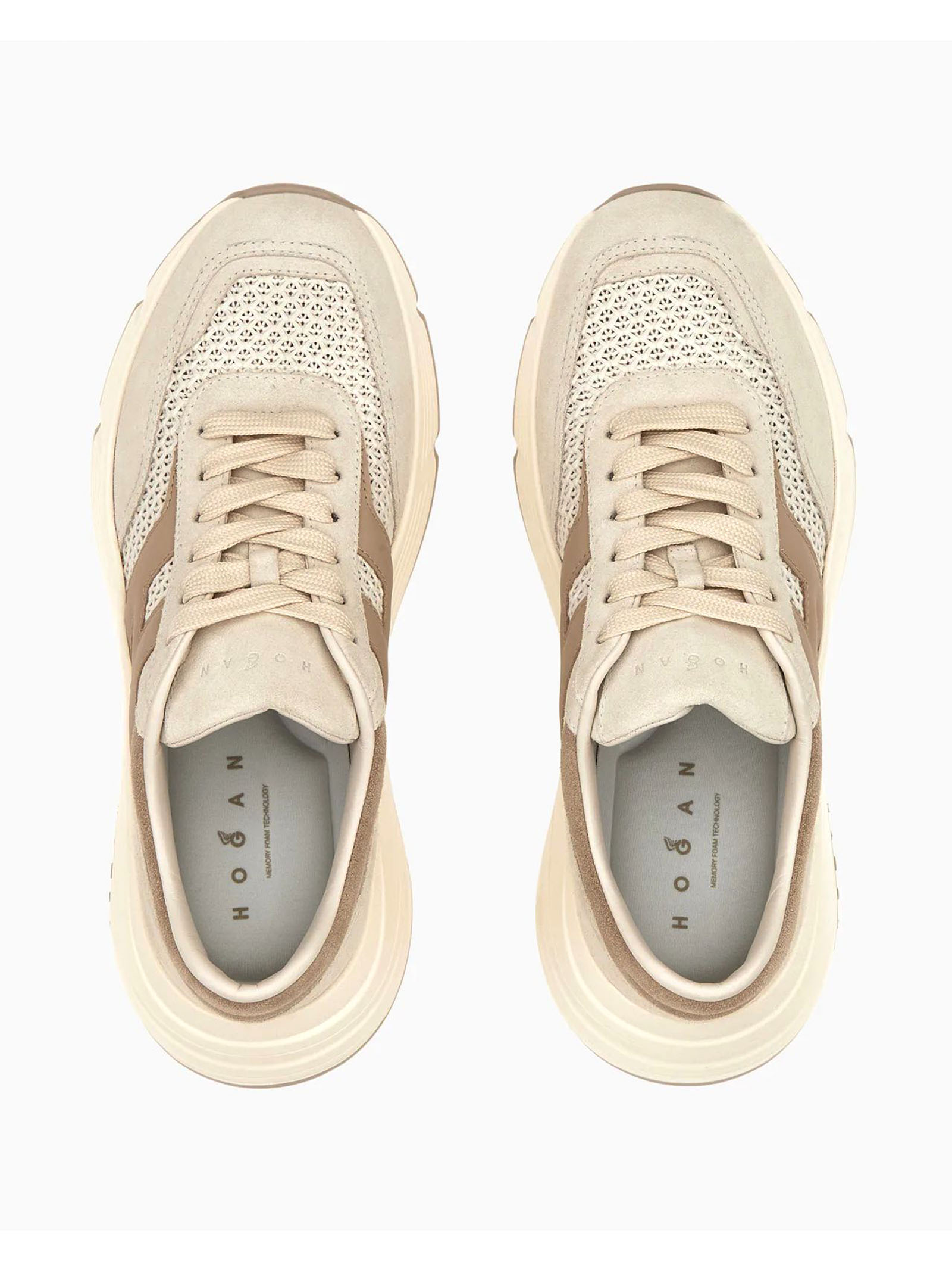 Hogan Hi-Fi Sneakers in Brown and Beige, suede and crochet fabric upper, smooth leather side panel, 8 mm memory foam insole, rubber outsole, total height 6.5 cm