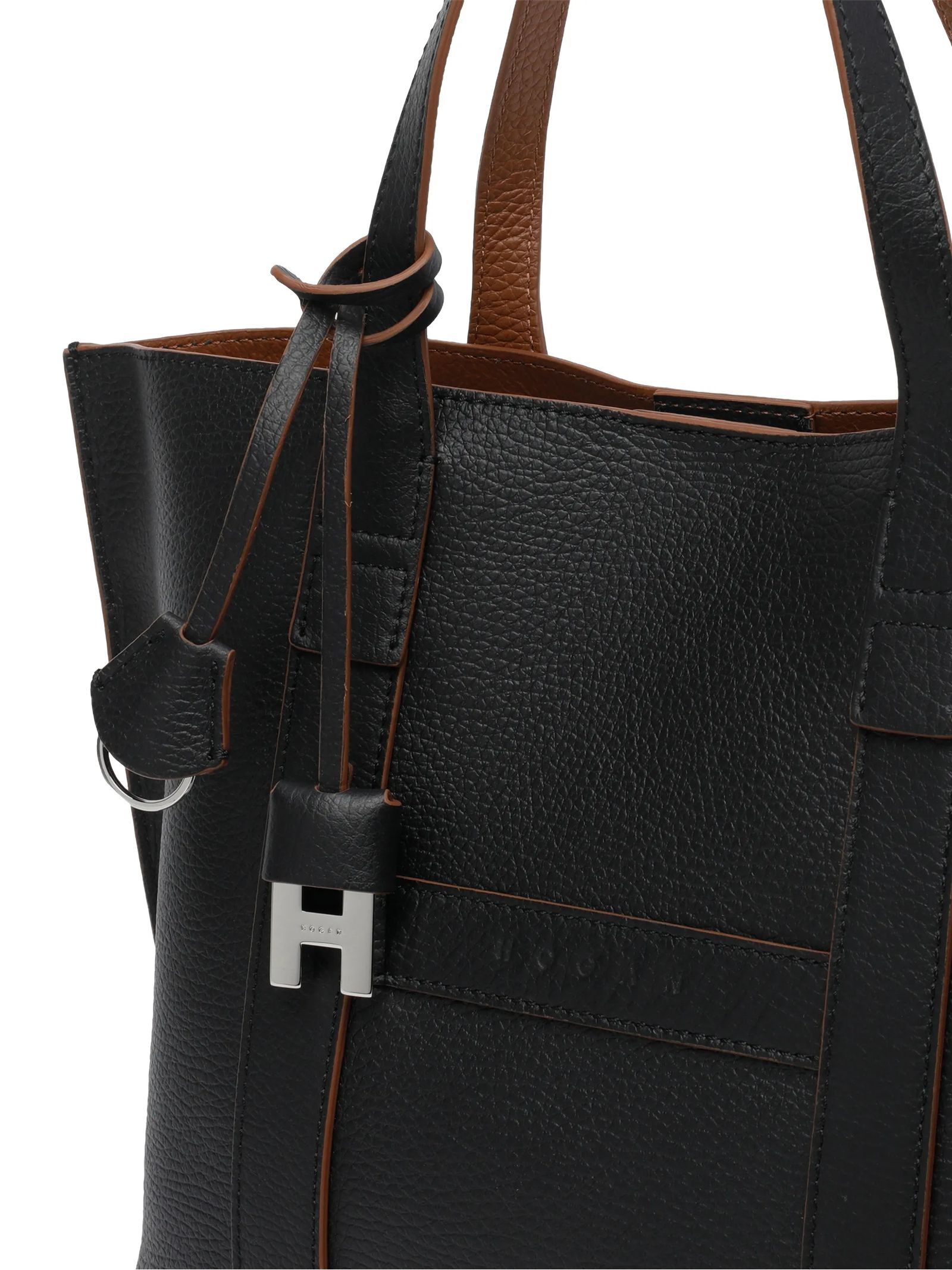 Hogan Script Shopping Bag Small Black, Item crafted in leather, Stamped Hogan logo, Dimensions: 35 x 23 x 11 cm, Fixed handles, Adjustable and removable shoulder strap, Magnetic button closure, Removable zipped pouch