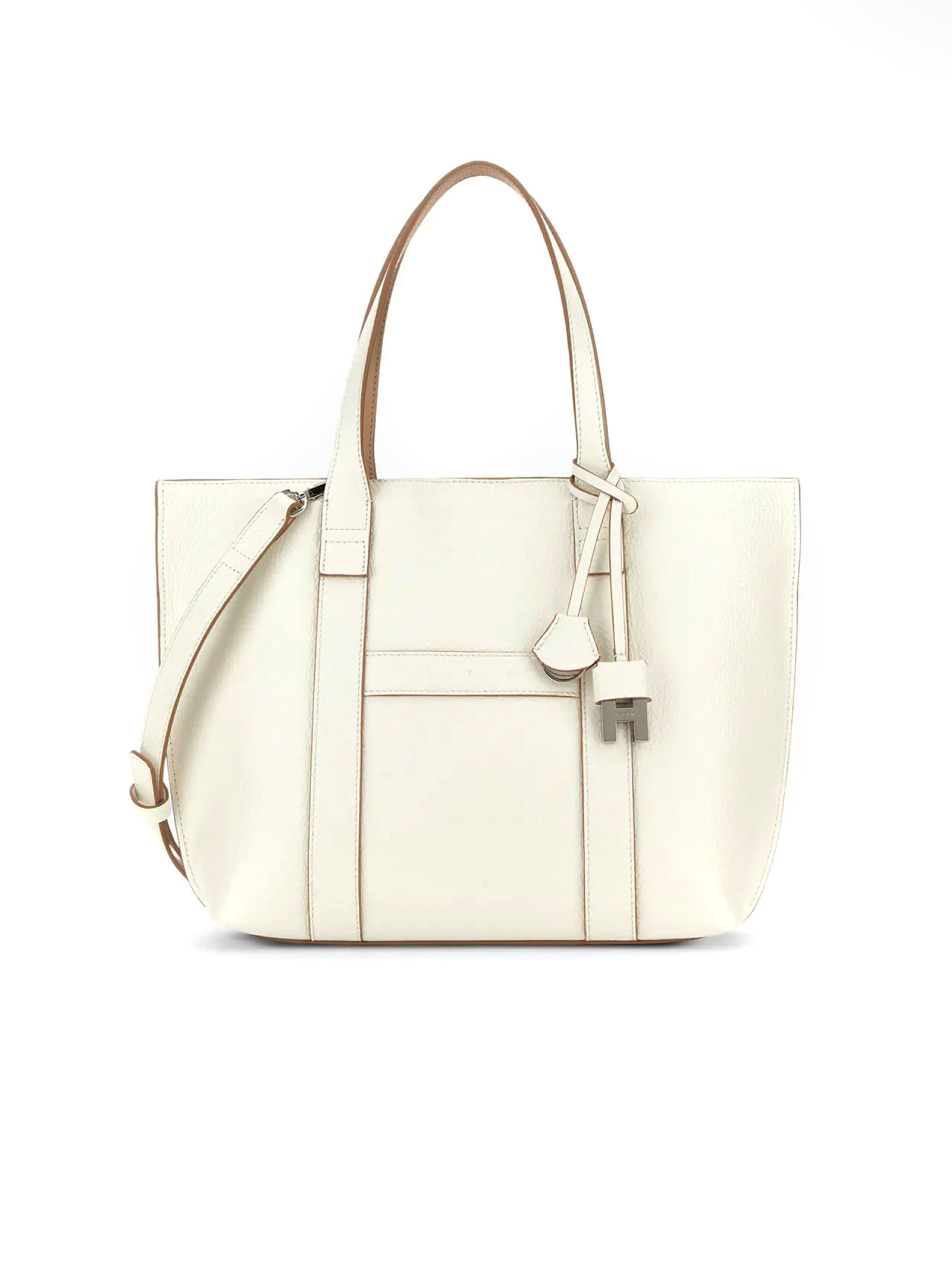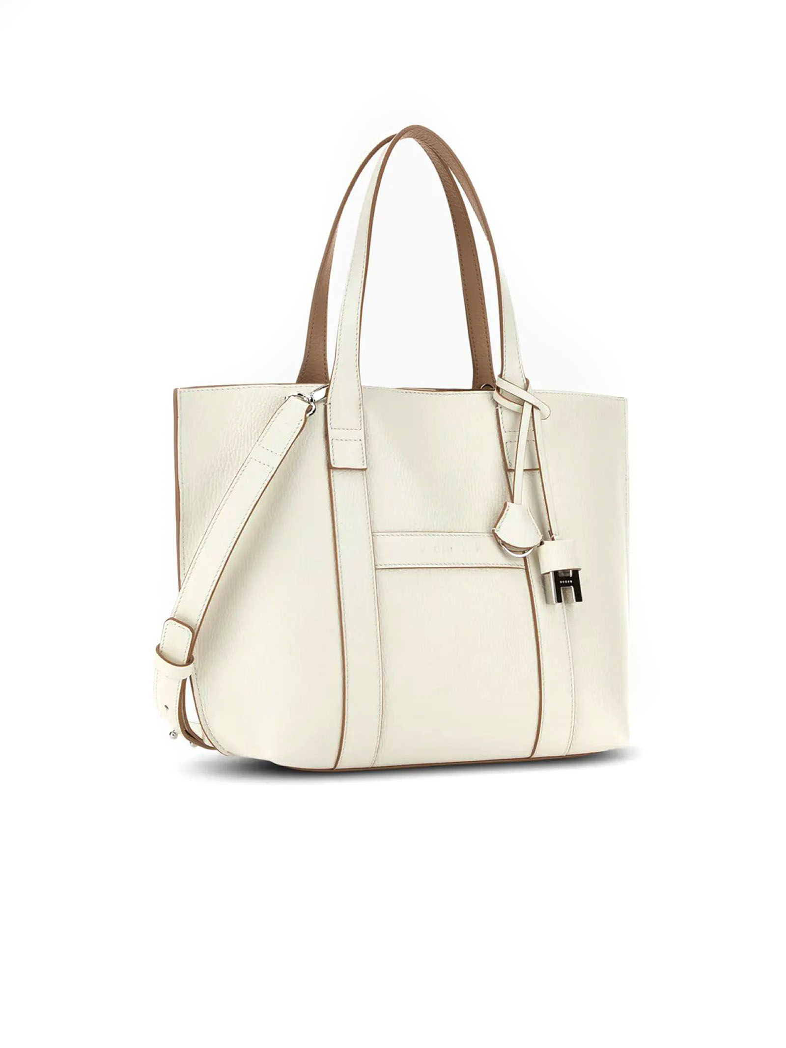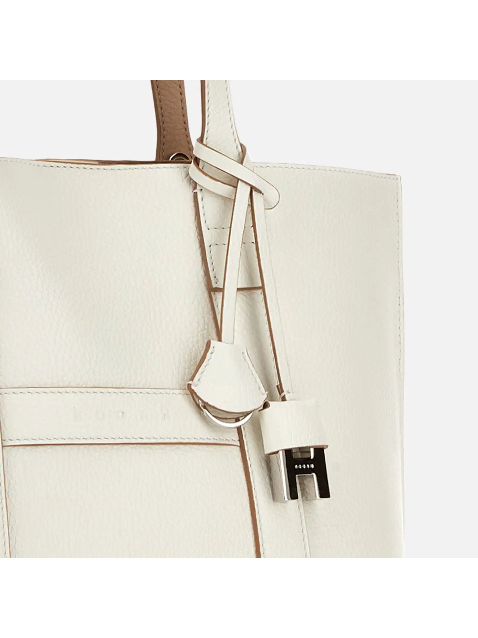 Hogan Script Shopping Bag Small Ivory, Item crafted in leather, Stamped Hogan logo, Dimensions: 35 x 23 x 11 cm, Fixed handles, Adjustable and removable shoulder strap, Magnetic button closure, Removable zipped pouch