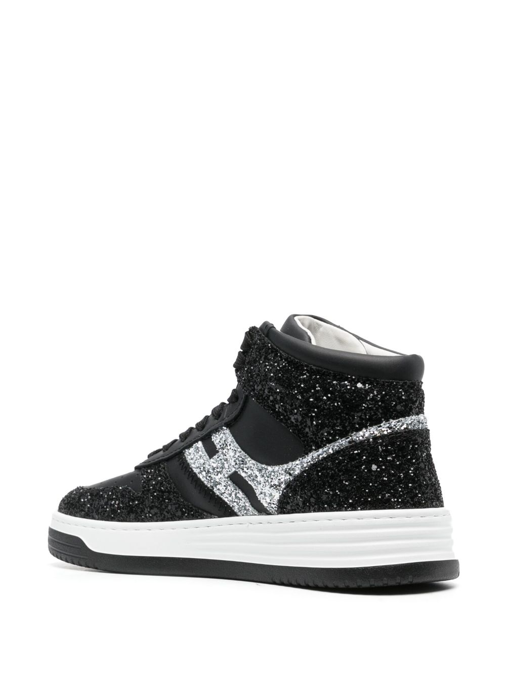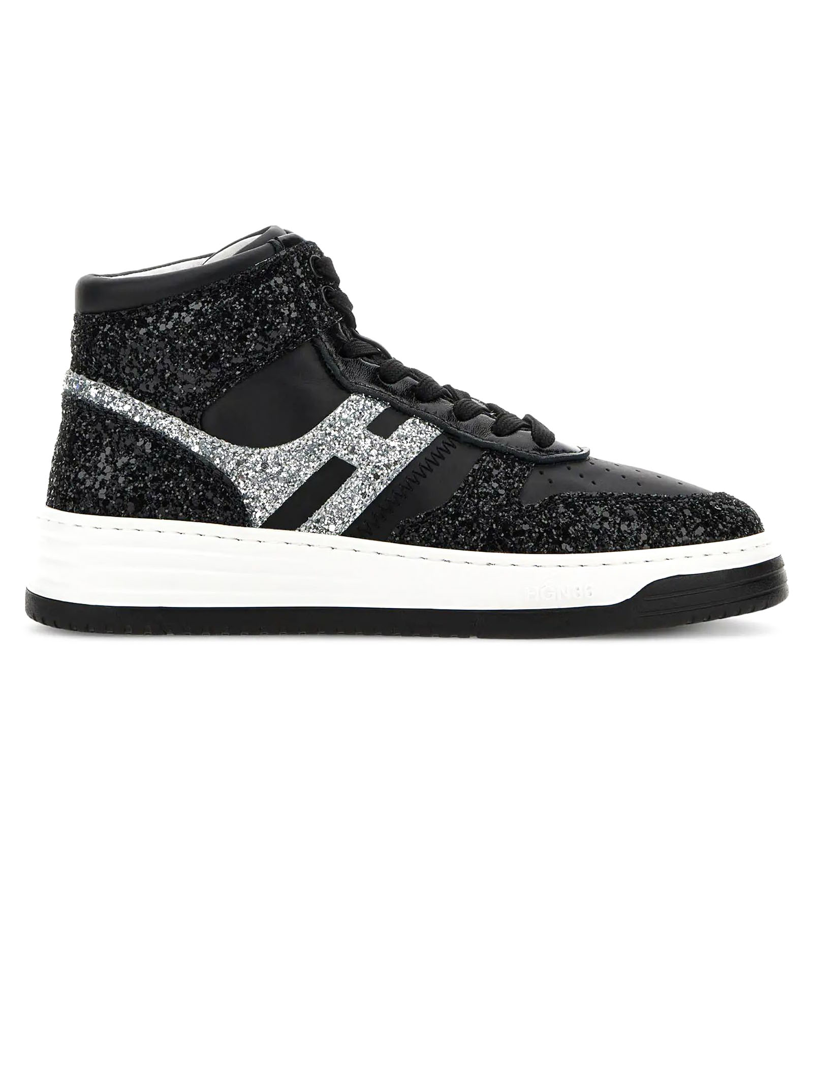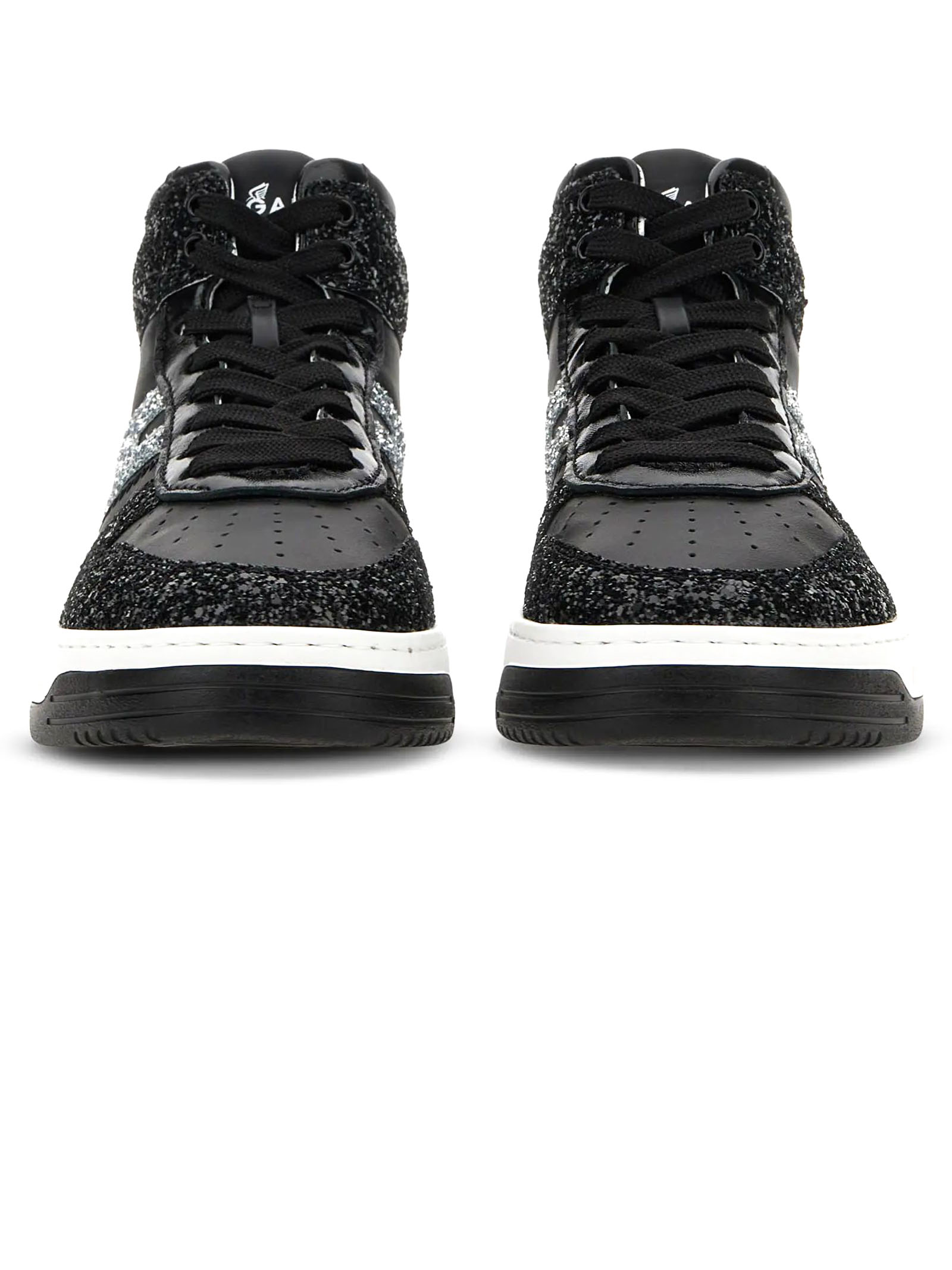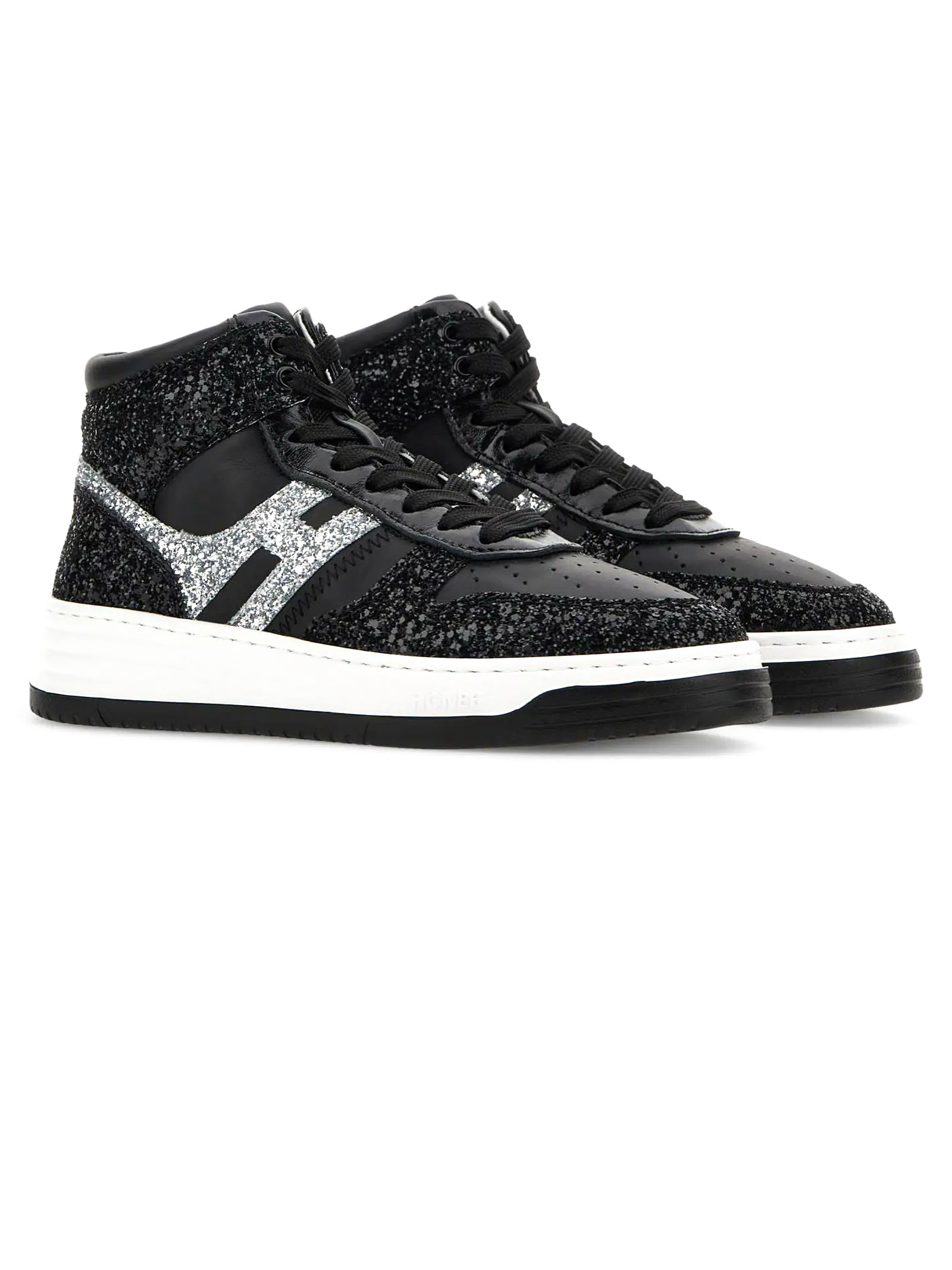 Sneakers High Top Hogan H630 Black Silver, Glitter fabric upper, Smooth leather inserts, Side H, Patent leather detailing, Memory foam insole 9 mm, Rubber outsole, Total height 4 cm