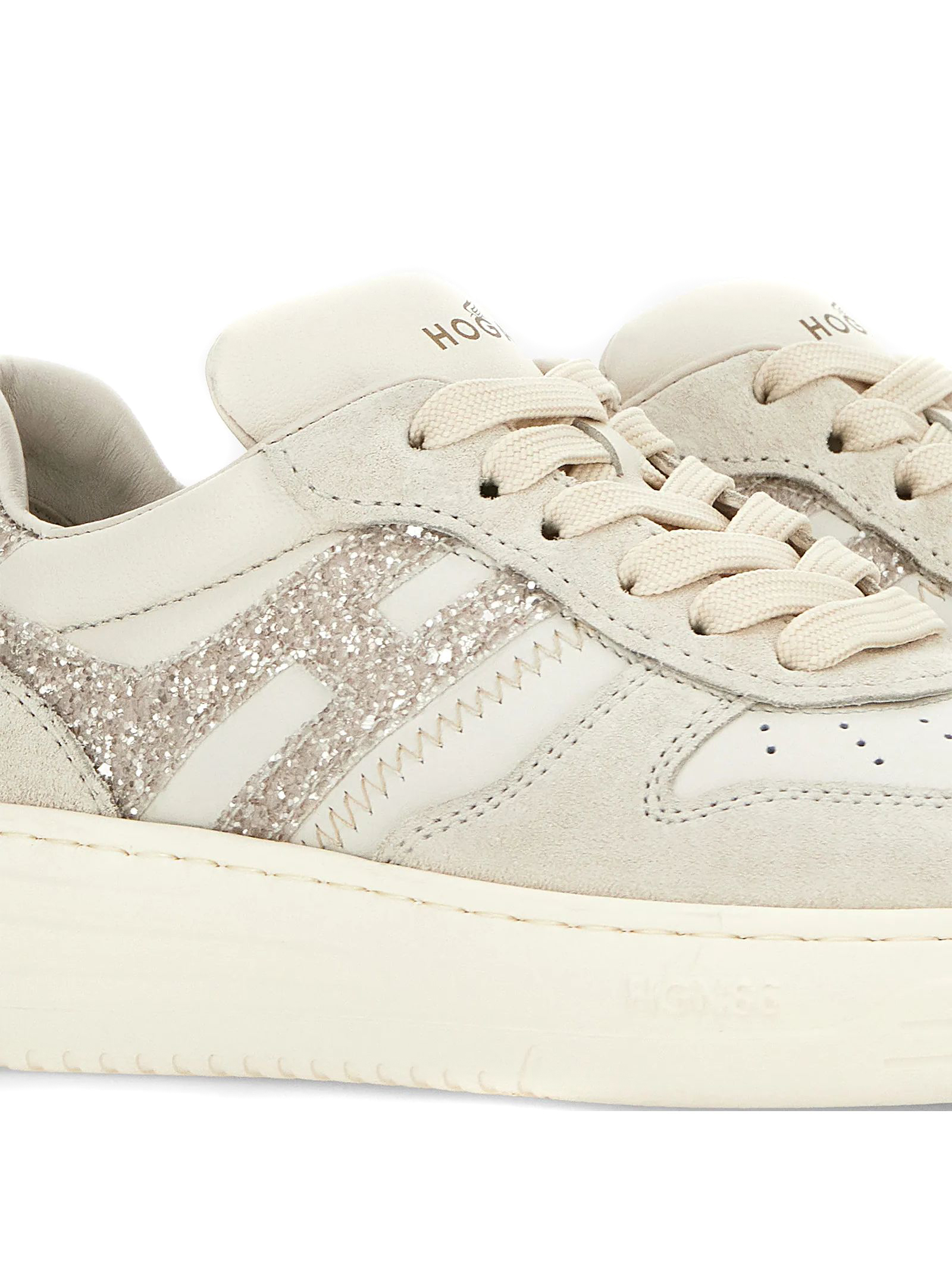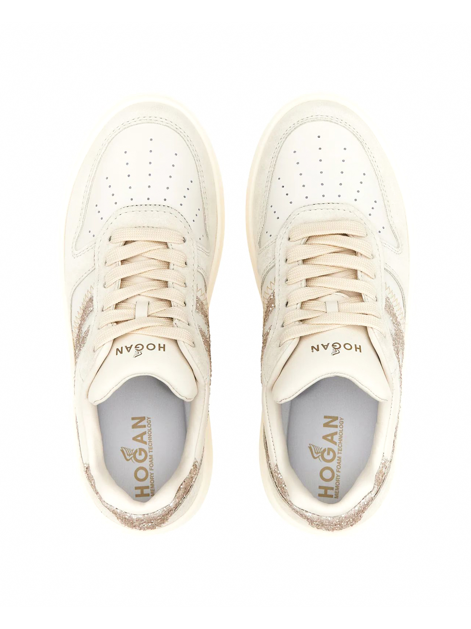 Sneakers Hogan H630 Ivory Gold, Suede upper, Smooth leather inserts, Side H and glittered fabric inserts, Nappa leather details, 9 mm memory foam insole, Rubber sole, Total height 4 cm