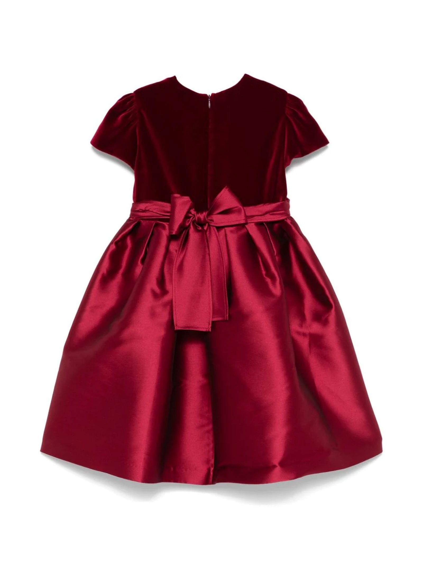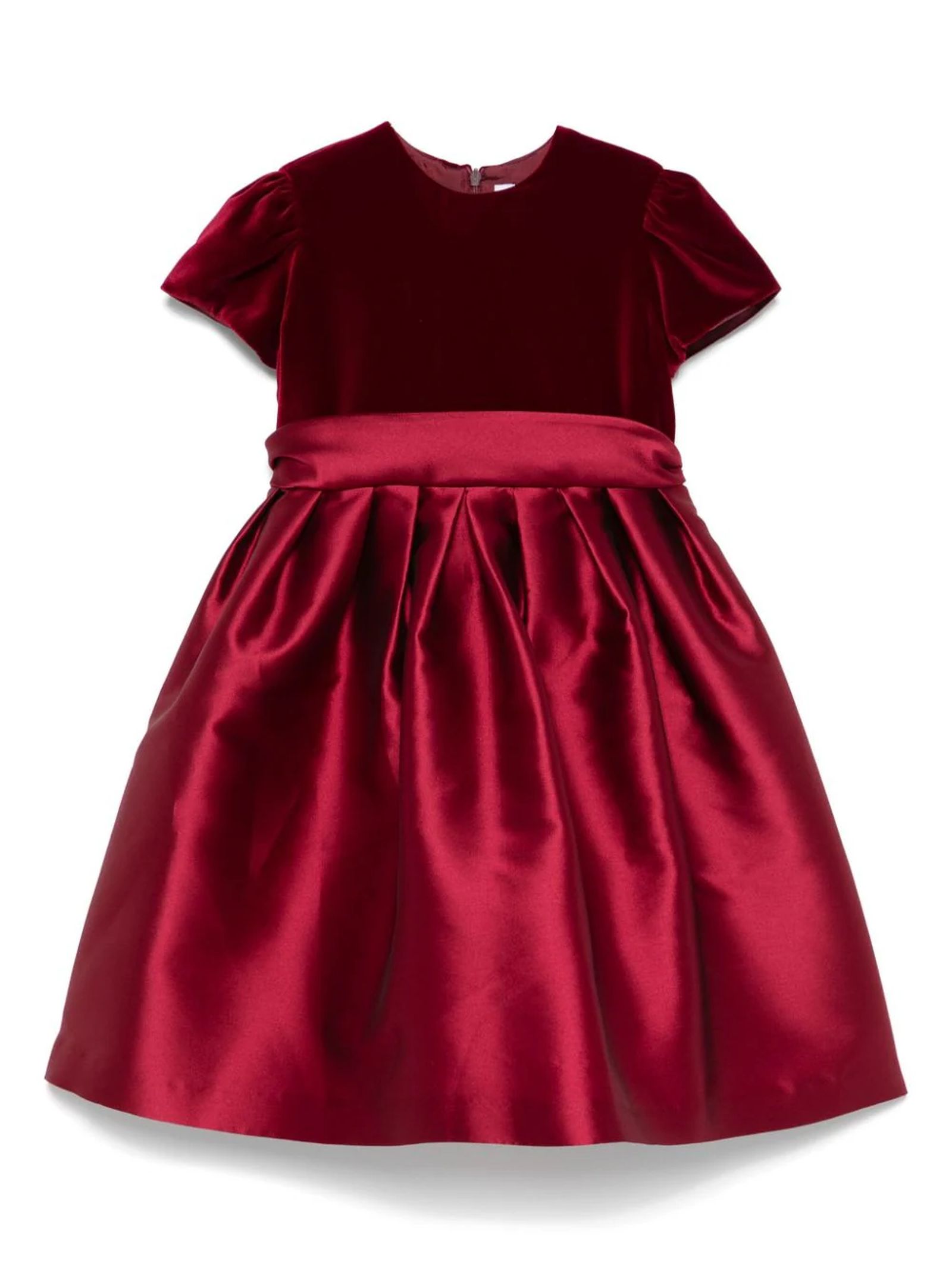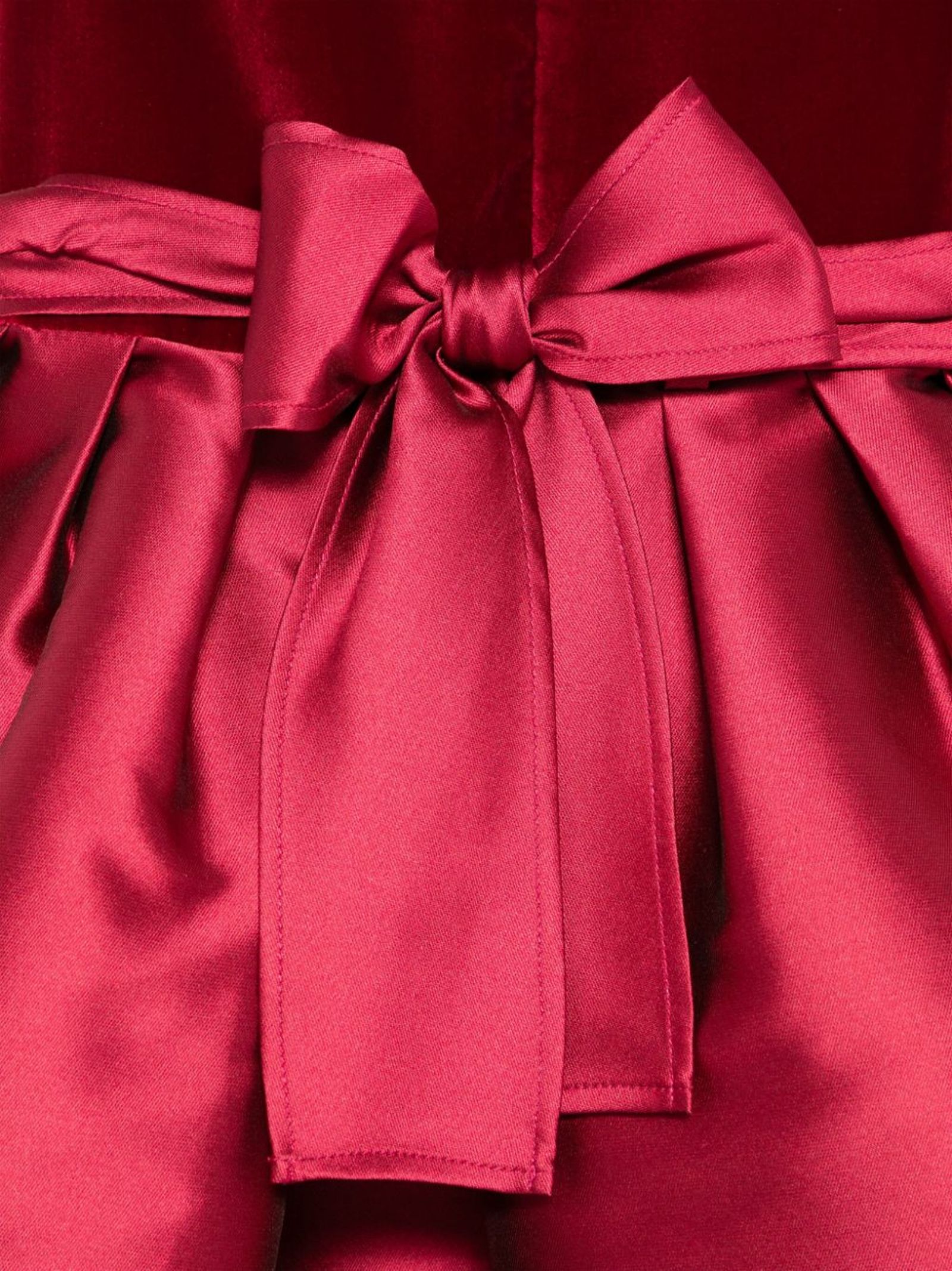 red polyester dressvelvetsatin finishinsert designhidden zip back closurechokershort balloon sleevesbow detailmodel with beltflared skirtfull liningstraight hem