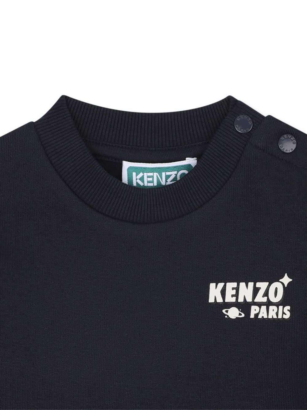 navy blue front logo print tiger print at the back crew neck snap button detail on the shoulder