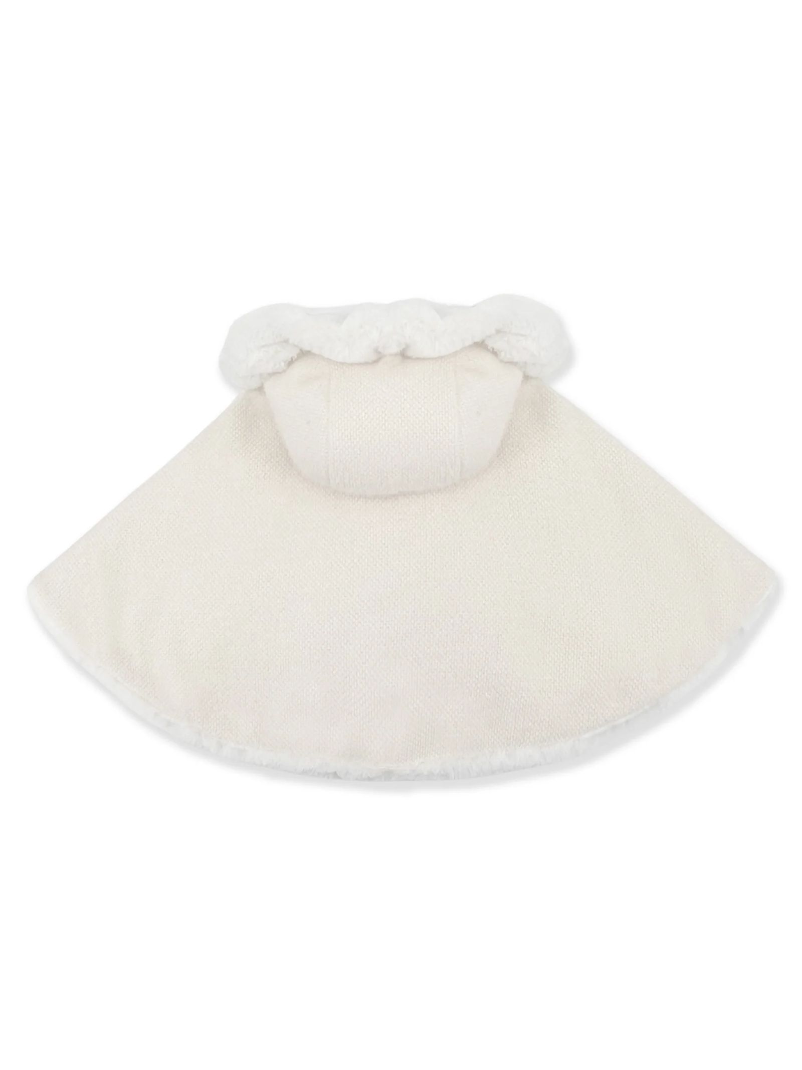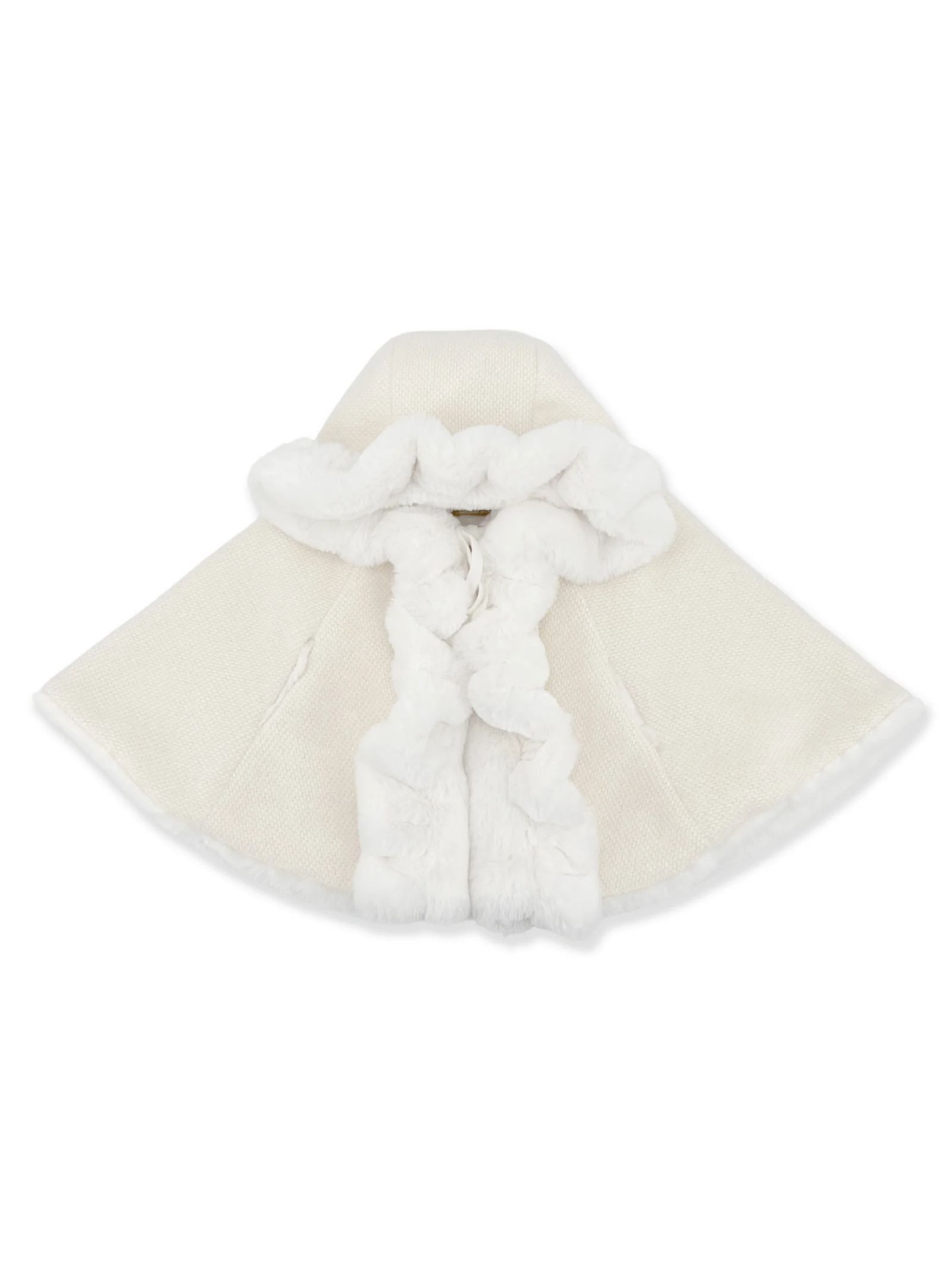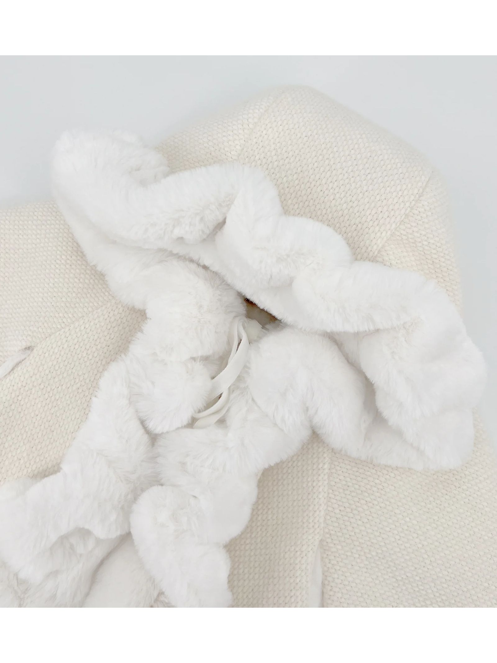 Soft cream white mantel with eco-fur profiles and lining, with armholes and ribbon around the neck