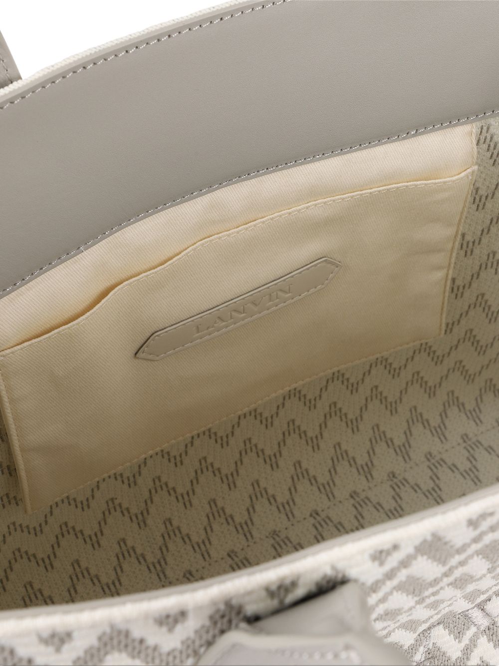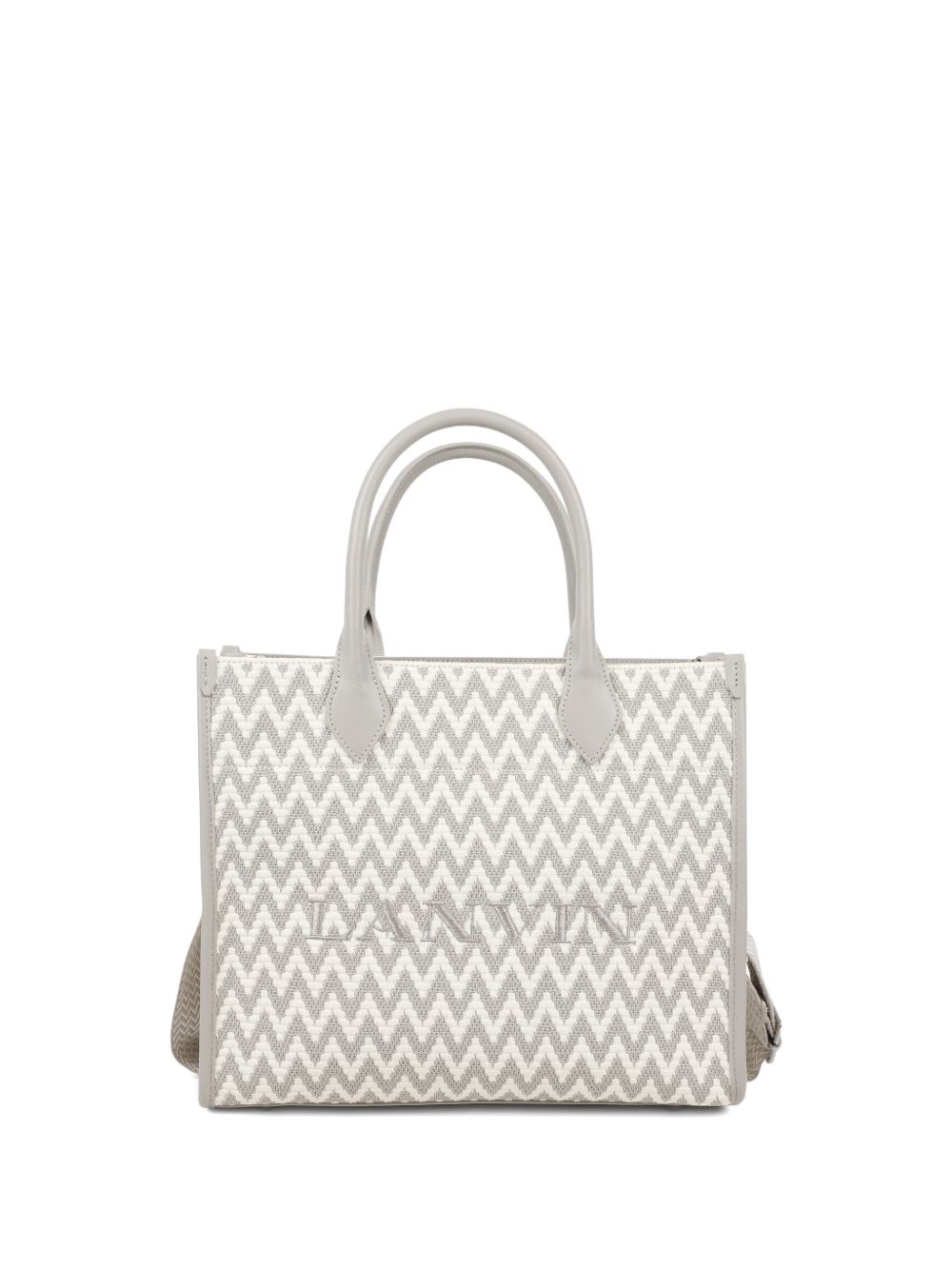 light grey zigzag pattern embroidered logo top handles detachable shoulder strap internal slip pocket