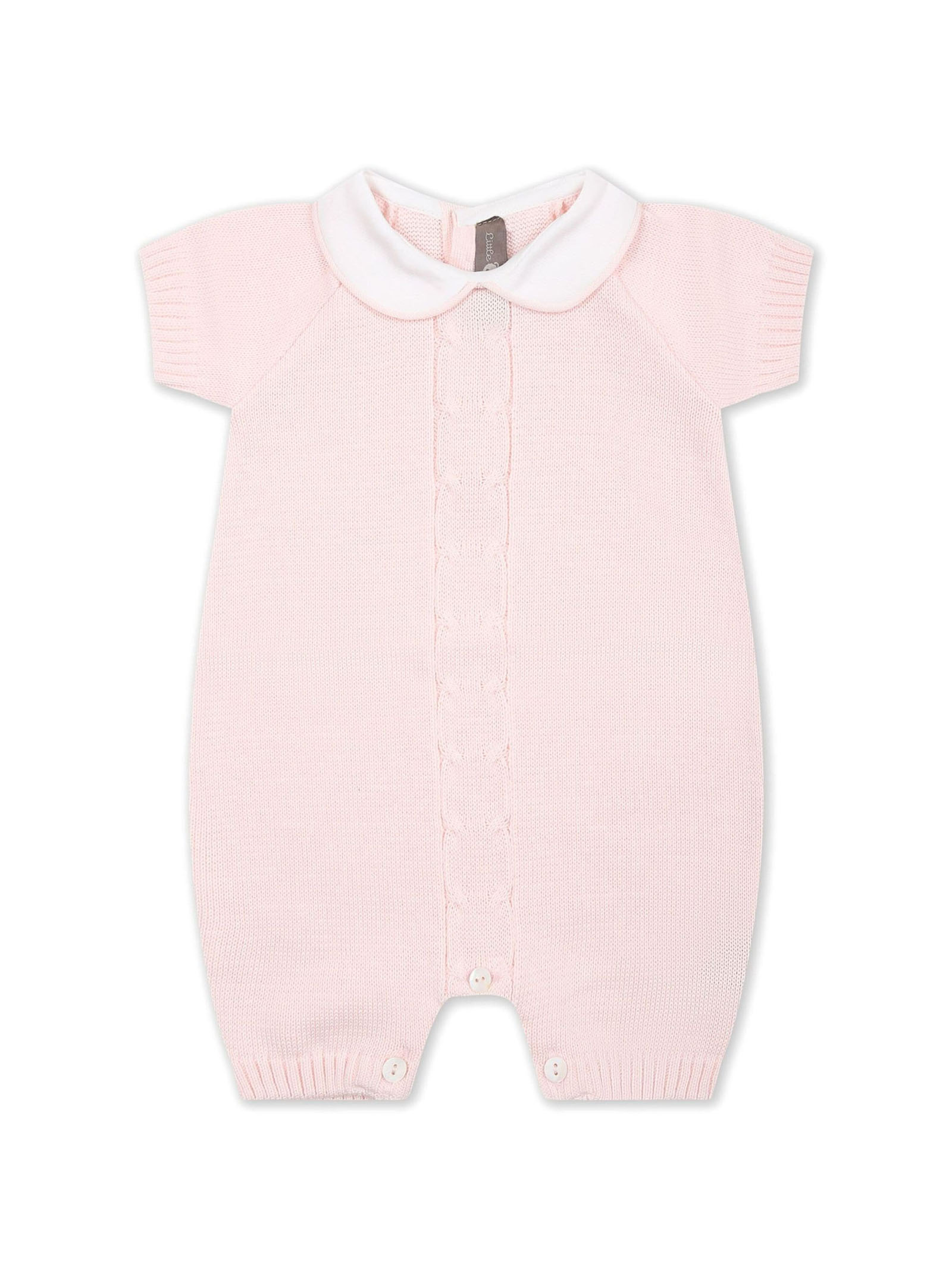 Light pink cotton romper, fine knit, cable knit, Peter Pan collar, short sleeves, rear button fastening, ribbed trim
