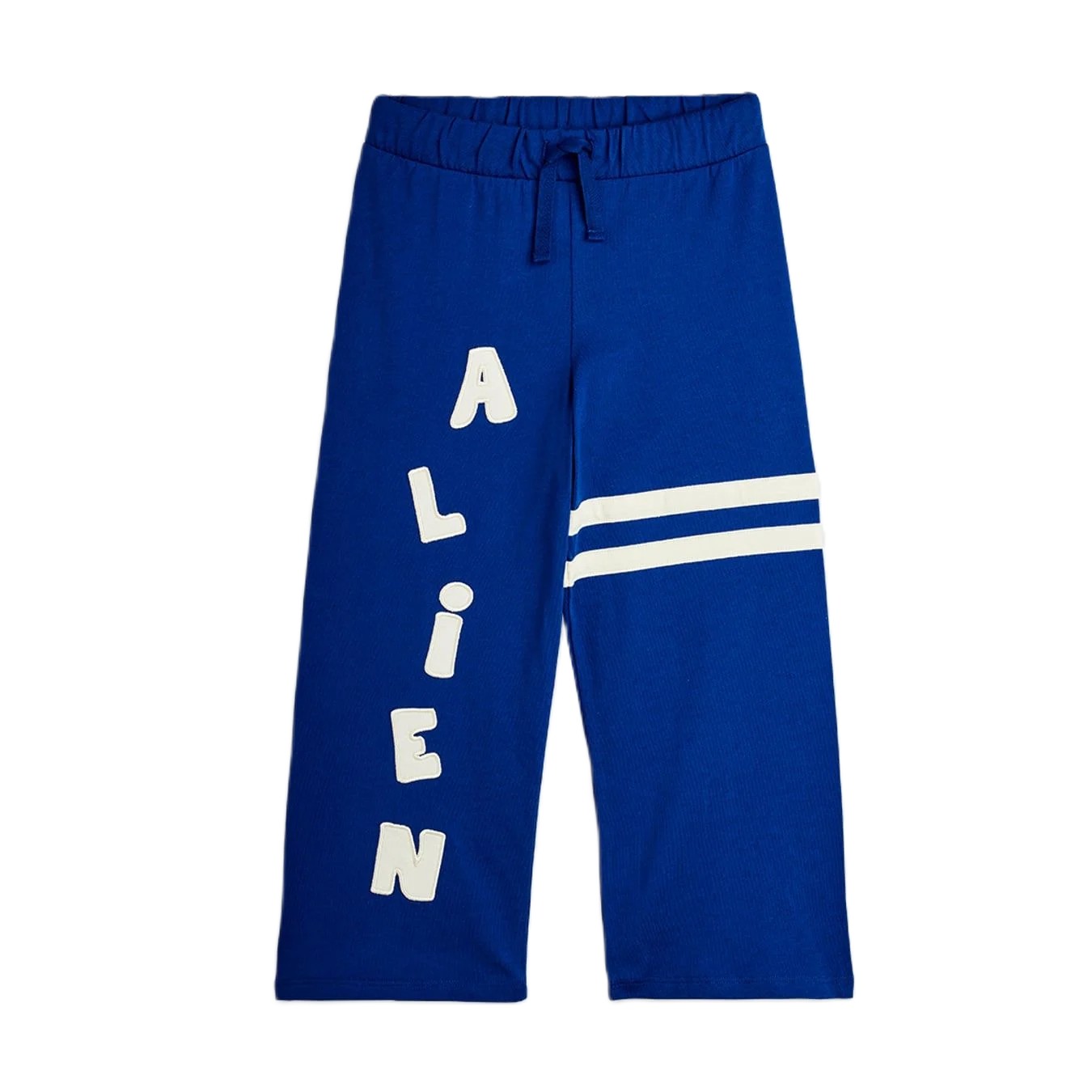 Trousers made from 100% organic cotton. Designed with a comfy elastic waistband and drawstring, appliqué ALIEN lettering down one leg and contrast stripes on the other.