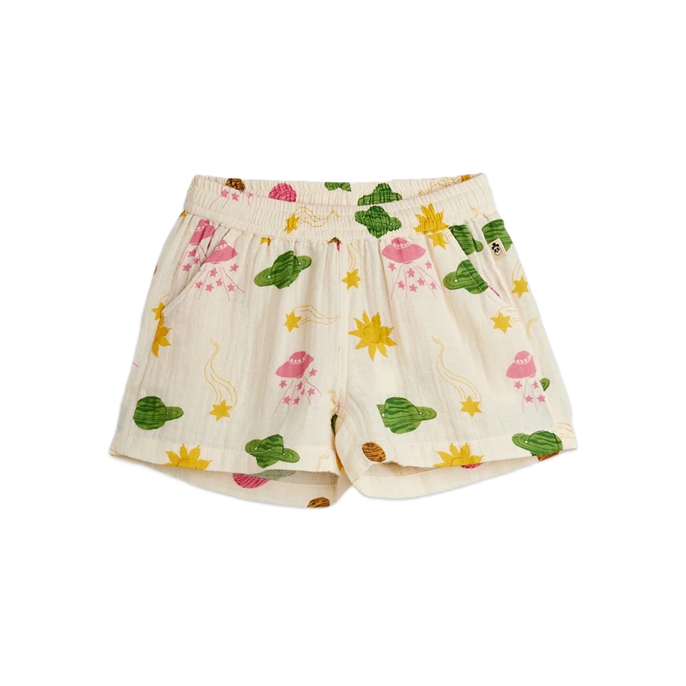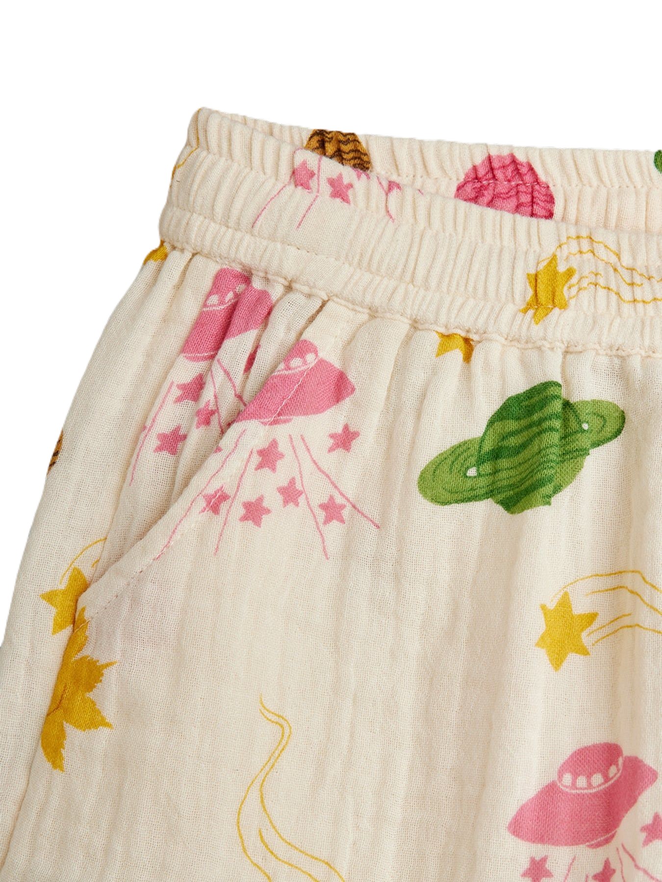 Shorts in soft muslin made from 100% organic cotton, featuring the Space print. Designed with an elastic waistband and side pockets. Lightweight and breathable for warm days.