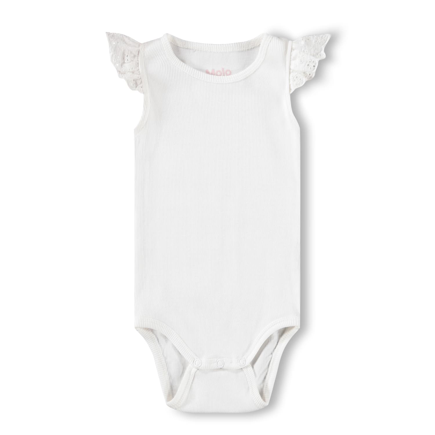 White bodysuit for the little ones made of soft, organic cotton rib. The bodysuit has small broderie anglaise ruffle sleeves and snap buttons between the legs, making it easy to put on and take off.