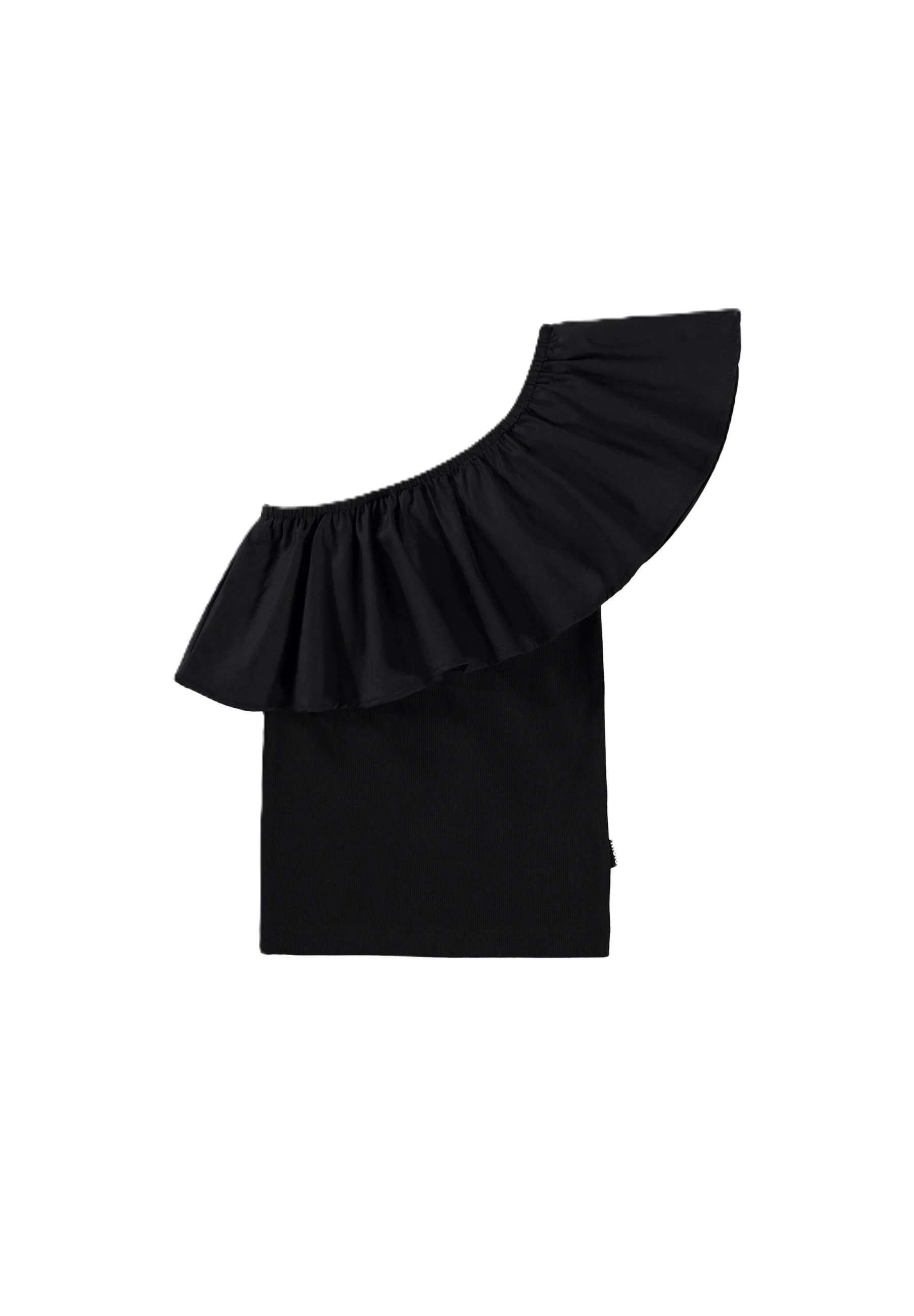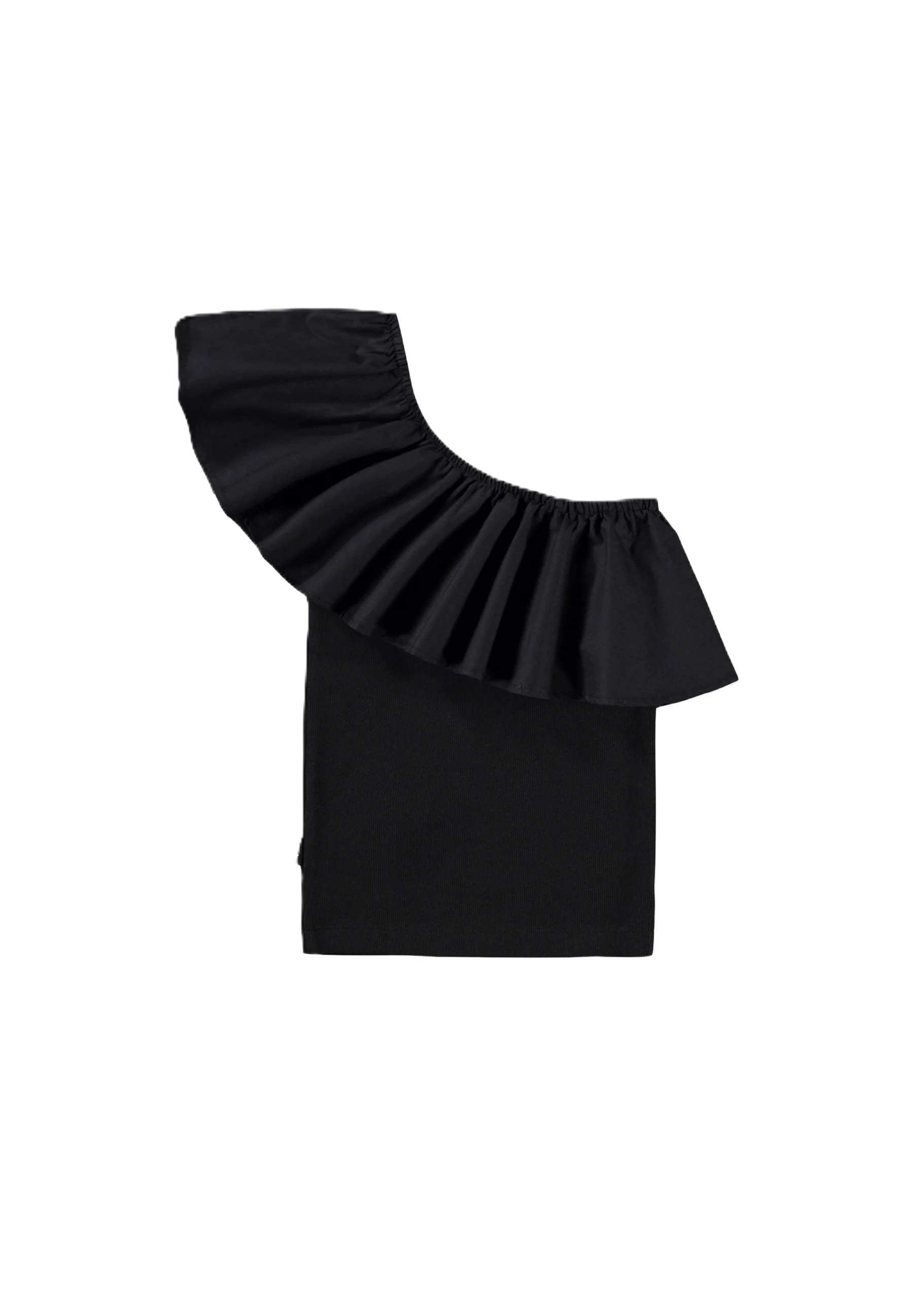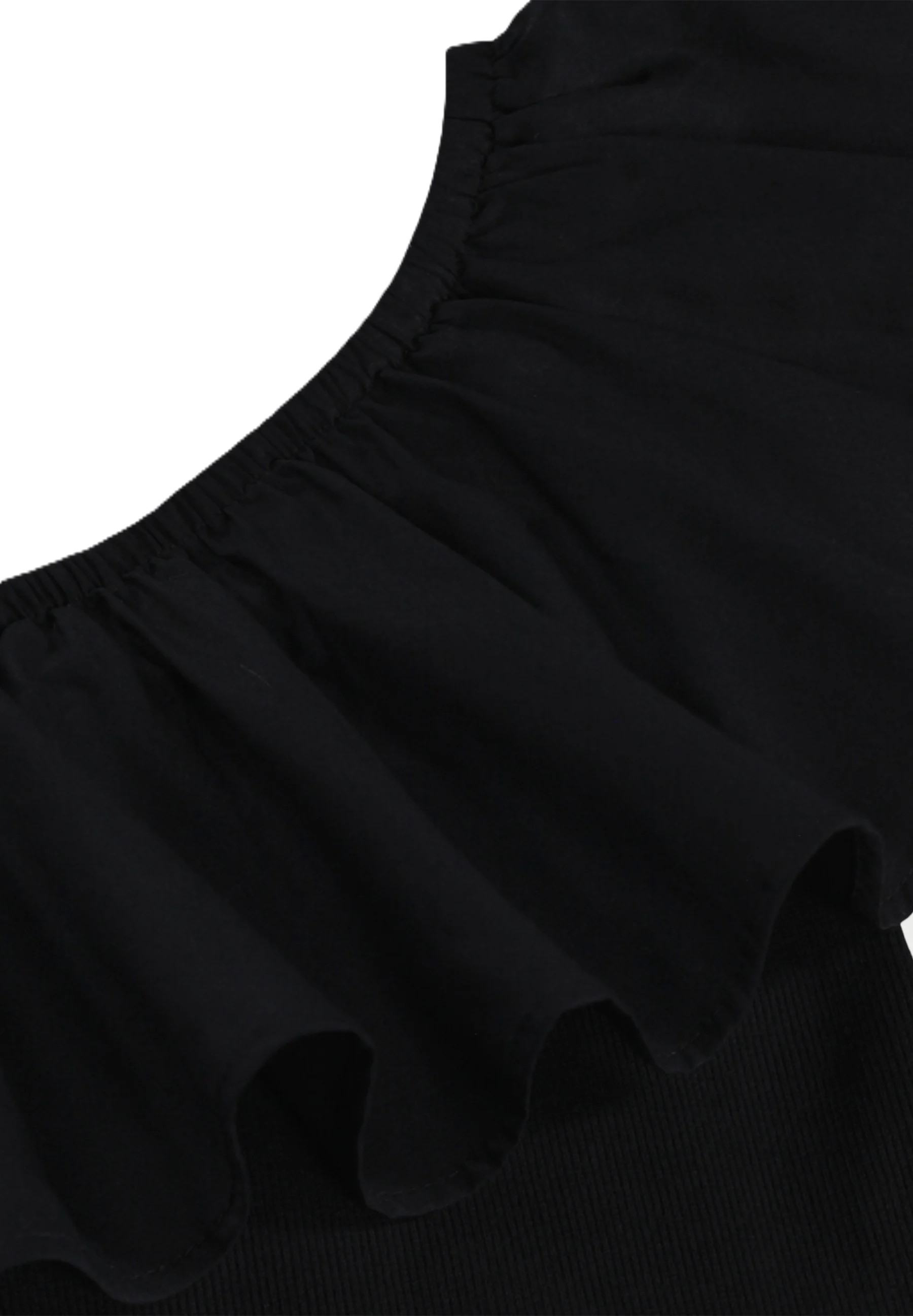 Black one-shoulder top made of organic cotton jersey with a close-fit and a wide poplin ruffle that runs over the shoulder and around the back.