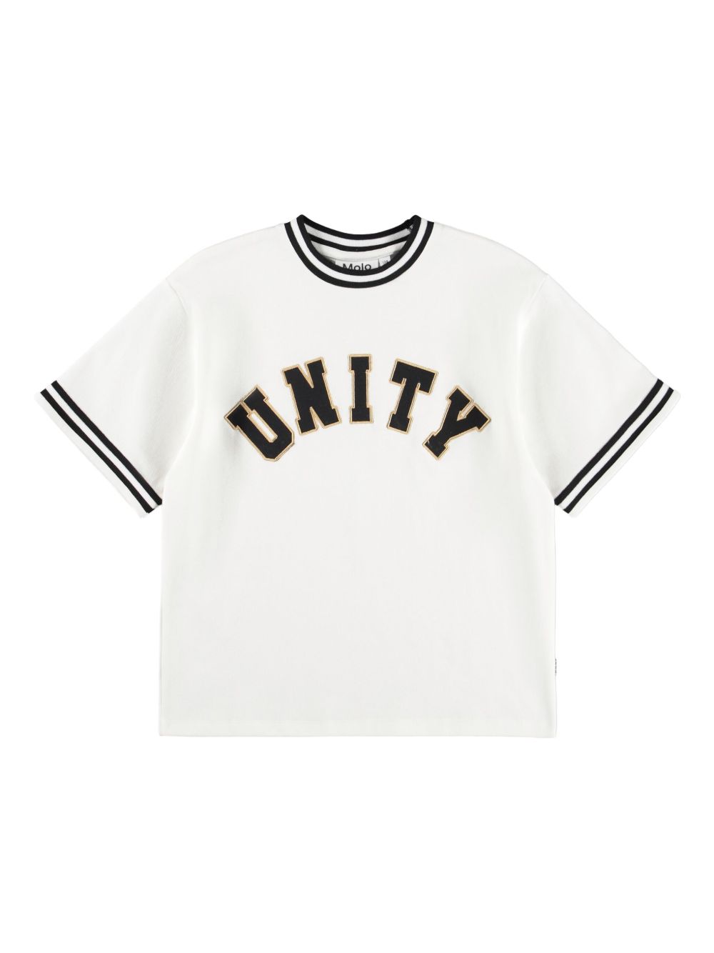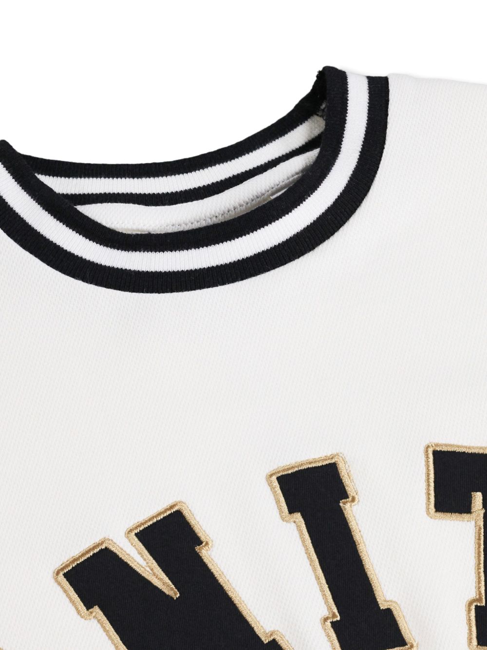 white embroidered lettering contrasting trim short sleeves ribbed crew neck
